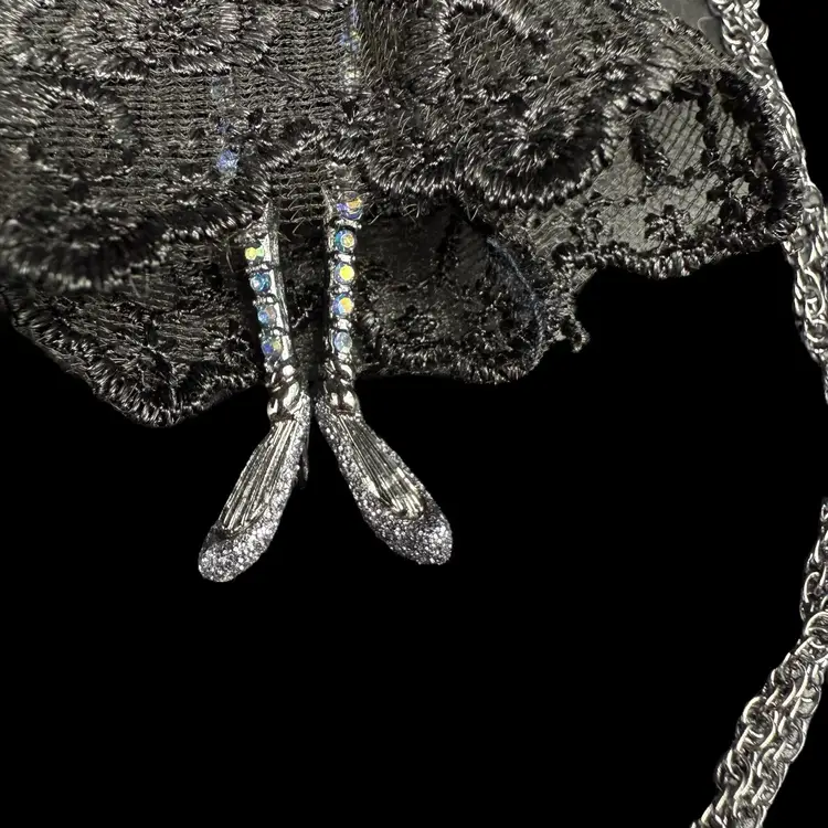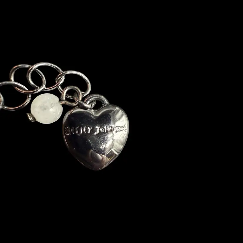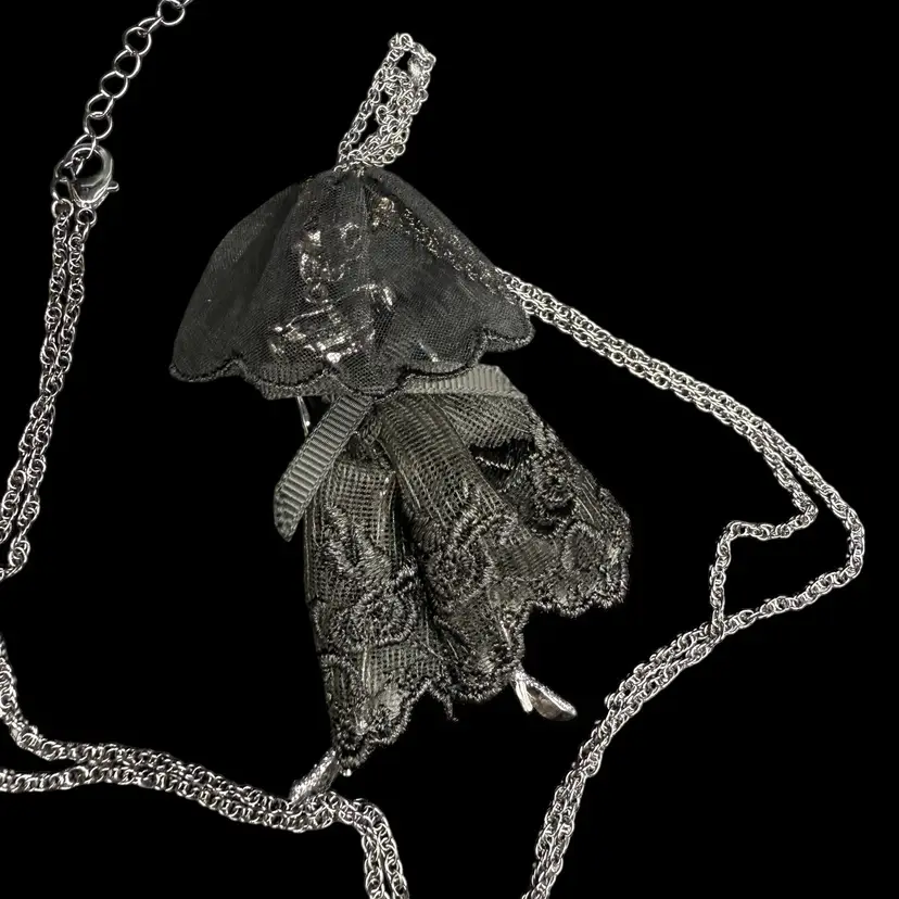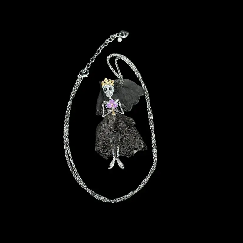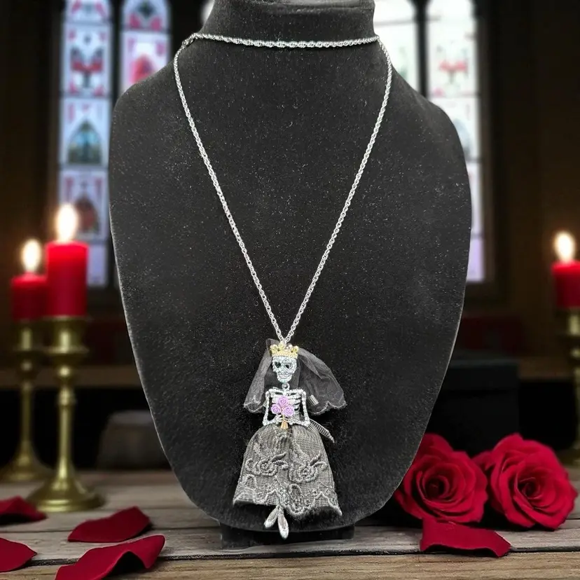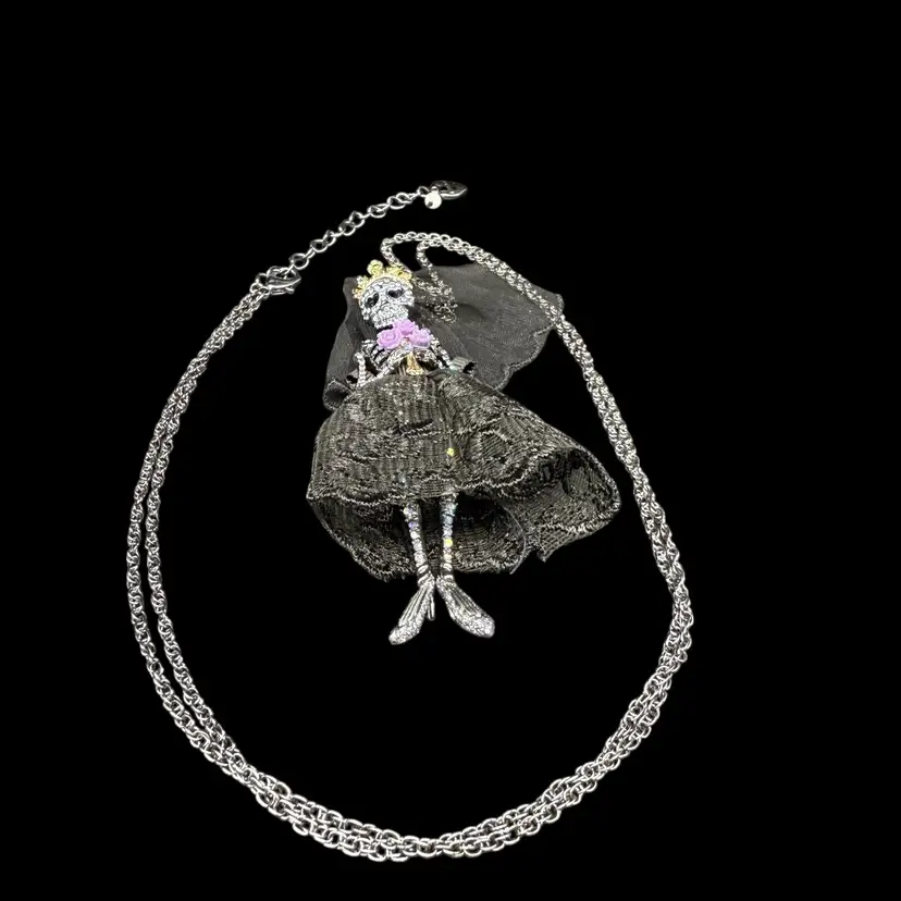 The Betsey Johnson Skeleton Bride Goth Crystal Day of the Dead Halloween Necklace is a captivating and whimsical piece of jewelry. Made with enamel, and crystal rhinestones, the pendant features a skeleton shape with multicolor crystals, dressed in a black skirt & veil. The necklace is signed and has a lobster closure. With a length of 38 inches and a hematite tone rope chain, this pendant exudes a gothic and magical theme that is perfect for Halloween or Day of the Dead celebrations.