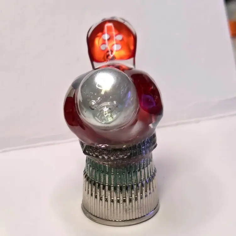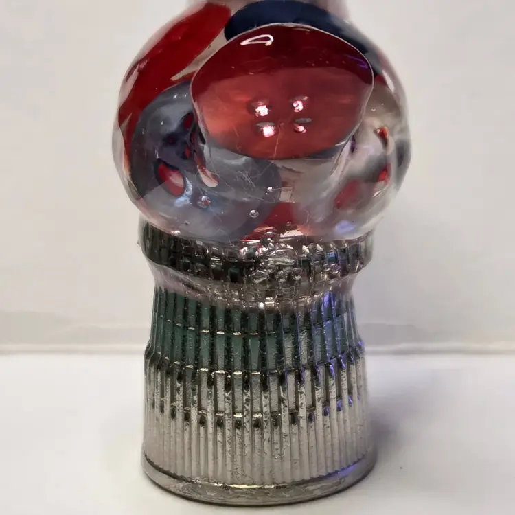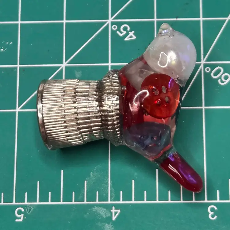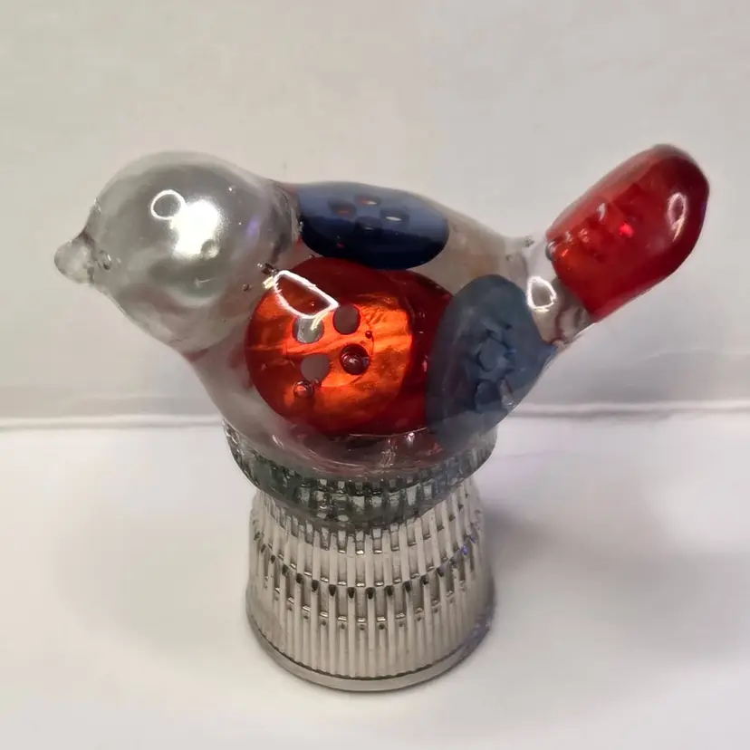 This gal is made with an iridescent tiny bead beak, a pearl bead head from a necklace, and red, white and blue pearly buttons for her body and tail. She is celebrating our nation's 250th and love of sewing and is named after Betsy Ross who did sew flags for the U.S. Government.