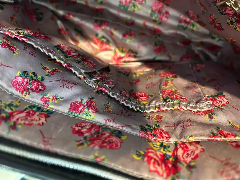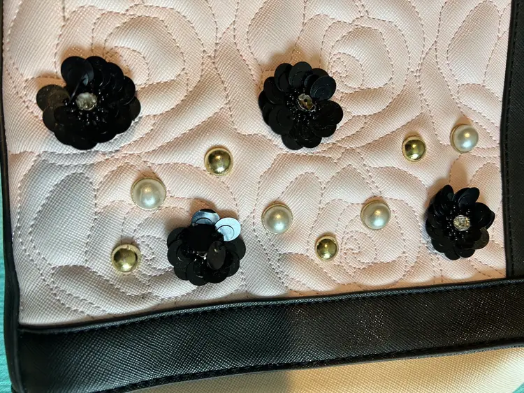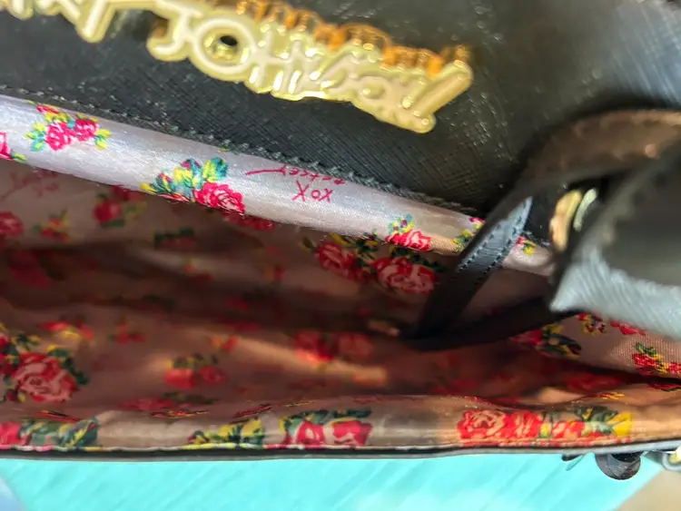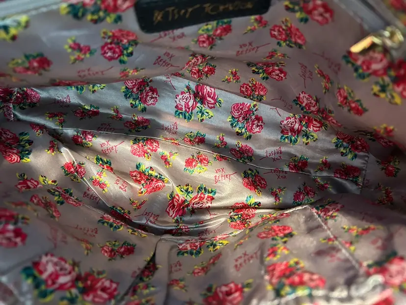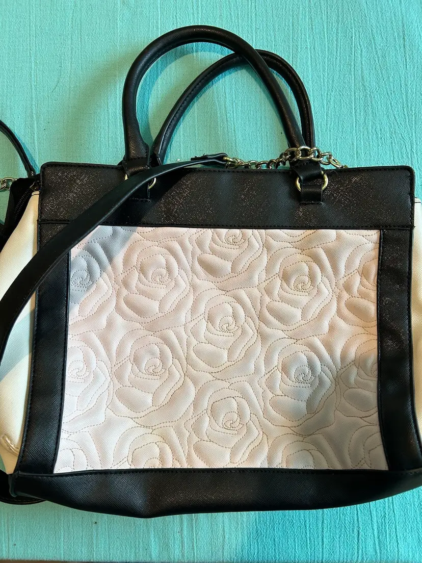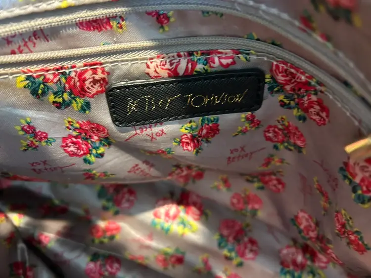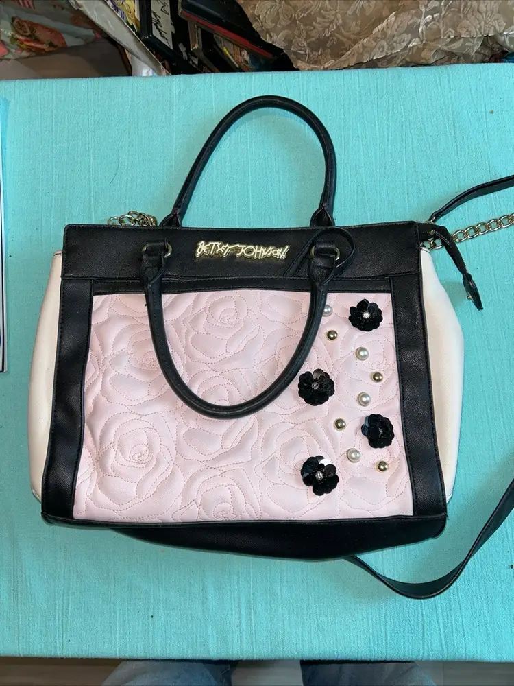 This Betsey Johnson purse is a stunning addition to any wardrobe. The alabaster pink exterior is adorned with black flowers, giving it a beautiful and elegant look. The bag has a zip closure and features a multi-style design that is both practical and fashionable.