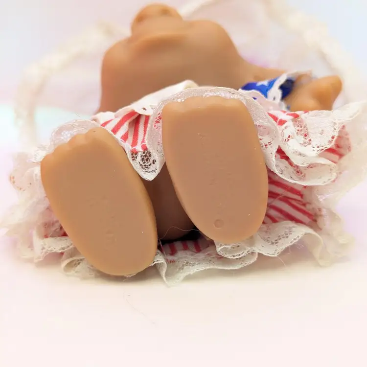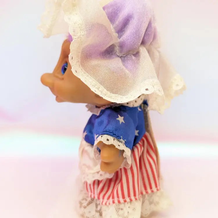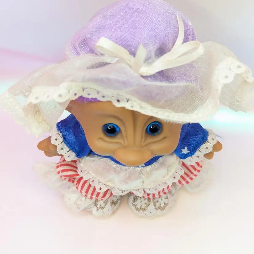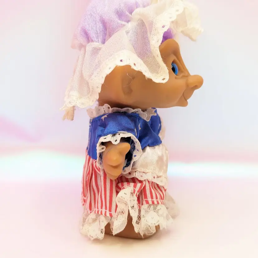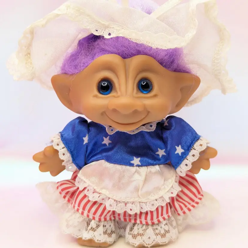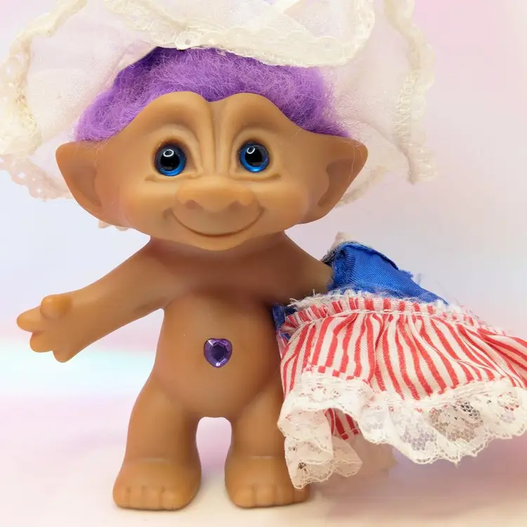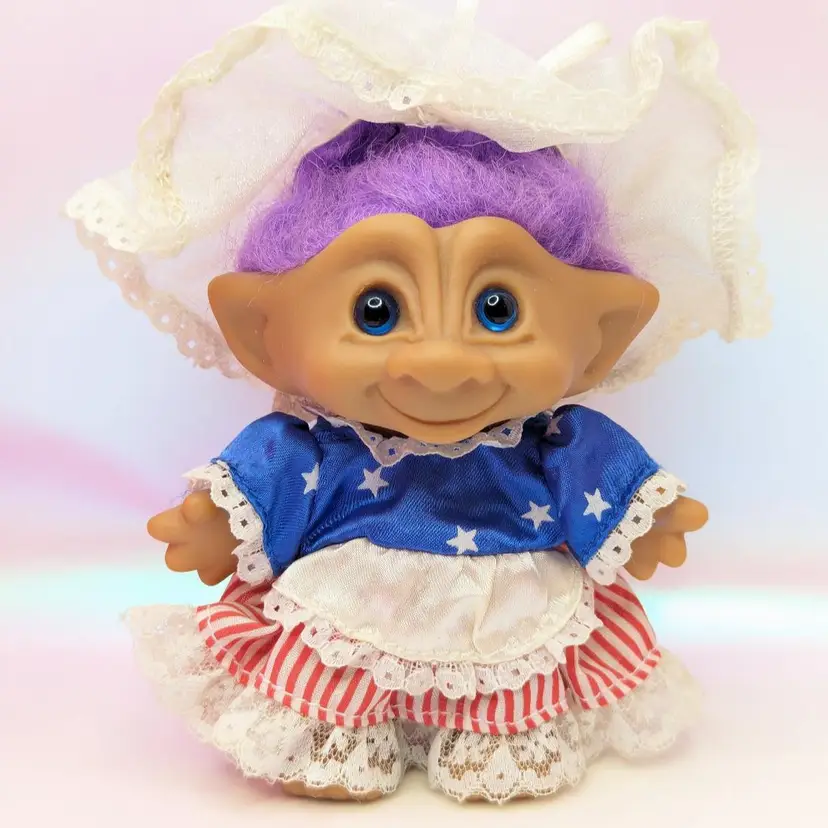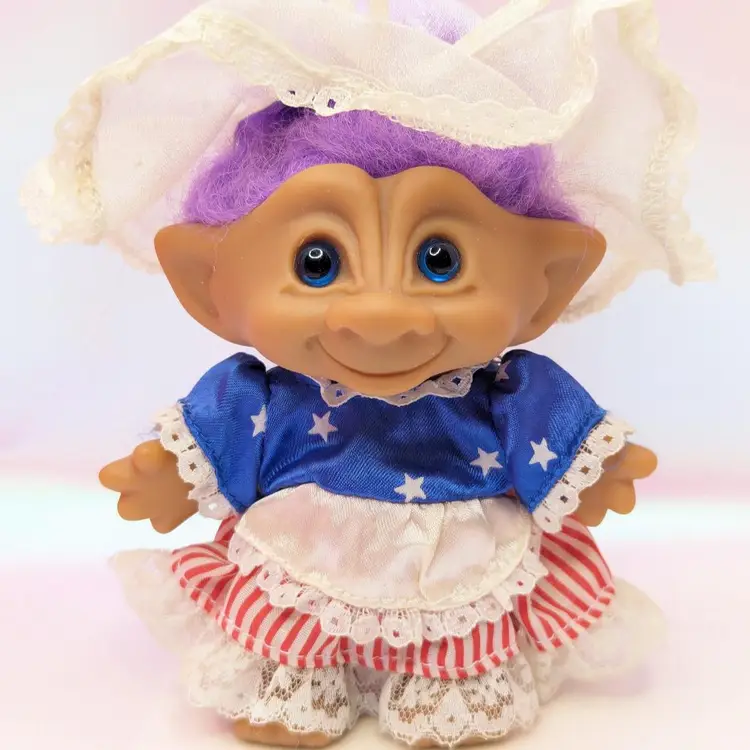 Vintage Treasure Troll Betsy Ross in a Patriotic 4th of July American flag style Dress with white bonnet. She Stands 4" Tall to the top of her head. She also has a purple Lucky Heart wishstone in her belly button. Marked ACE Novelty Made in China on the bottom of her feet. This troll has Purple Hair with blue Eyes. The hair is nice and clean, Bonnet is still attached to the head, could use a light cleaning, seems to be a little off white from years of display. Dress is in good condition, could use a little light cleaning as well. No rips, tears, or holes that I could see. Body has some light marks from play and age. This trolls come from a smoke free, pet friendly home. They have been lightly cleaned.