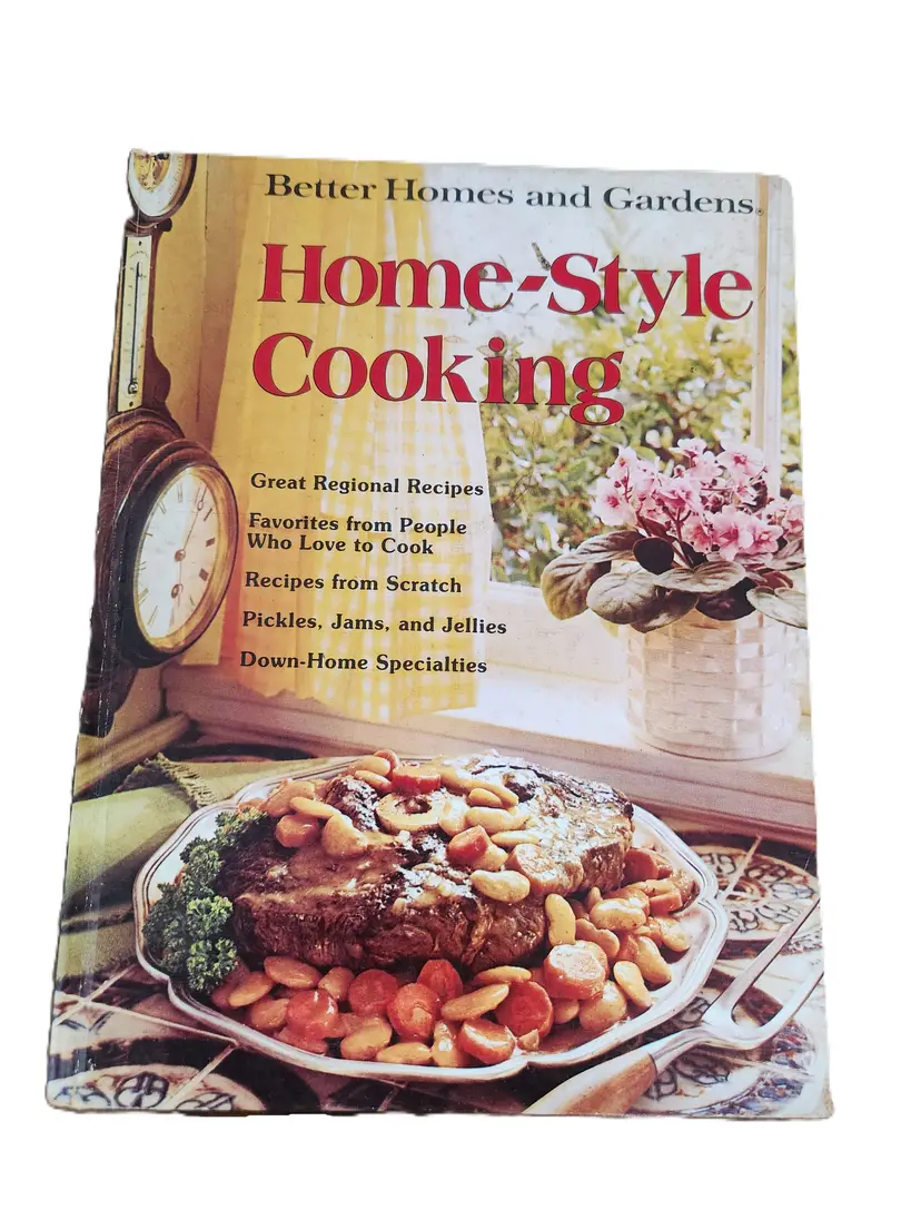 Filled with recipes and pictures. The corners of the book show a touch of wear. The inside has some age discoloration on the pages. No torn pages.