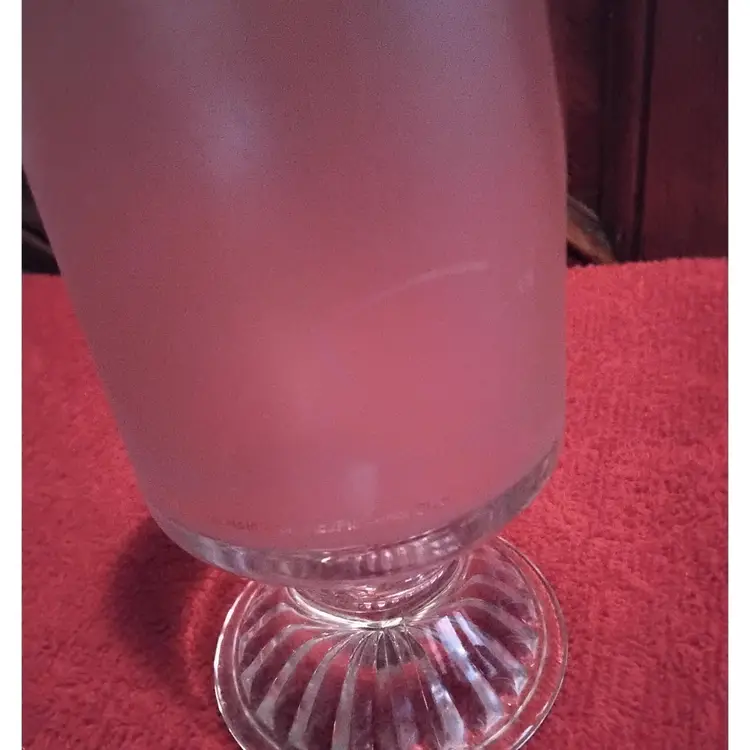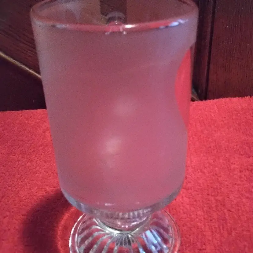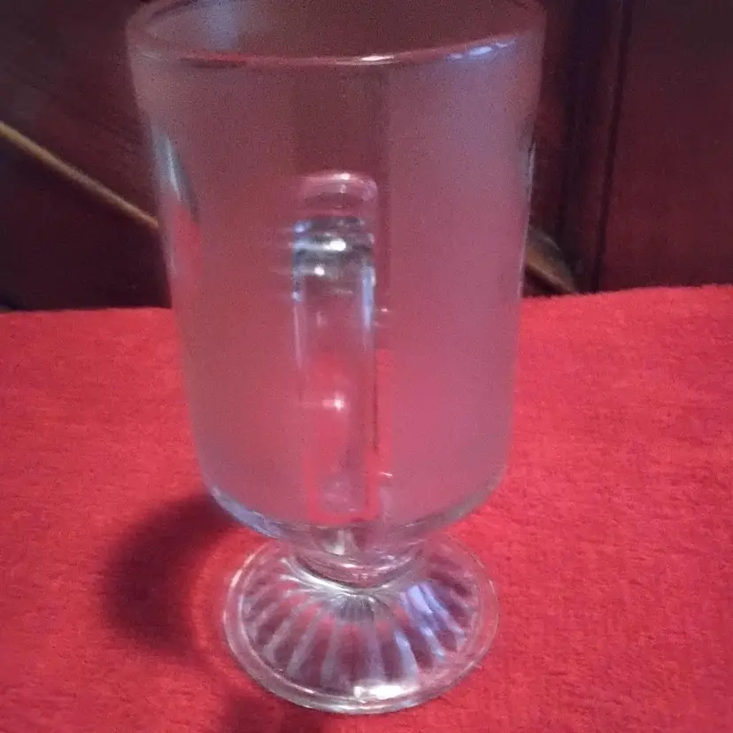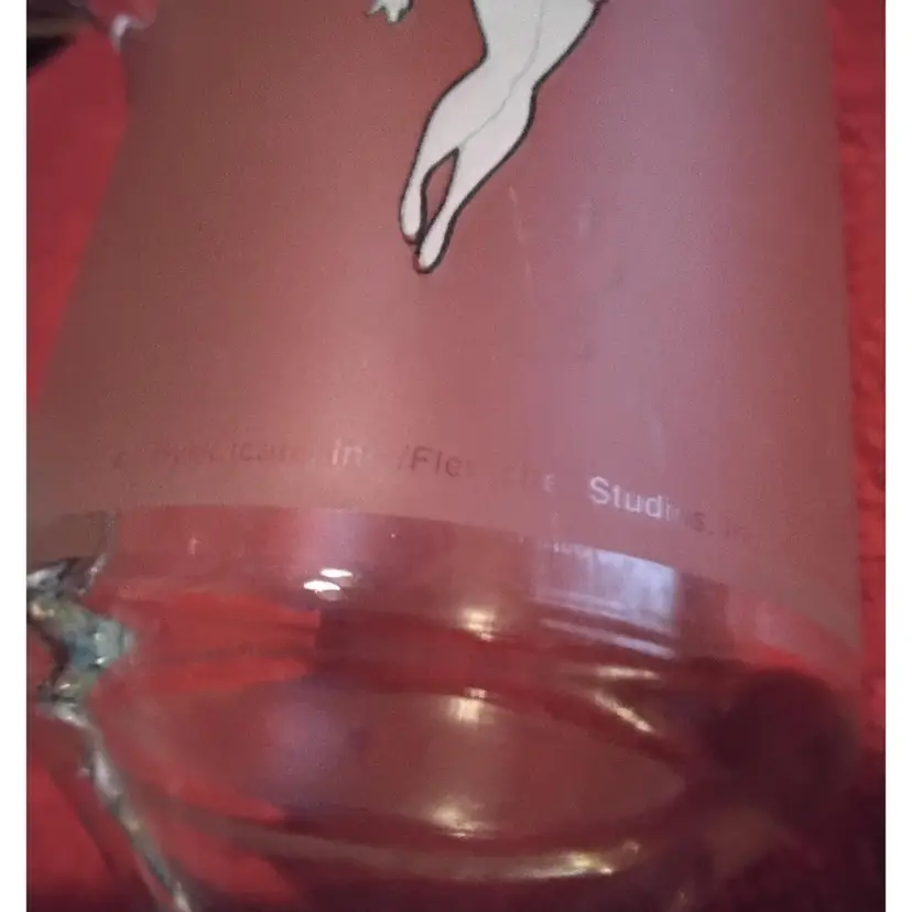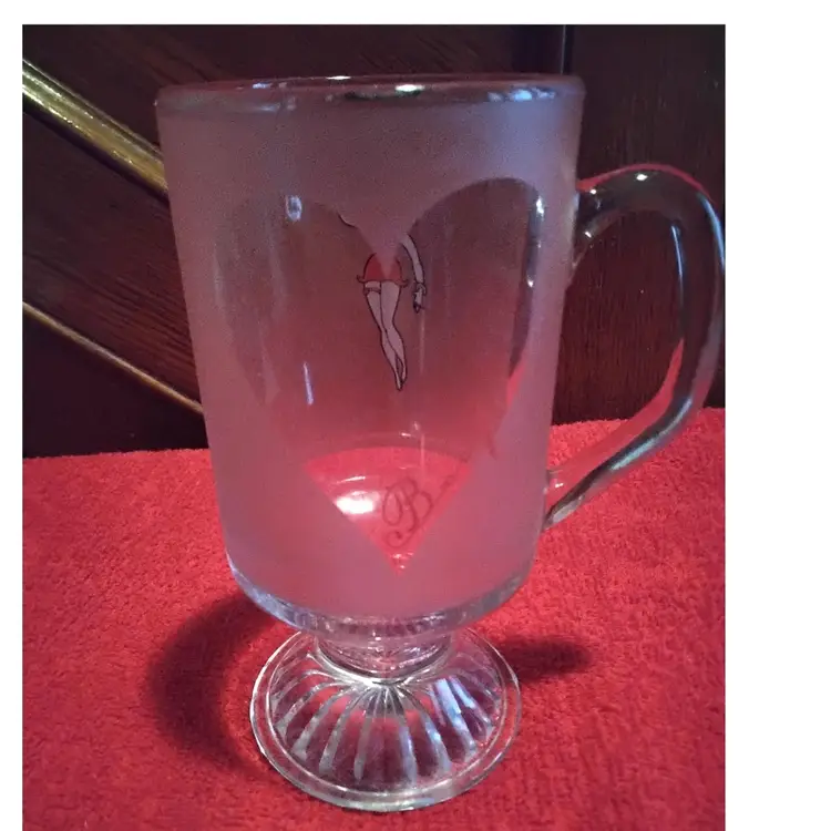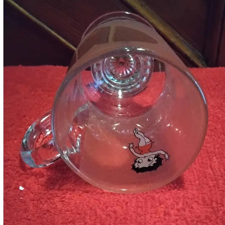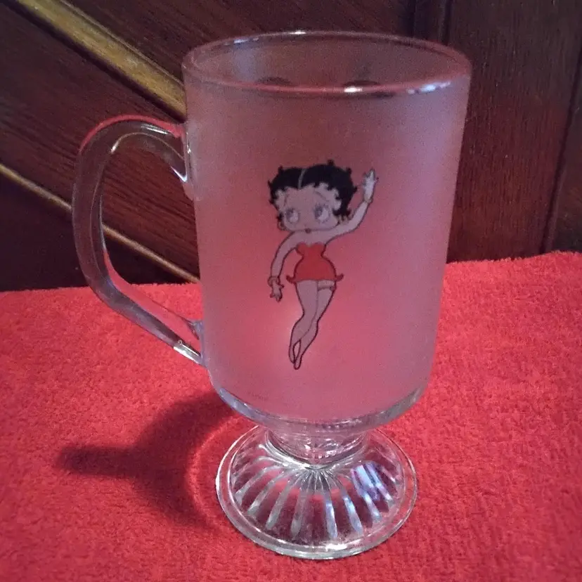 Betty Boop Mug has a clear heart on one side of mug and her on the other. The mug is Frosted and slightly pink. It is a pedestal glass with handle. 5.9 inches tall and 4.3 inches wide including handle. Holds 10 ounces. It has a some scratch marks on it. Over all in good condition no chips or cracks. Photos are part of the description.