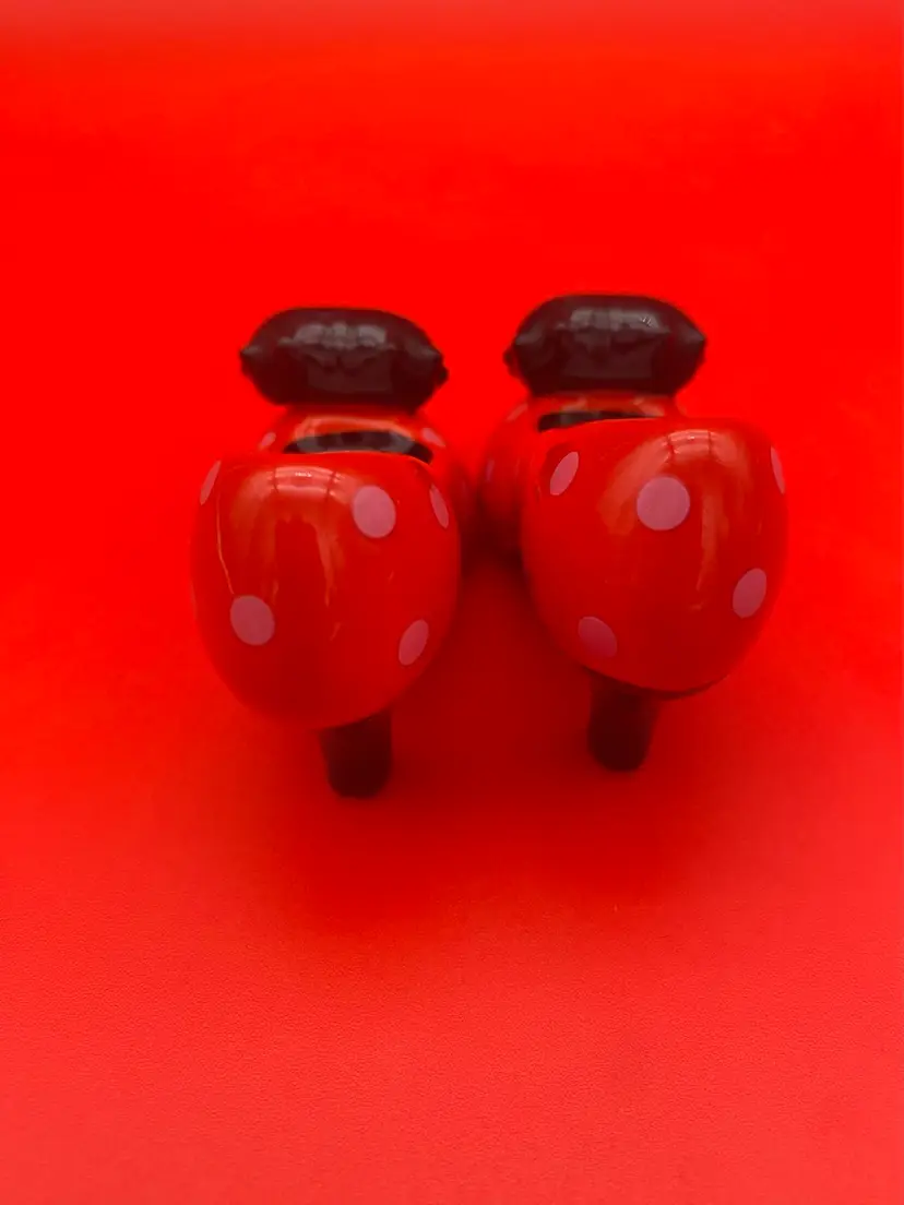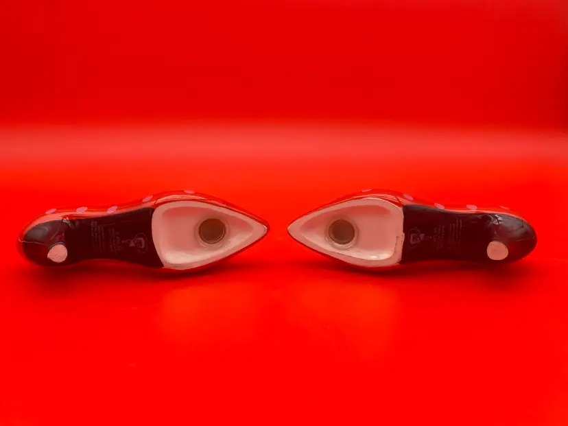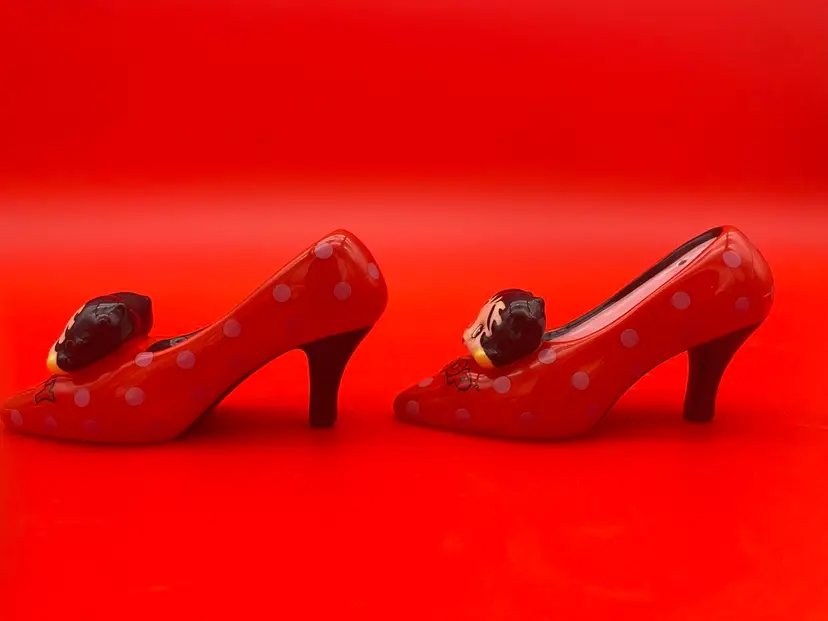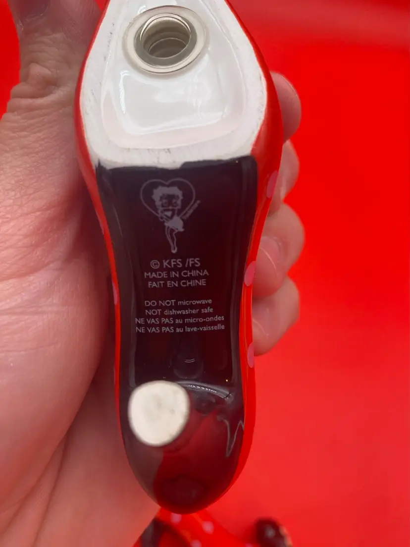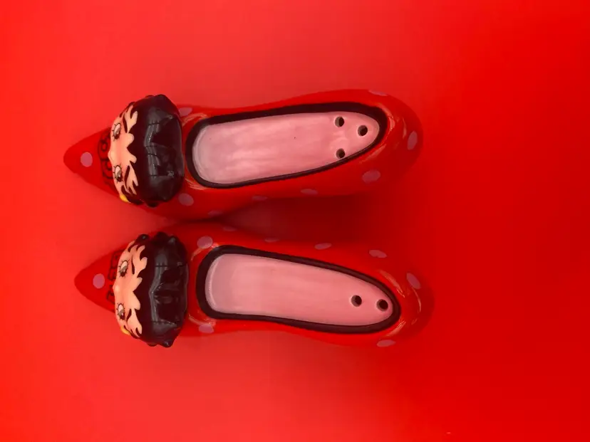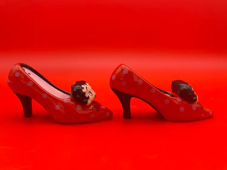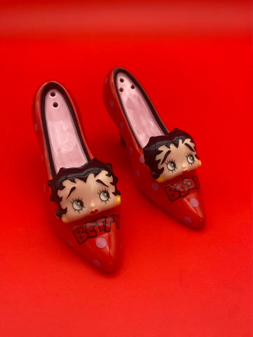 You are purchasing a pair of Red & Pink Polka-Dot Pattern Betty Boop High-Heel Shoes Shaped Ceramic Salt & Pepper Shakers. Each Shaker is up to 4 inches long, 1.25 inches wide and 2.25 inches tall. These Shakers are in overall great condition. Clean with both Stoppers. No cracks or staining. Just see final image of one small chip on the back of the Heel base of the Salt Shaker.