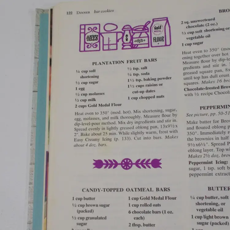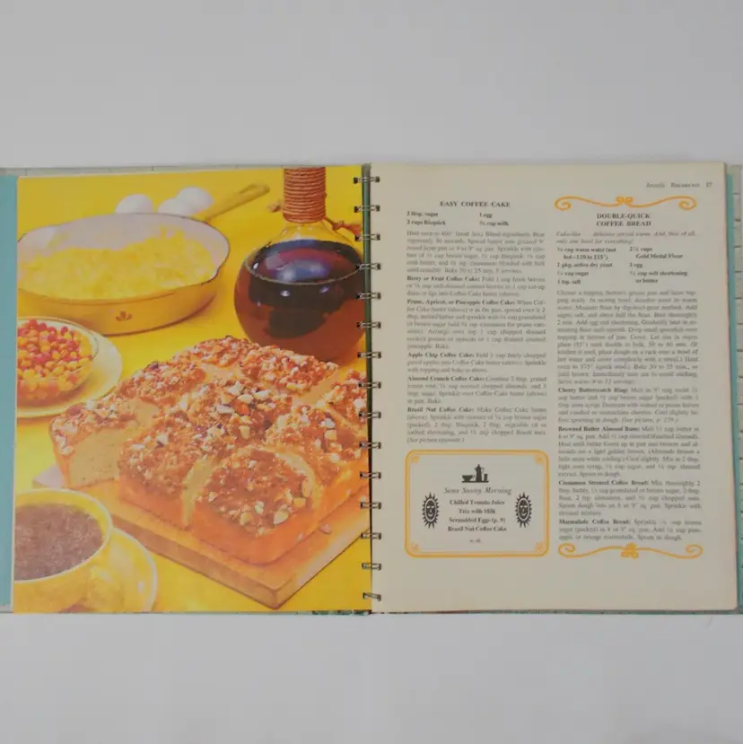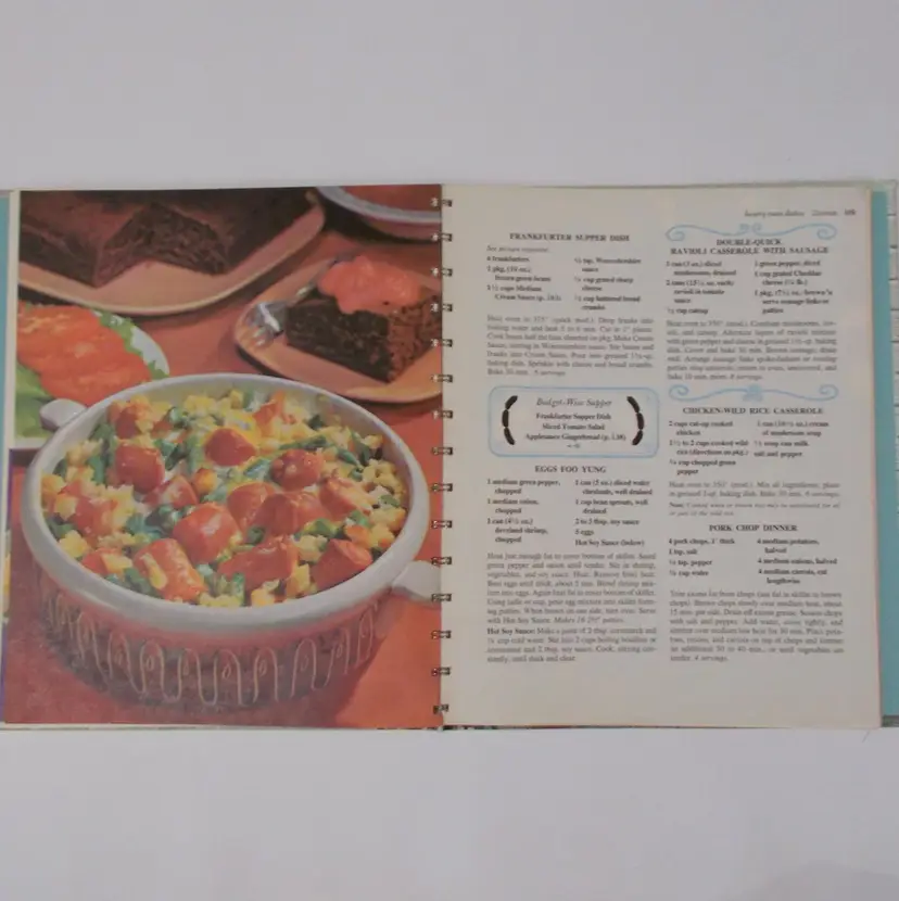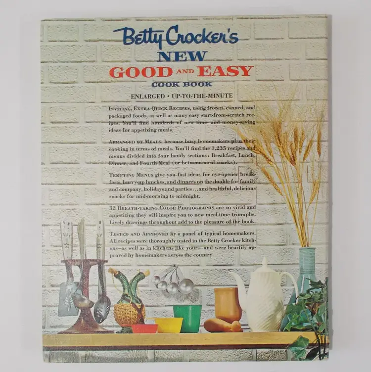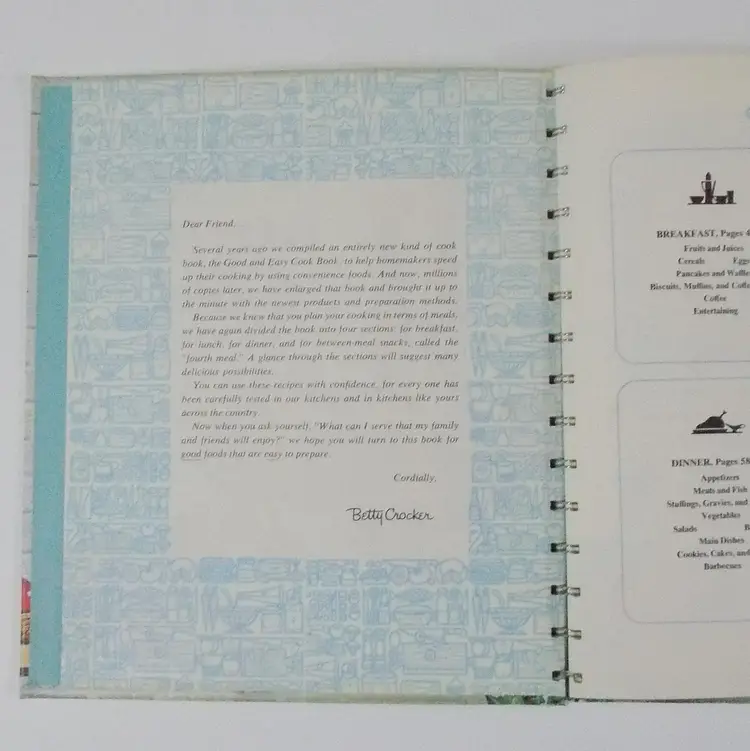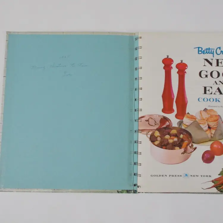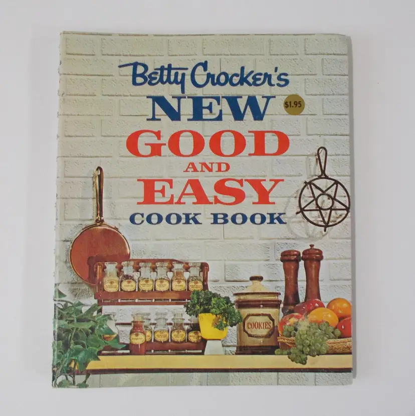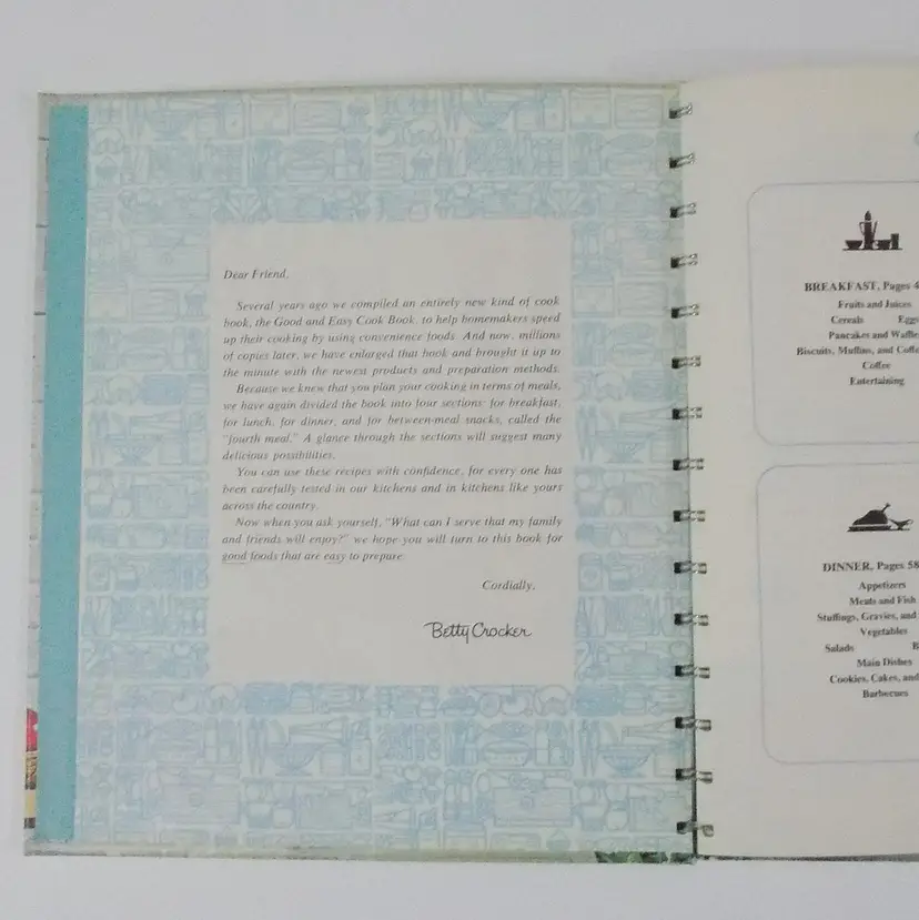 Betty Crocker's New Quick and Easy Recipes cookbook from 1962. First edition, third printing hardcover book with 192 pages. Breakfast, lunch and dinner recipes, plus snacks and desserts. Wrinkles corner on one page and some stains on another. Writing inside of front cover.