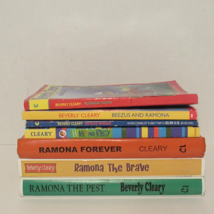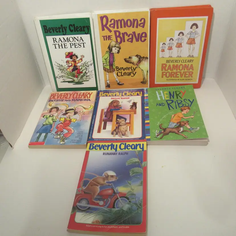 *Very Good Condition -3 Hardcover and 4 paperbacks. The pages of books are clean. There are no markings and no writings on the pages. The spines are intact and very sturdy. *The hardcover books are ex-library books, and have library markings. (See example in last photos.) Beverly Cleary Book Collection Ramona The Pest (1968) Hardcover Ramona Forever (1984) Hardcover Ramona Ralph (1991) Paperback Maggie Maggie (1991) Paperback Beezus and Ramona (2000) Paperback Ramona the Brave (2006) Hardcover Henry and Risby (2007) Paperback