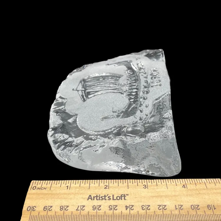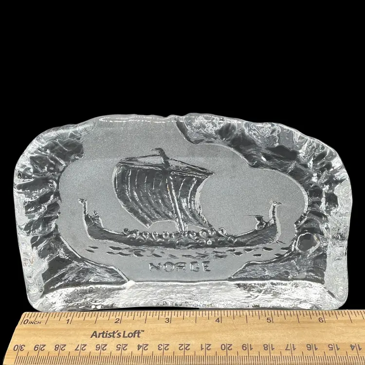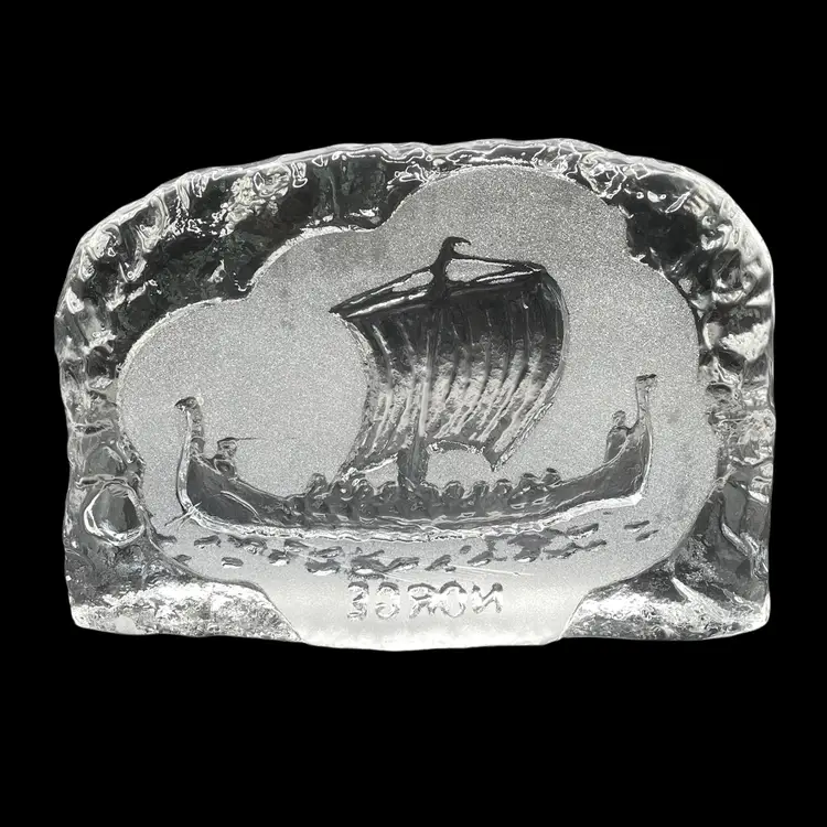 The BF Norge Eda Krystall Design Viking Ship Pressed Glass Paperweight is a medium-sized decorative collectible made of clear glass. Originating from Norway, this paperweight features a unique Viking ship design and the Old Norse name for Norway, "NORGE", adding a touch of Scandinavian elegance to any space. Perfect for collectors or those looking to add a distinctive piece to their decor, this paperweight showcases the craftsmanship and cultural influence of Norway.