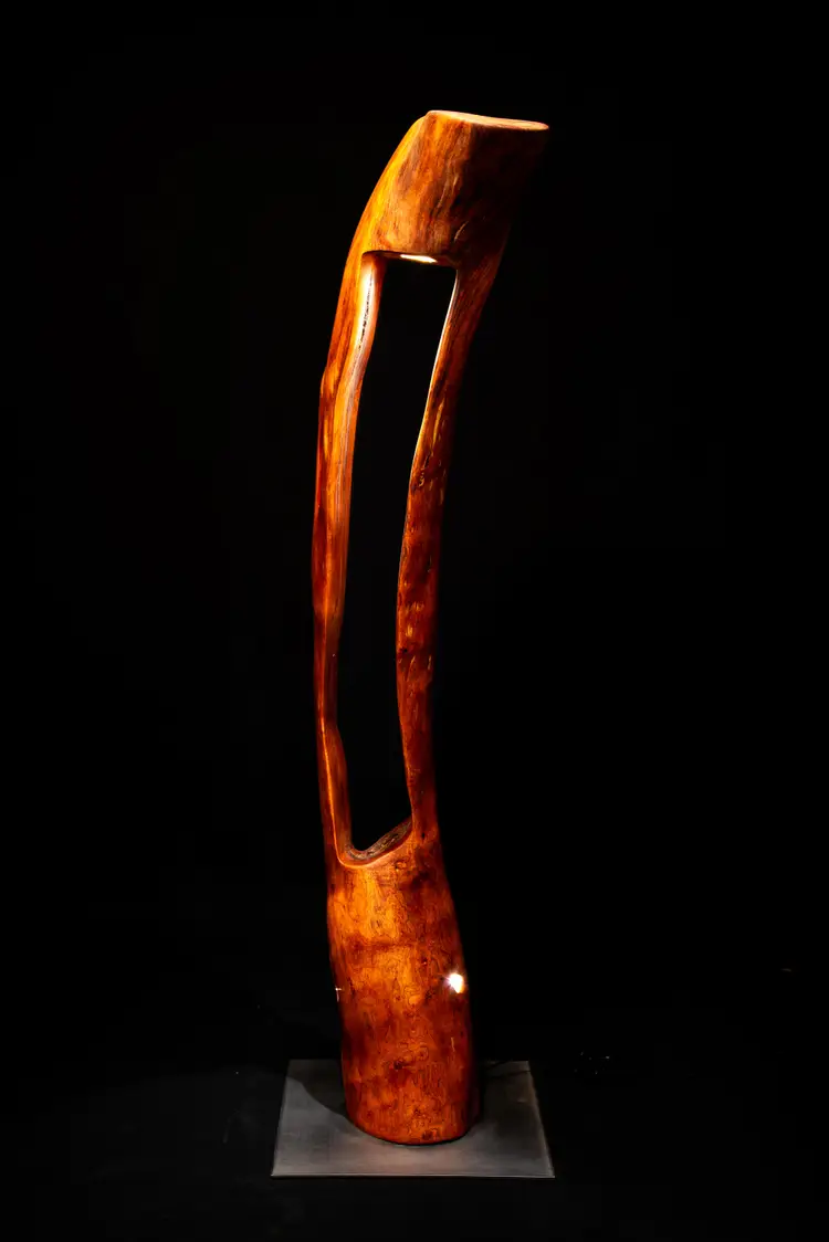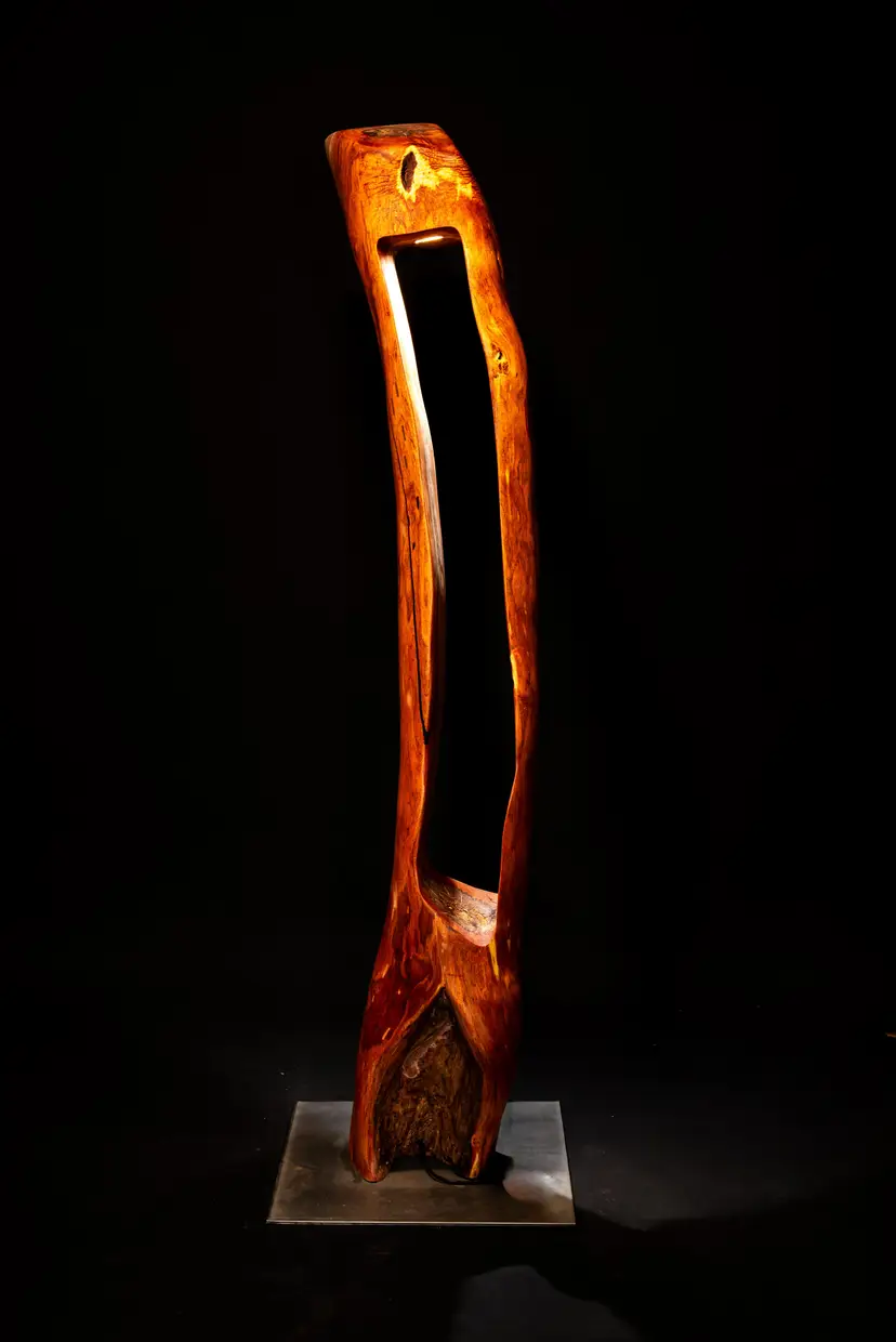 A carved vertical channel exposes the tree’s darkened heartwood, transforming its dense core into a luminous interior chamber. When illuminated, light rises through the form and activates the mesquite’s natural palette—reds, golds, and molten browns—producing a dramatic interplay of depth, shadow, and warmth. Hand-shaped surfaces transition deliberately between refined planes and raw texture, preserving the material’s inherent character while asserting sculptural intent.