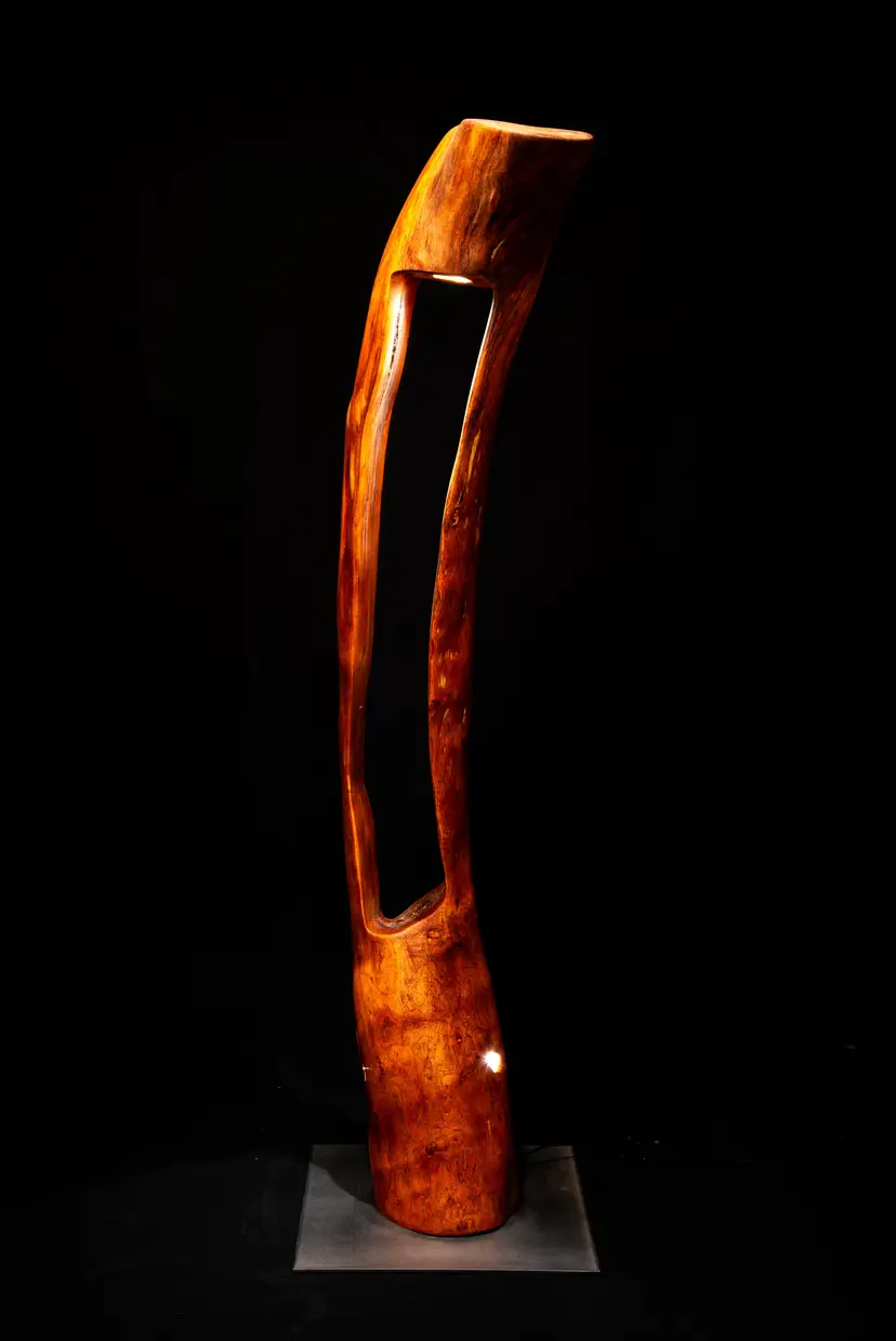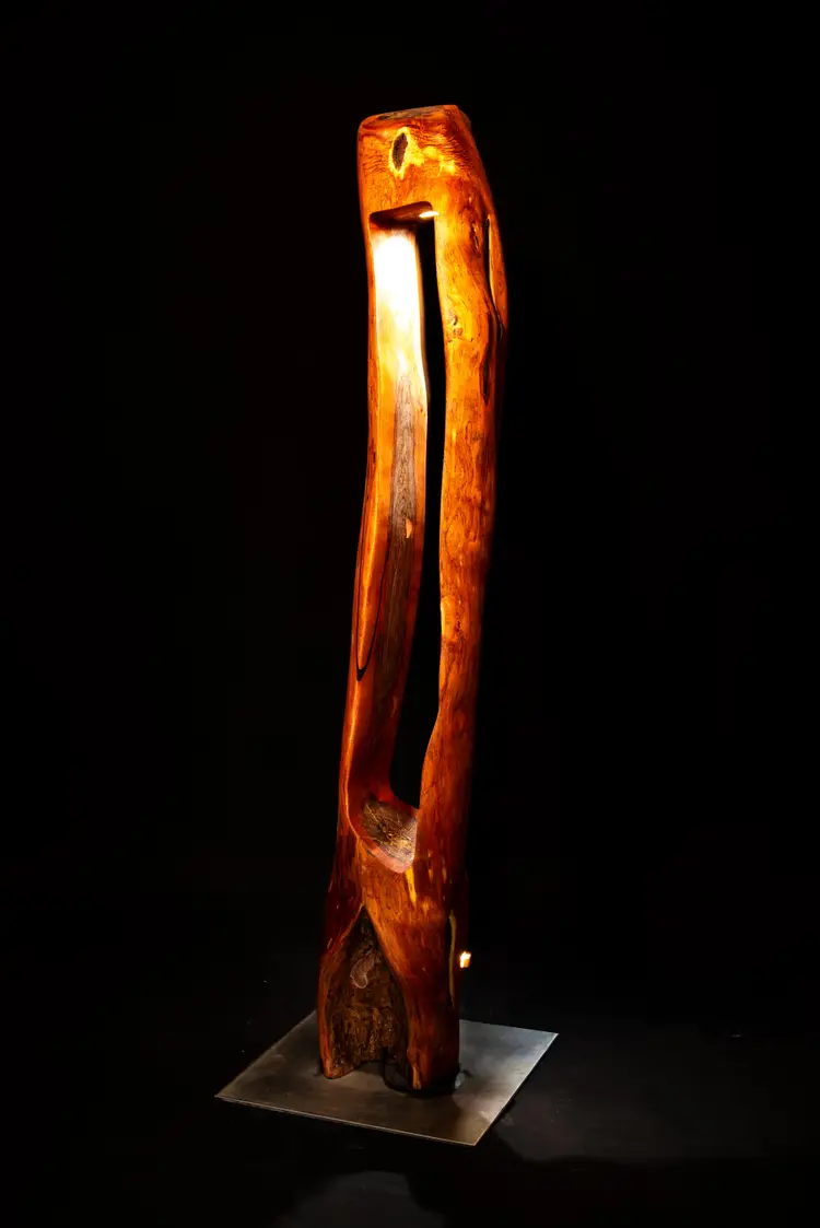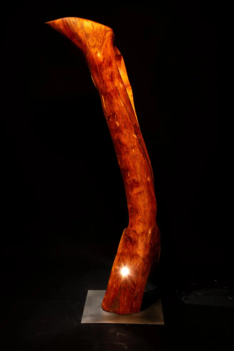Each piece begins as a single log or cross-section—often reclaimed locally—and is transformed through a slow, hands-on process of carving, burning, and refinement. Light is then integrated into the form, revealing hidden structures, depth, and movement within the wood itself.