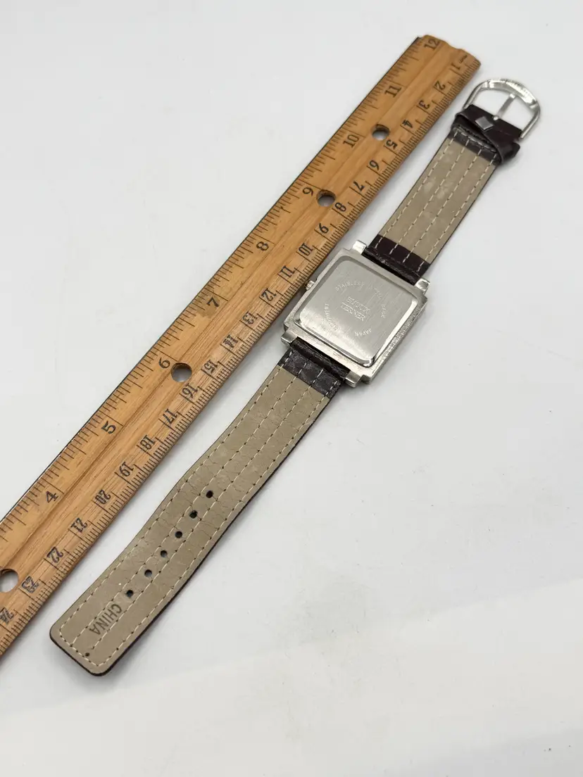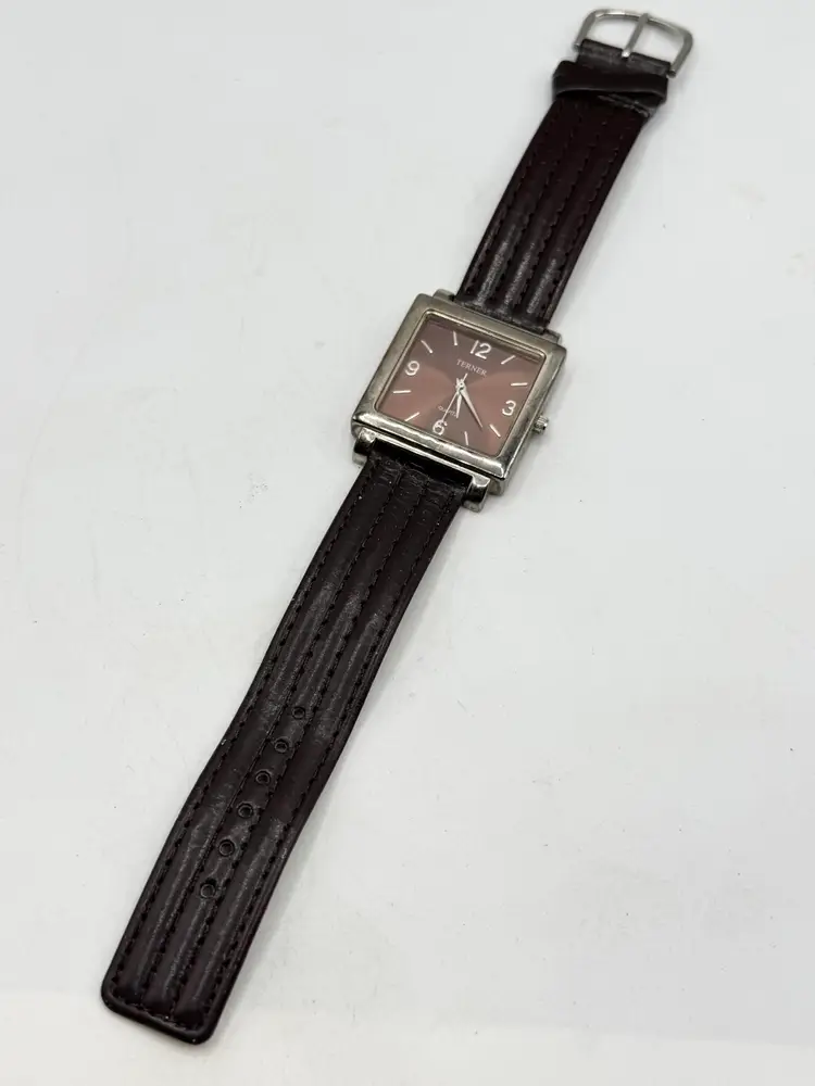 Bijoux Terner Watch Rectangular Face Silver Toned Brown Band. Brown band. Sold as is, not sure if working. Vintage watch. Japan movement stainless steel back. Brown face. Turner quartz. MN55GH.
