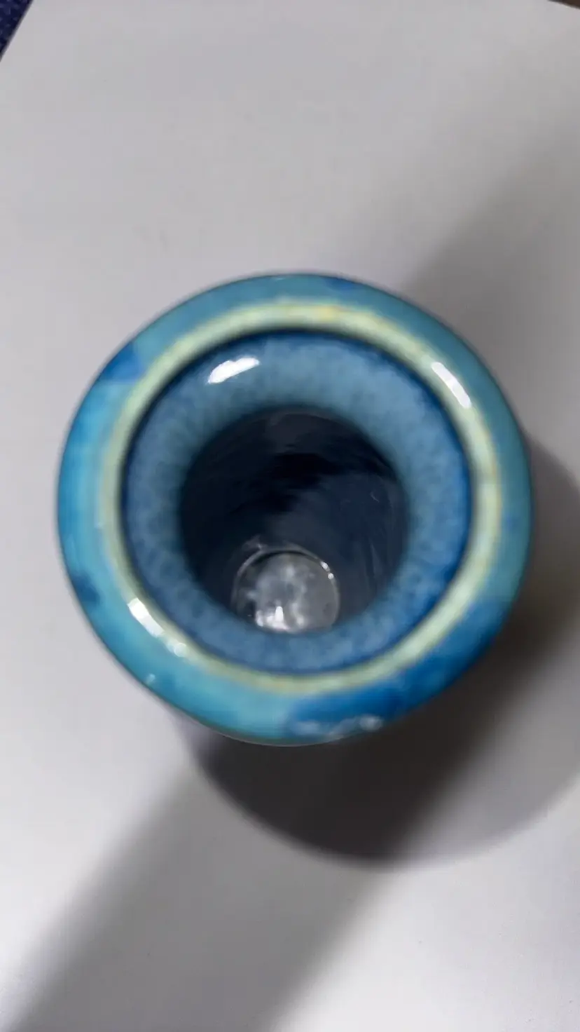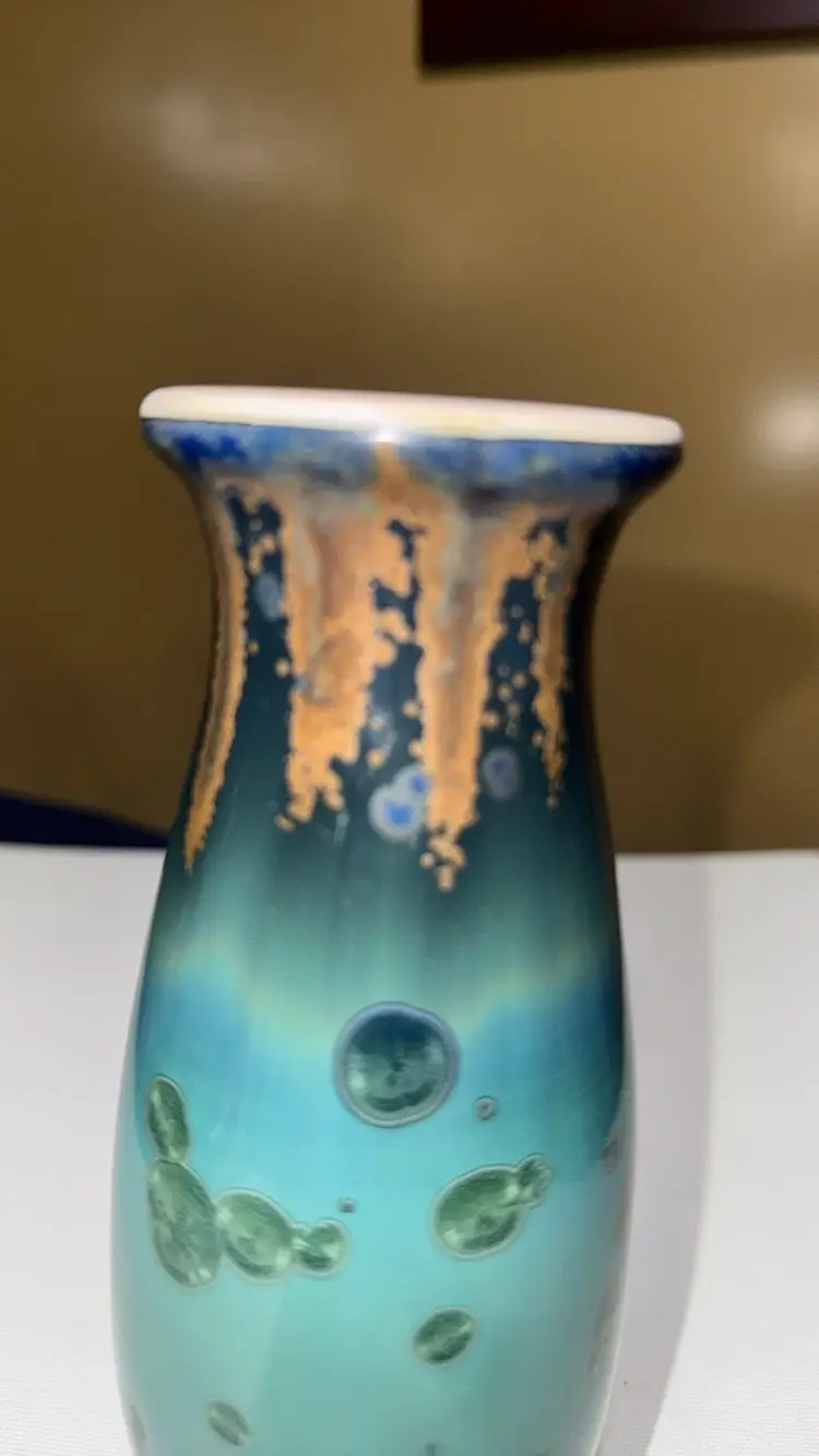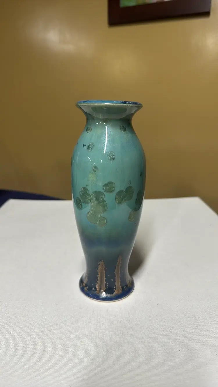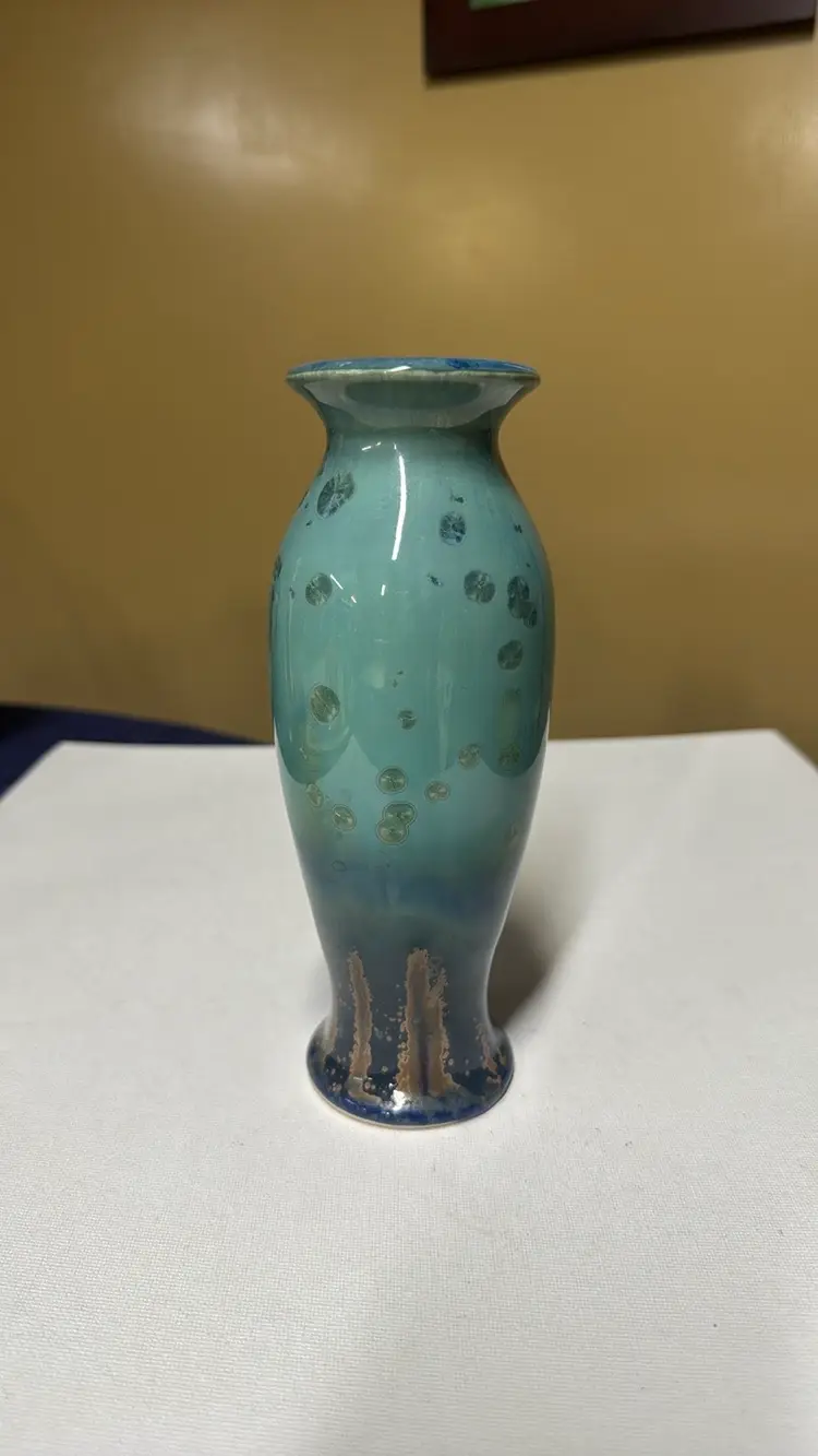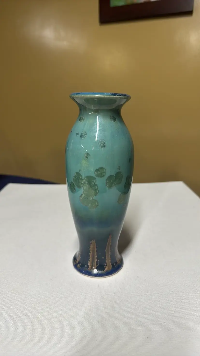 Bill Campbell art pottery crystalline flambeaux bud vase Gorgeous little vase 7.5” tall 1.75” opening across the top Beautiful blue/green crystals signed Excellent condition with no breaks or chips (5274262520)