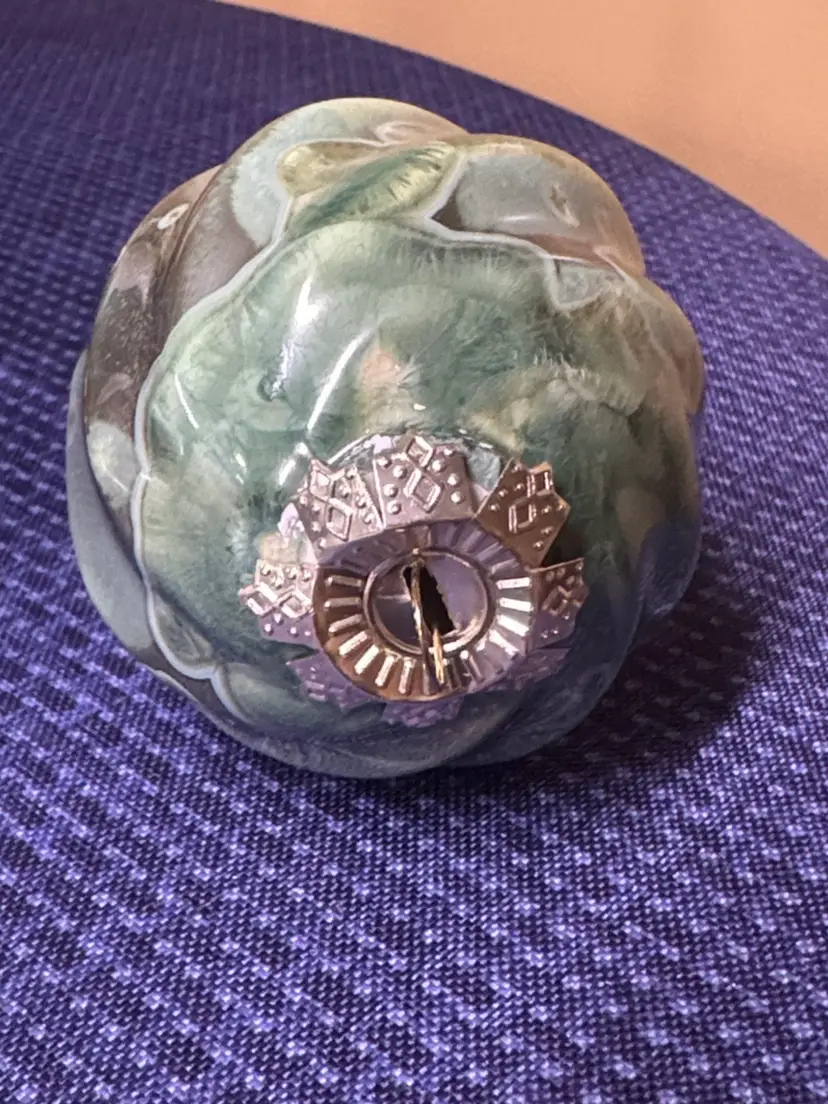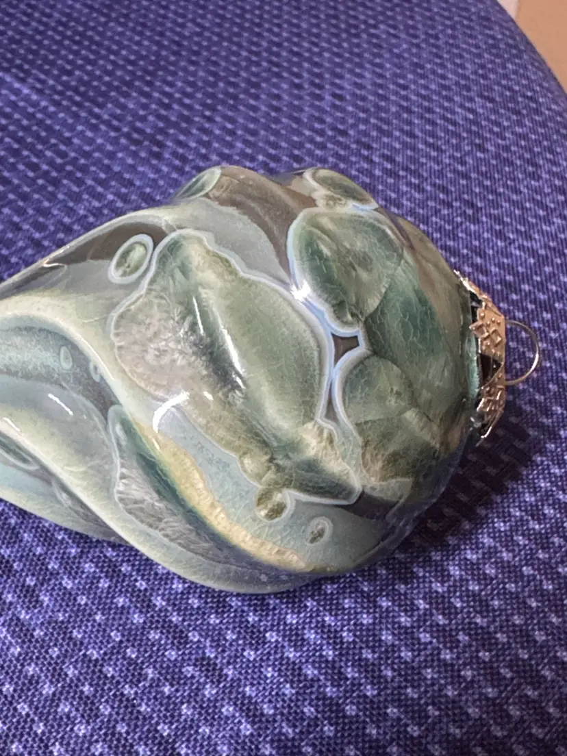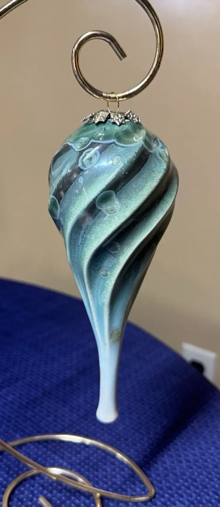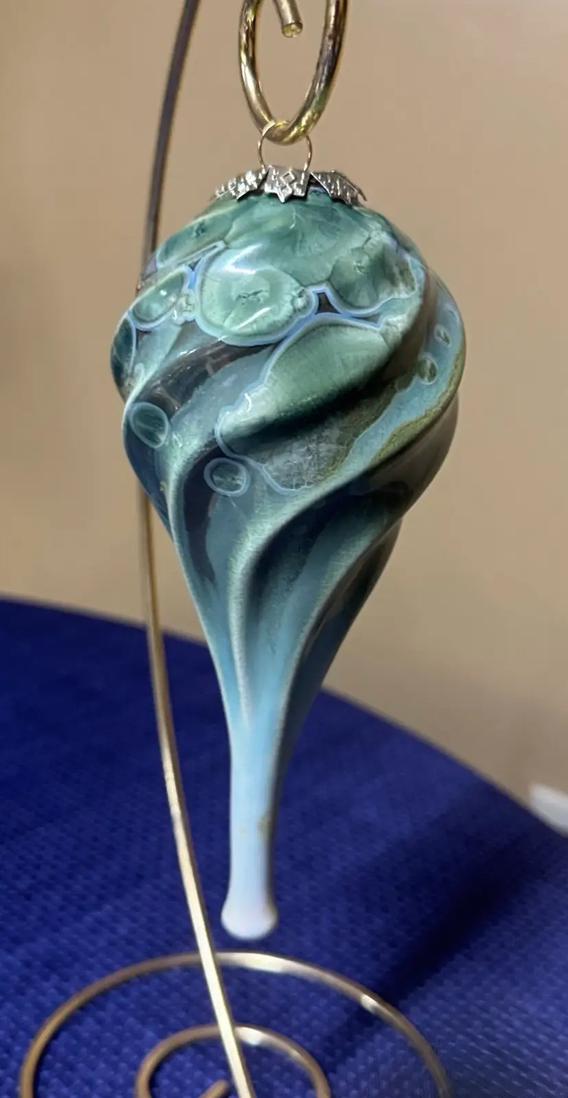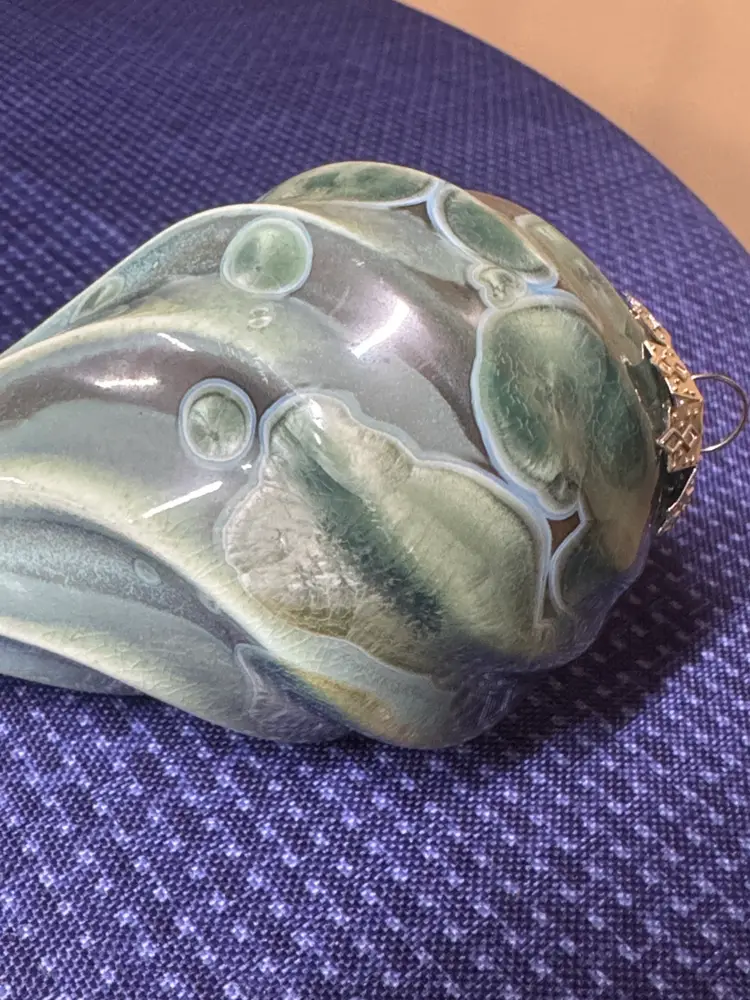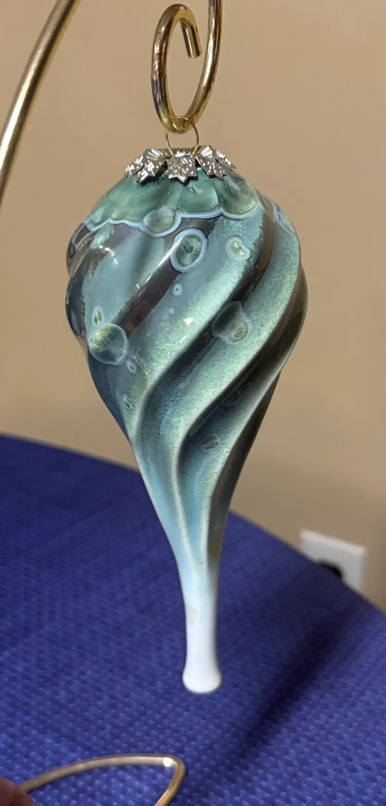 Elegant vintage teardrop ornament with a cream green and blue design. Perfect for holiday decor. Bill Campbell pottery crystalline christmas ornament Green and blue crystalline These ornaments are extremely rare and beautiful. Campbell pottery in Northwestern Pennsylvania Bill Campbell recently retired and is no longer making pottery Excellent condition with no breaks or chips there is a little bit of rough glaze on the top but does not take away from its beauty. Absolutely gorgeous! (107010325bo40)