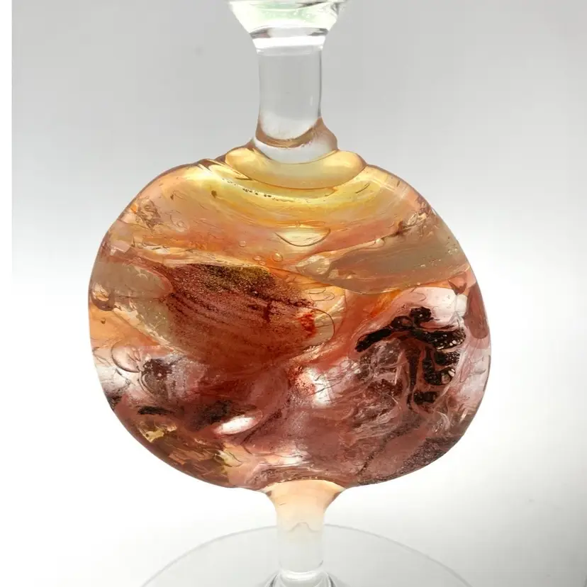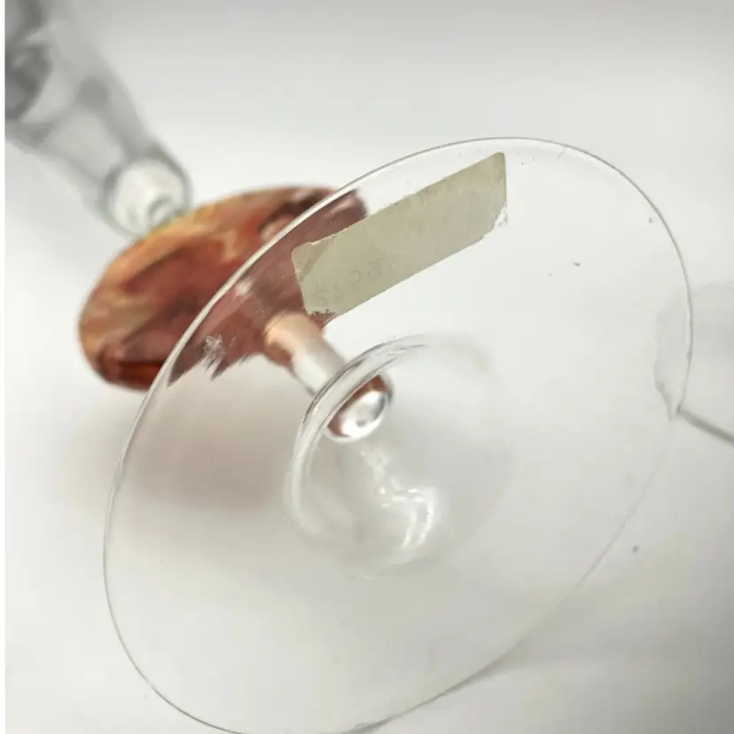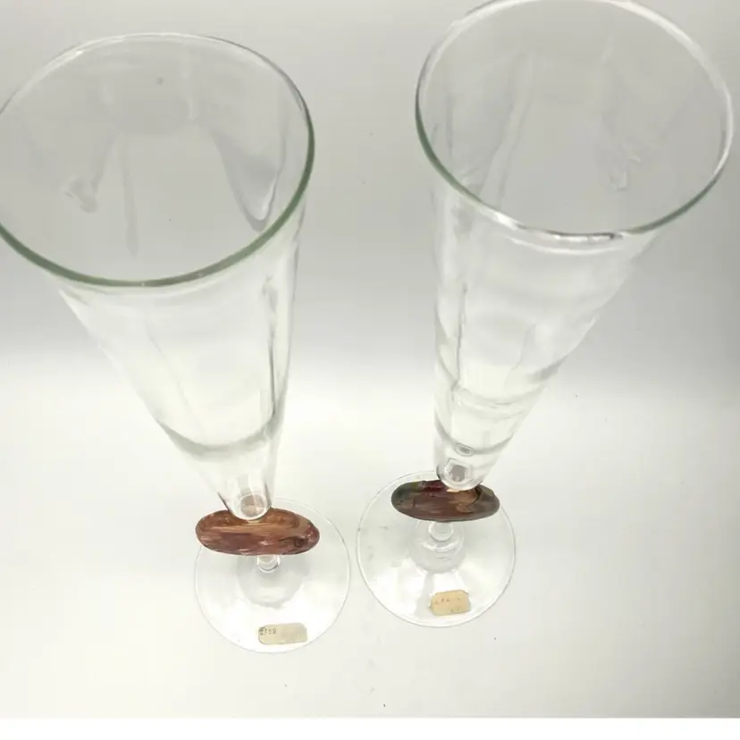 I have never seen anything quite like this pair of champagne flutes. Glass is wavy and clearly handmade. Part of me thinks they are really important…. 14.25” tall. On e us 3.25” at base and the other is 3.375”. Excellent used condition.