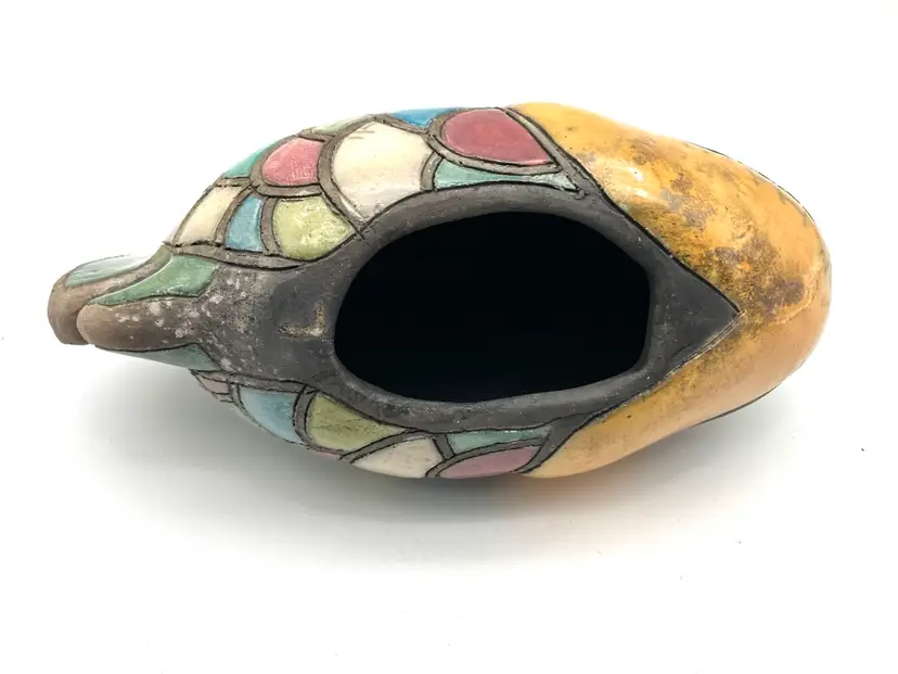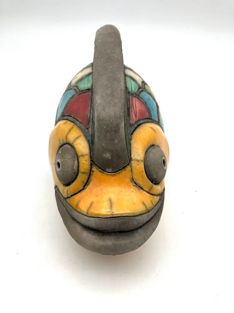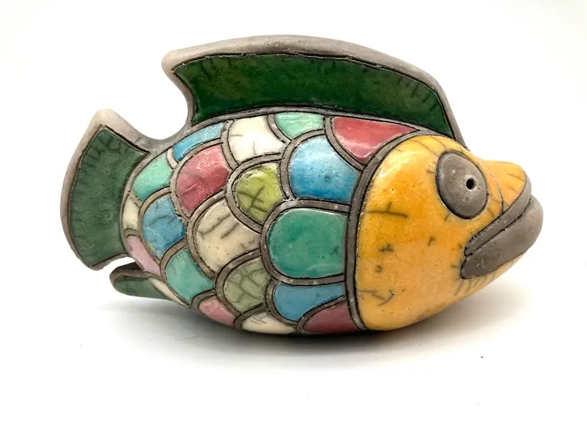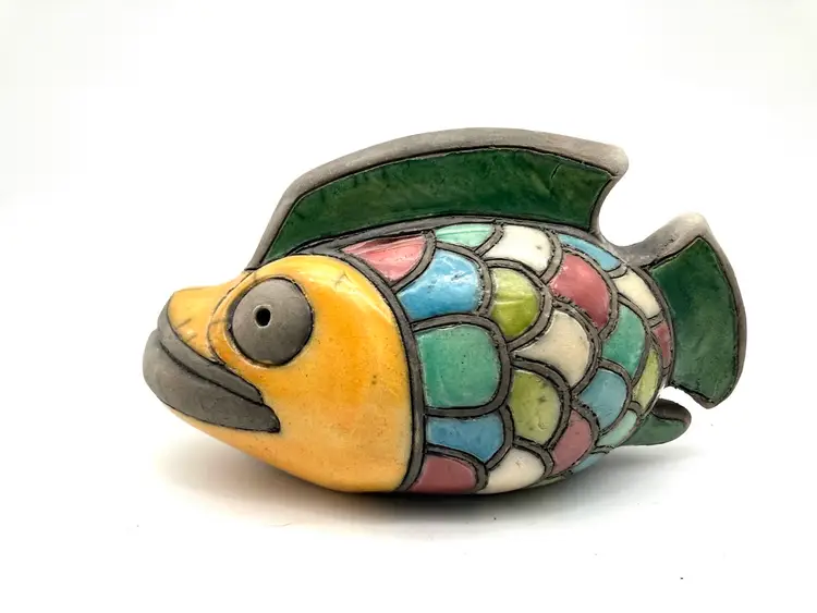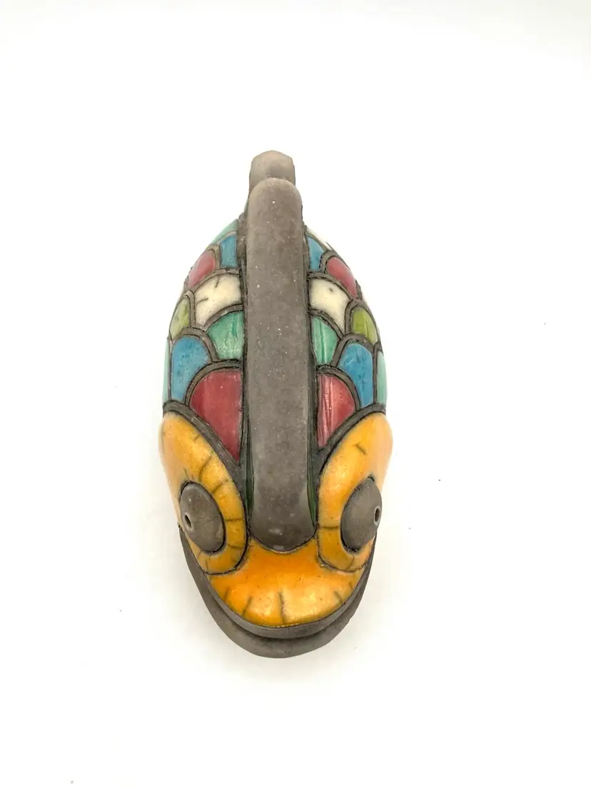 Colorful and fun pottery fish made in South Africa. Measures 8” x 3.5” x 4.5” . Great condition. Some crazing to glaze. See pics.