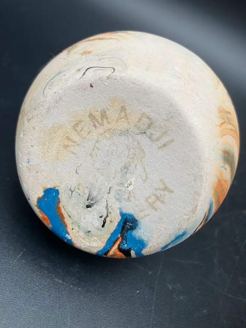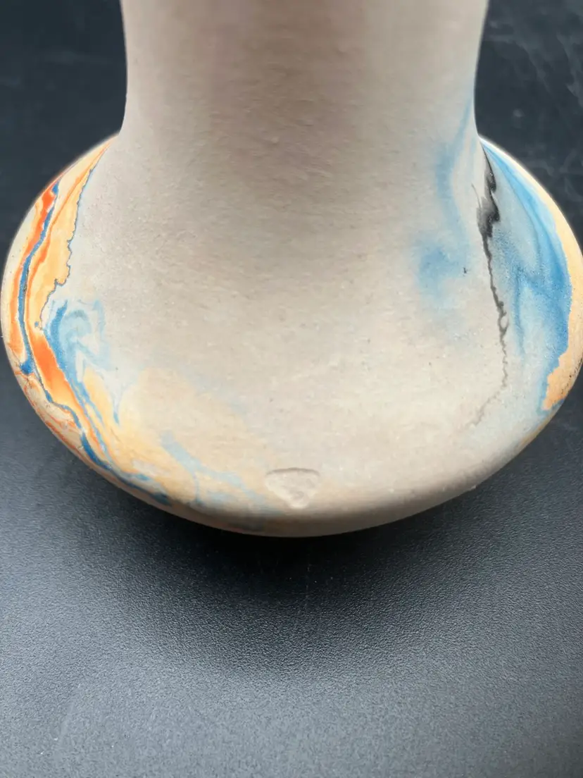 Colorful Nemadji pottery bud vase orange blue brown tan. Measures 3.5” tall by 3” diameter. Matte outside; shiny glaze inside so will hold water. Small forgivable chip on back side. Great condition otherwise.