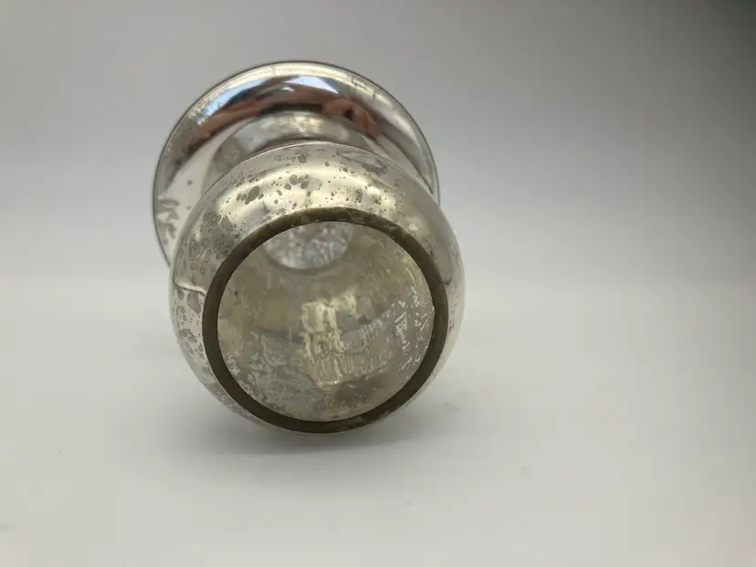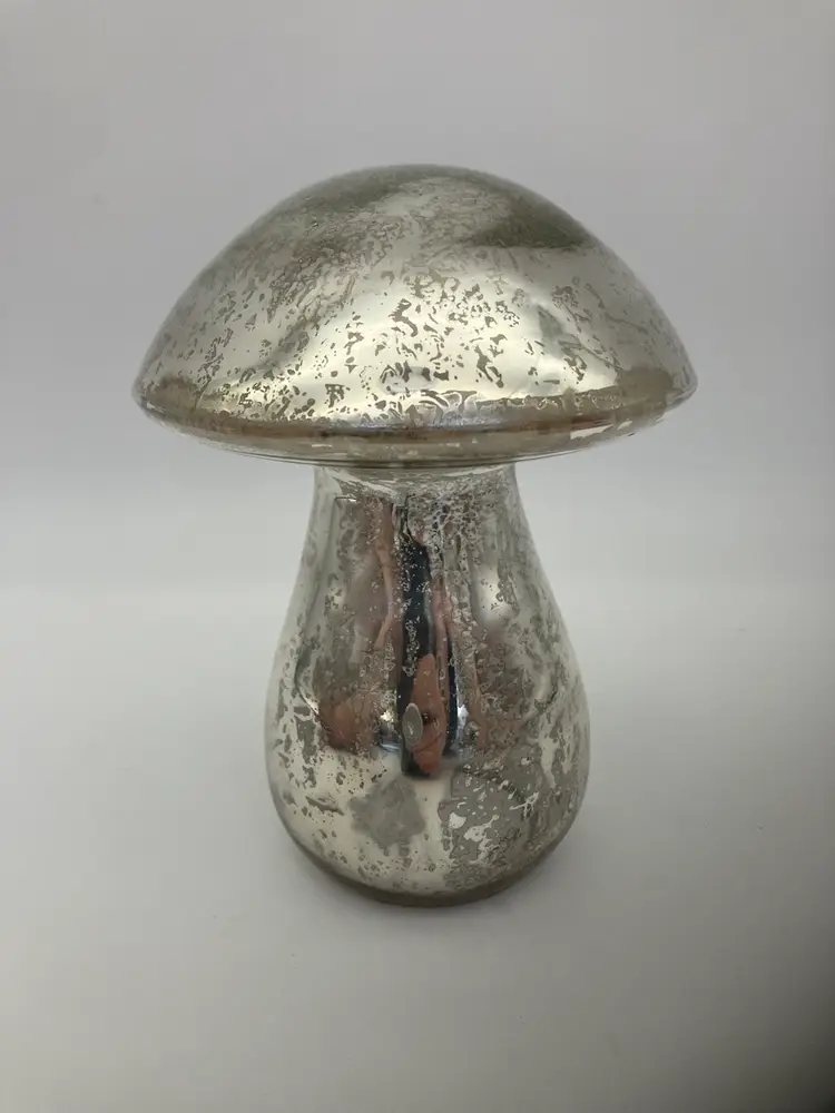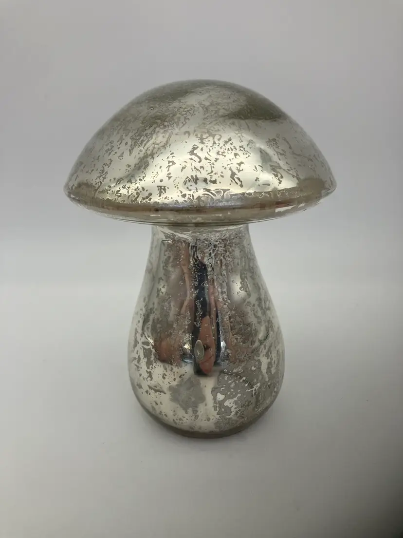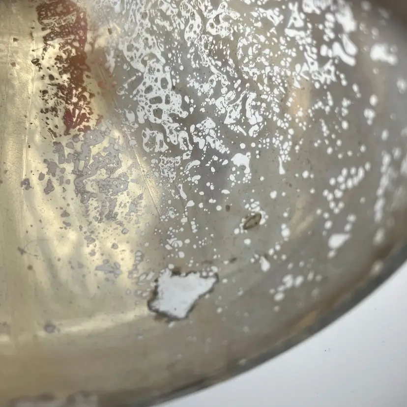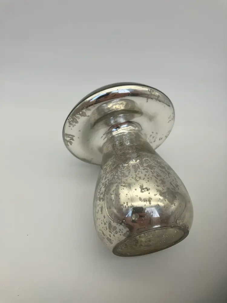 Hollow glass mushroom with silvered coating, but the coating is inside the hollow mushroom and not between 2 layers of glass… so this may be a more recent piece. There is one area where the coating looks almost burned away. See pic. No other issues..
