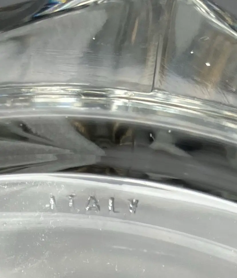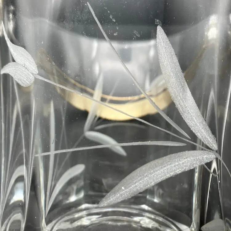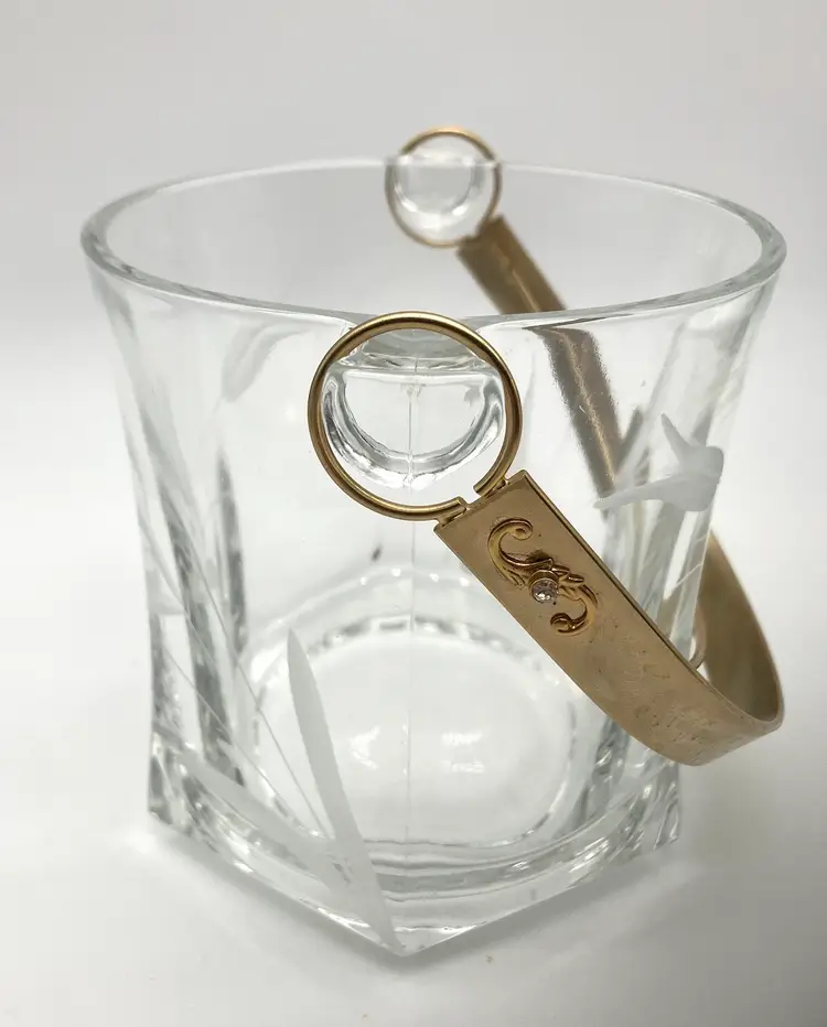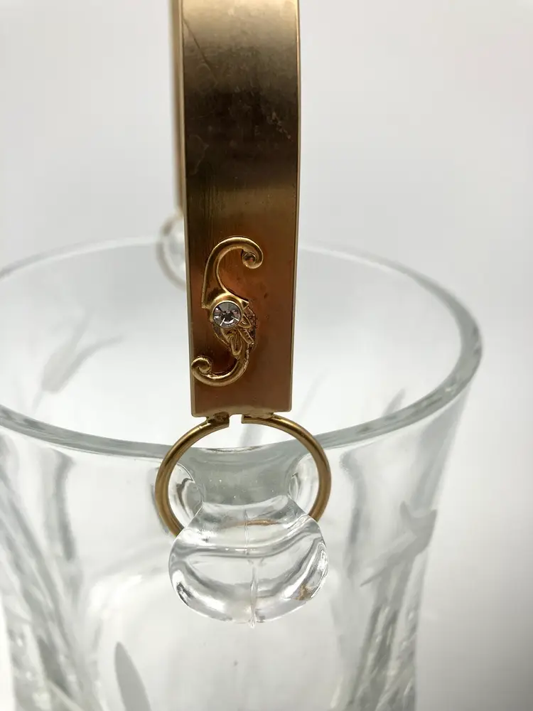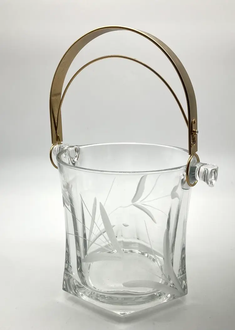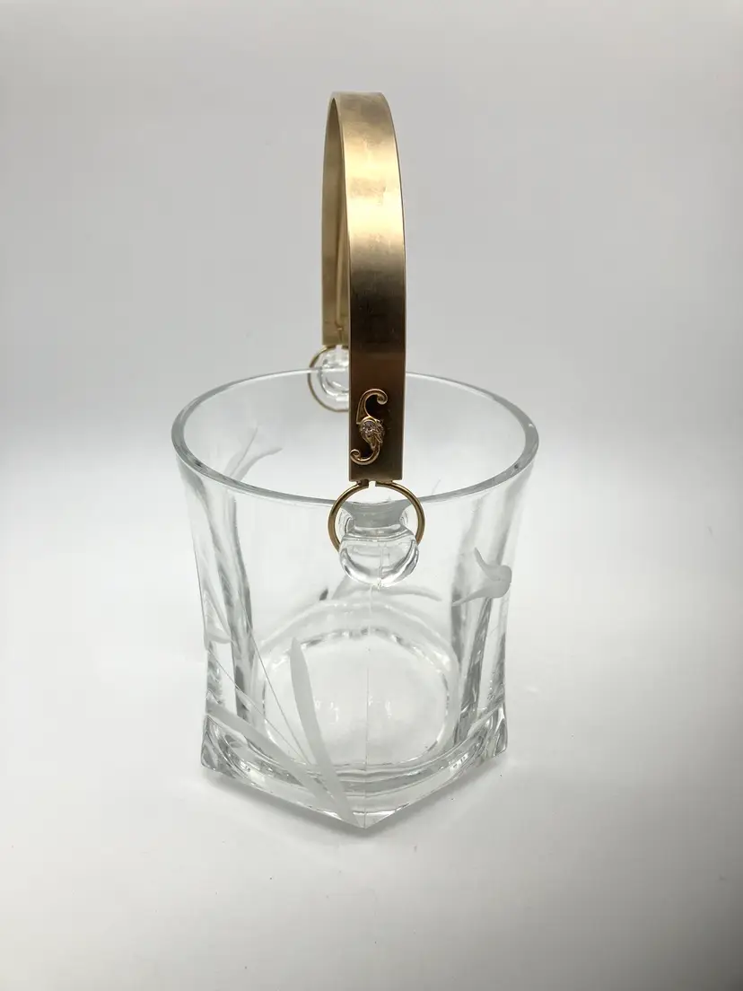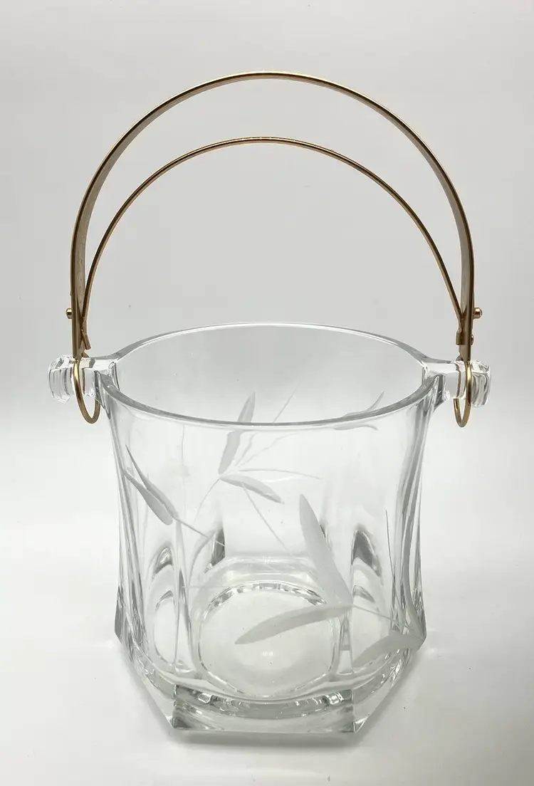 Glass bucket measured 5” tall by 4.75” diameter. With handle up, measures 9” tall. Excellent condition; no chips or cracks.