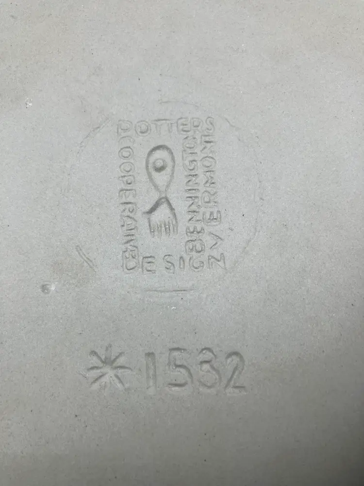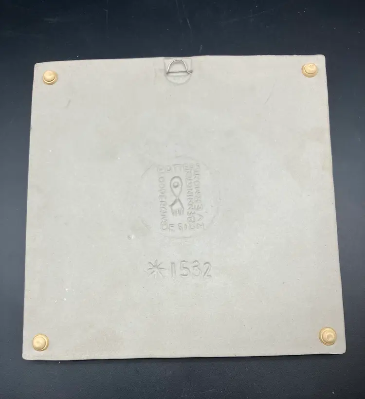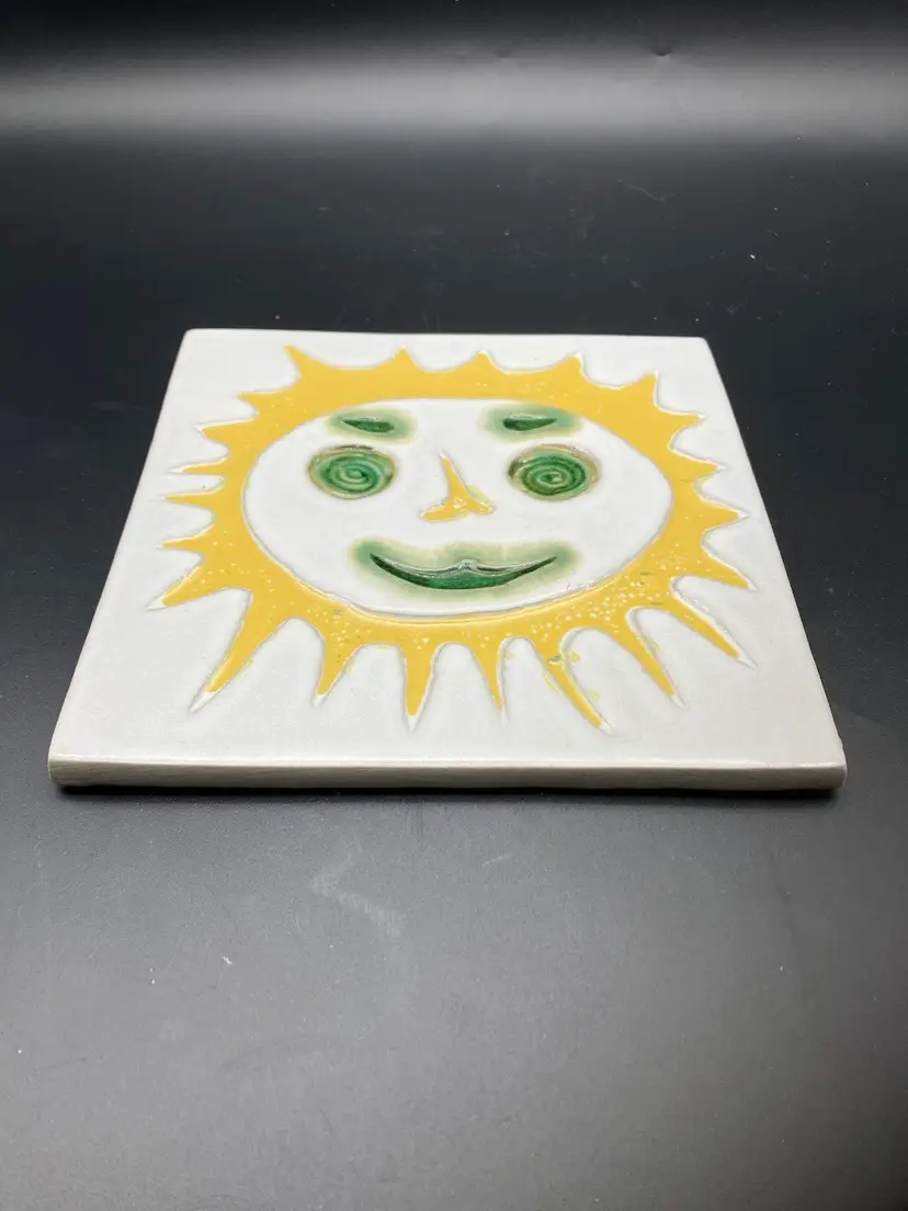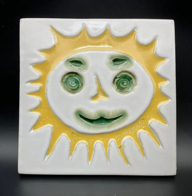 Part of David Gil’s Artware collection at Bennington Potters in the 1970s, this 7.75” tile is adorned with a sun screen Otto g a whimsical face. The piece has feet to be used as a trivet, as well as a hanger for wall decor. No chips or cracks, excellent used condition.