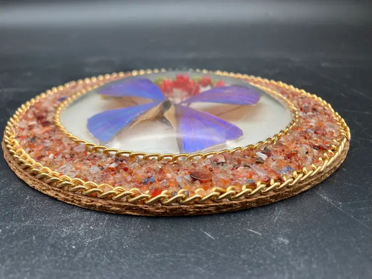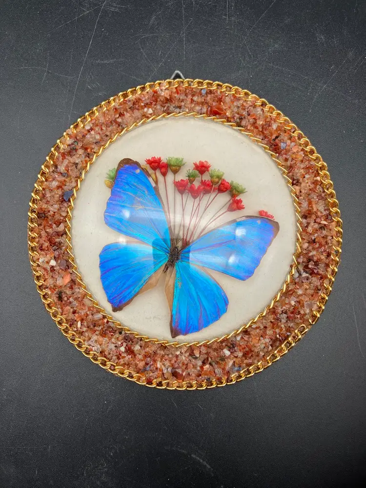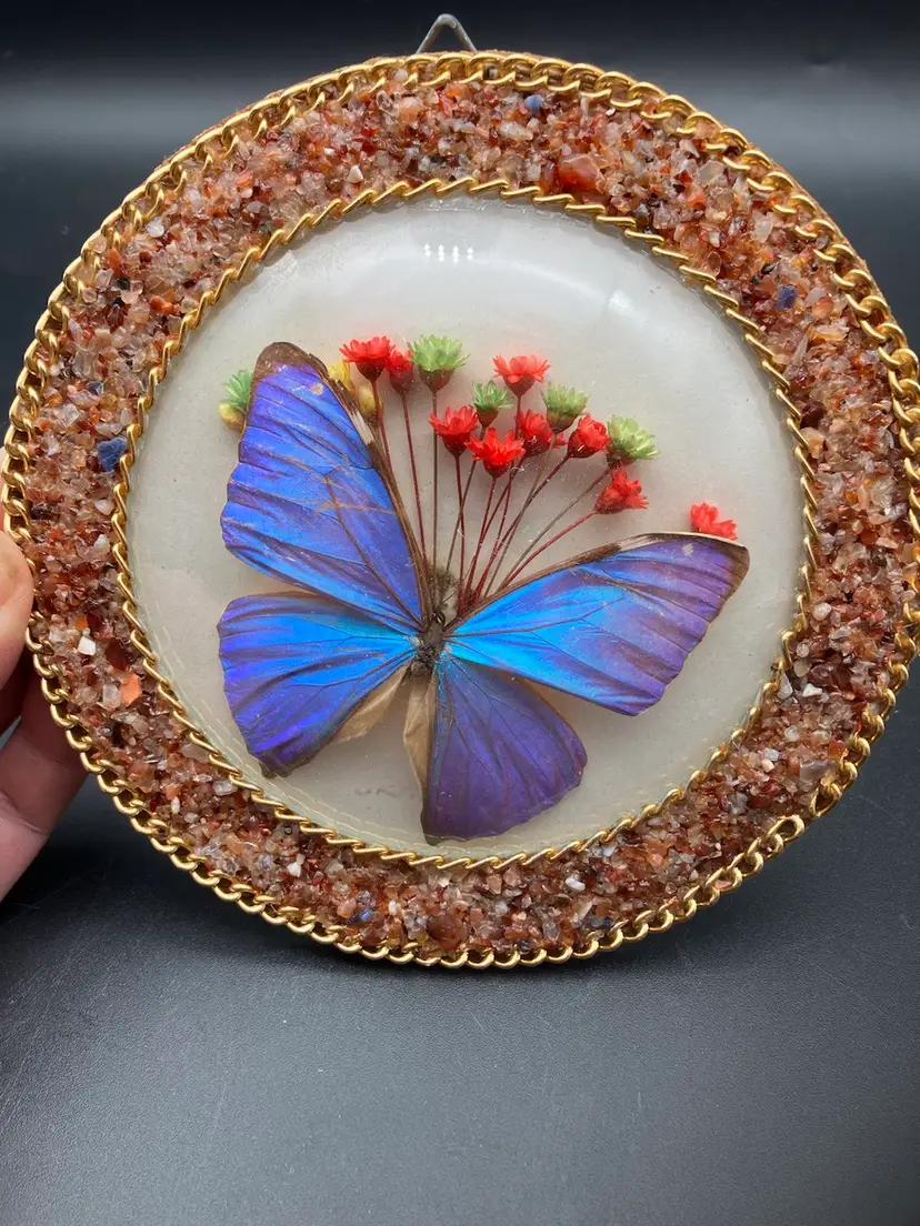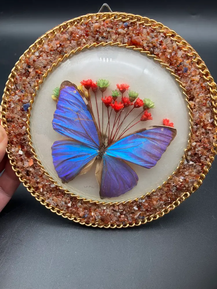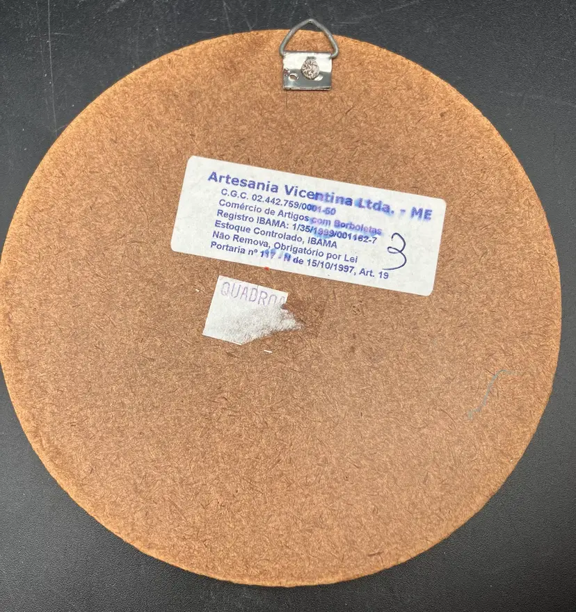 I believe this to be one of the blue morpho species of butterfly atop a few dried flowers. Dated 10/15/1997. Authorized by IBAMA butterfly control in Brazil with unique number. Beautiful piece in great condition. The word BRASIL under the butterfly is faded so it only looks like a discoloration under the bottom right wing. The back has a teeny bit of water damage on the tag (100% my fault). Truly a beautiful specimen.