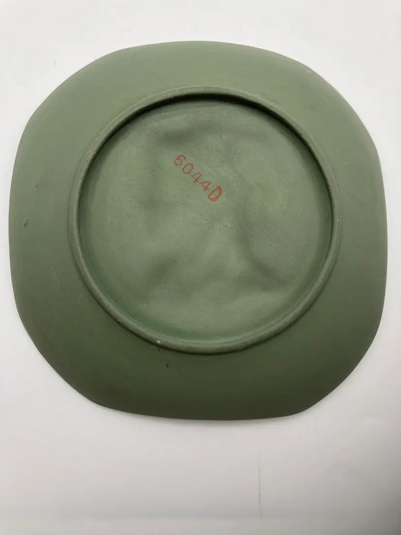 Square/octagon shape. ID’d in Facebook group as Possibly German, Schaefer Vater. Also possibly Japanese (I’m leaning German since figure in center has European features, but that is a guess). Stamped with a red 6044D on back. Truly excellent condition for age. No chips or cracks.