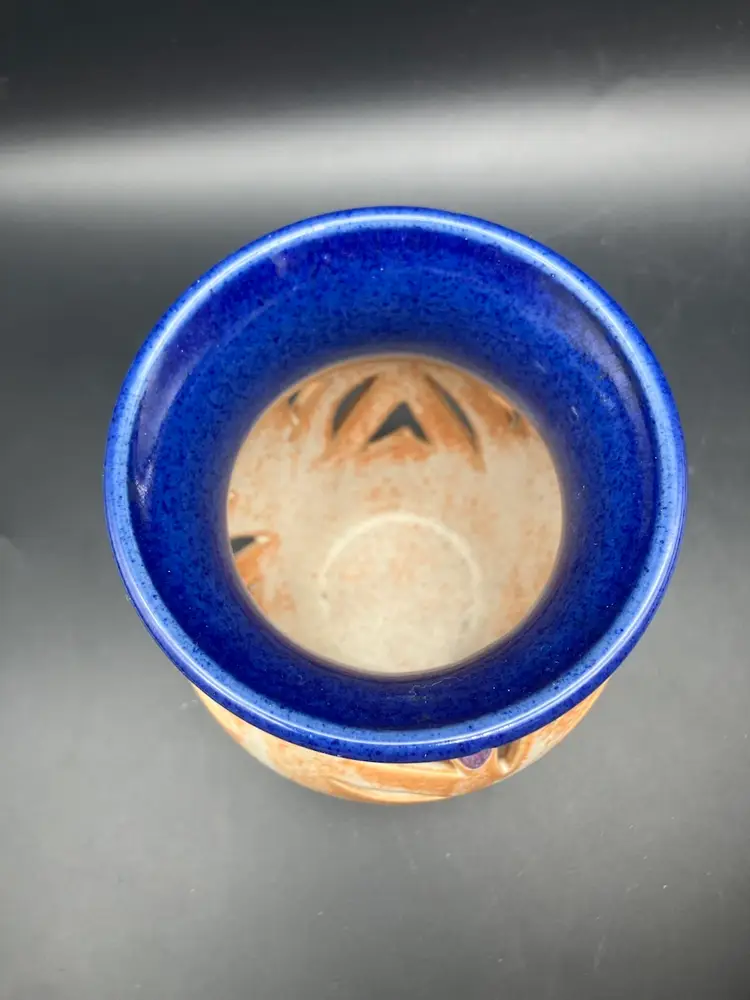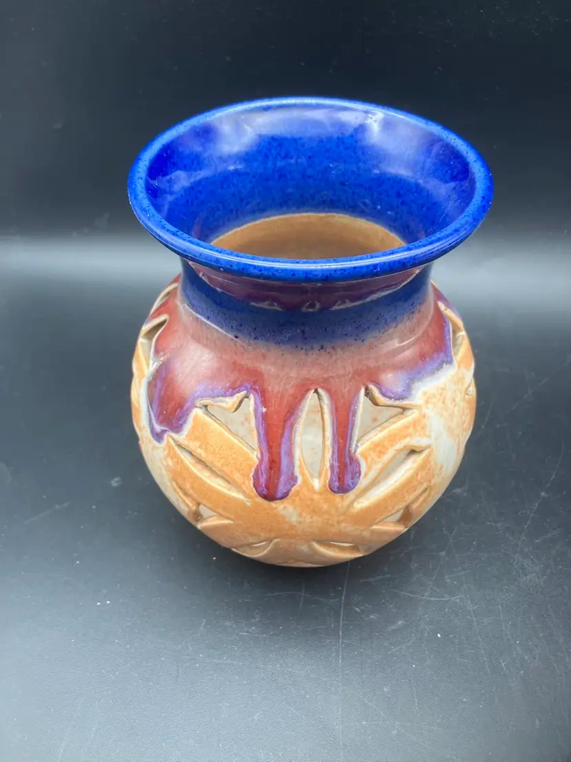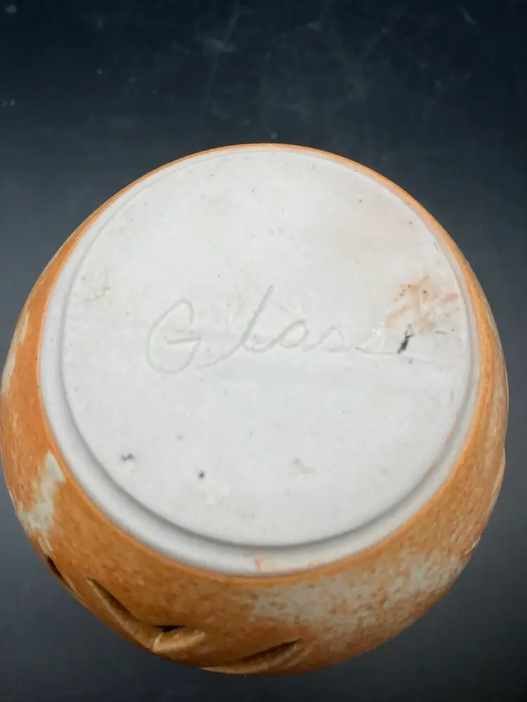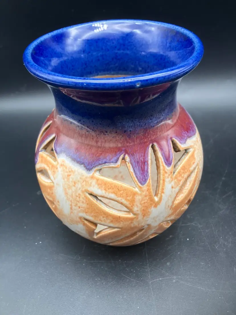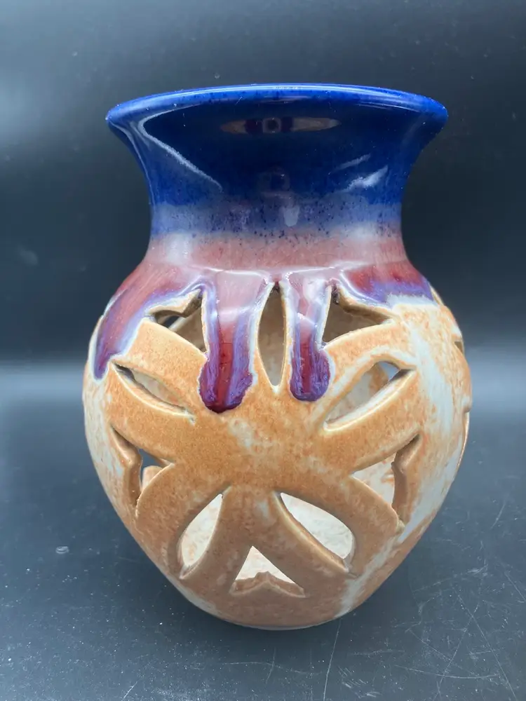 Beautiful vintage piece by Walt Glass Pottery of McQueeny, TX.Cutouts on 3 sides. Excellent condition. 6.25” tall by 4.75” diameter.