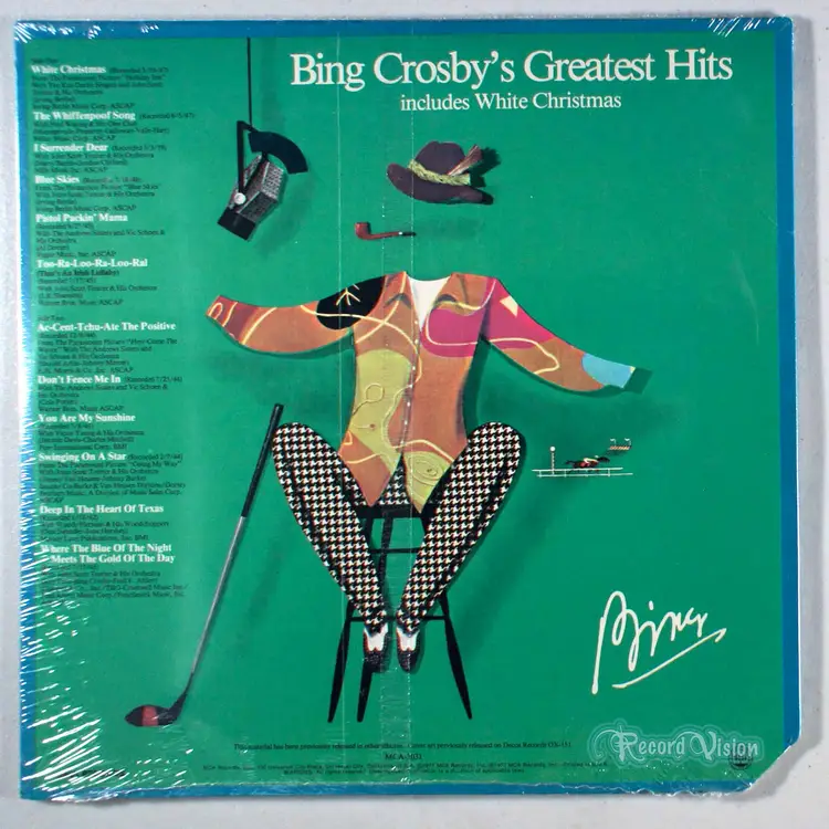 Greatest Hits is a collection of Bing Crosby hits. According to chart researcher Joel Whitburn, Bing Crosby hit the singles charts 361 times between 1931 and 1965, including 40 number one hits -- by far the most successful recording career of all time. Most of those hits were recorded for Decca Records, subsequently owned by MCA Records. In 1977 (the year of Crosby's death), when MCA came to compile an album called Bing Crosby's Greatest Hits, it began by limiting its choices to the most successful decade of Crosby's career, from the late '30s to the late '40s. Some of his biggest hits were here, to be sure: Swinging on a Star from the film Going My Way and the Andrews Sisters duet Don't Fence Me In, both long-running chart-toppers and gold records; the 1947 re-recording of White Christmas, which scored in the holiday season almost annually through 1962; and such big hits as Ac-Cent-Tchu-Ate the Positive and Pistol Packin' Mama (both also featuring the Andrews Sisters). The album peaked at #98 on Billboard 200.