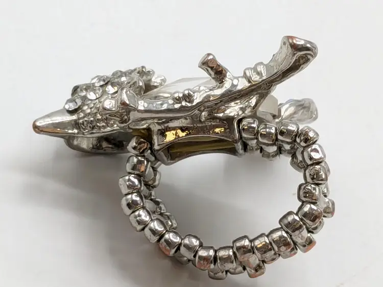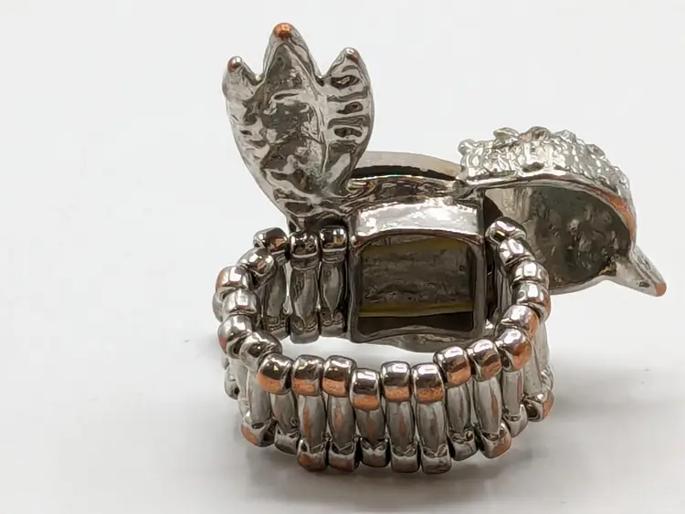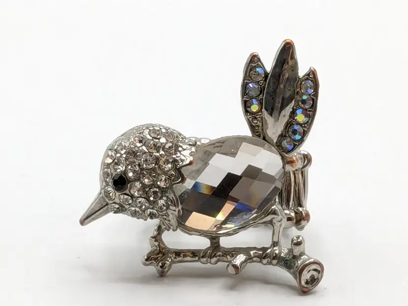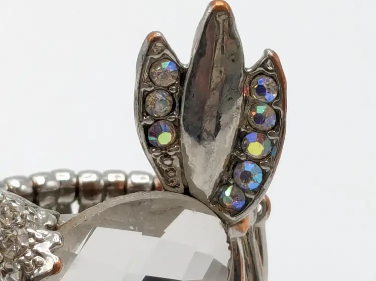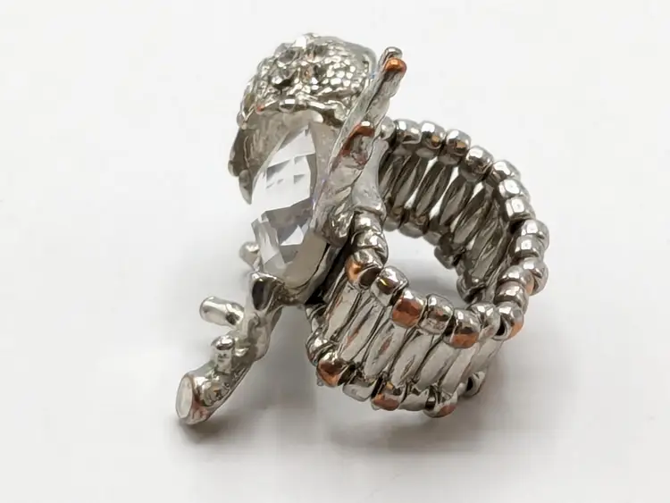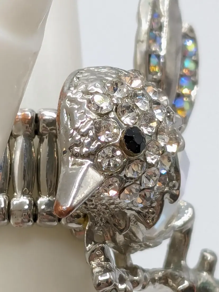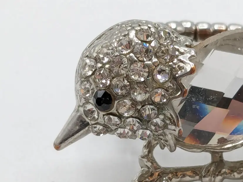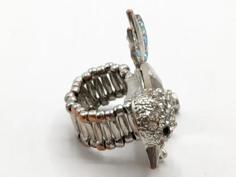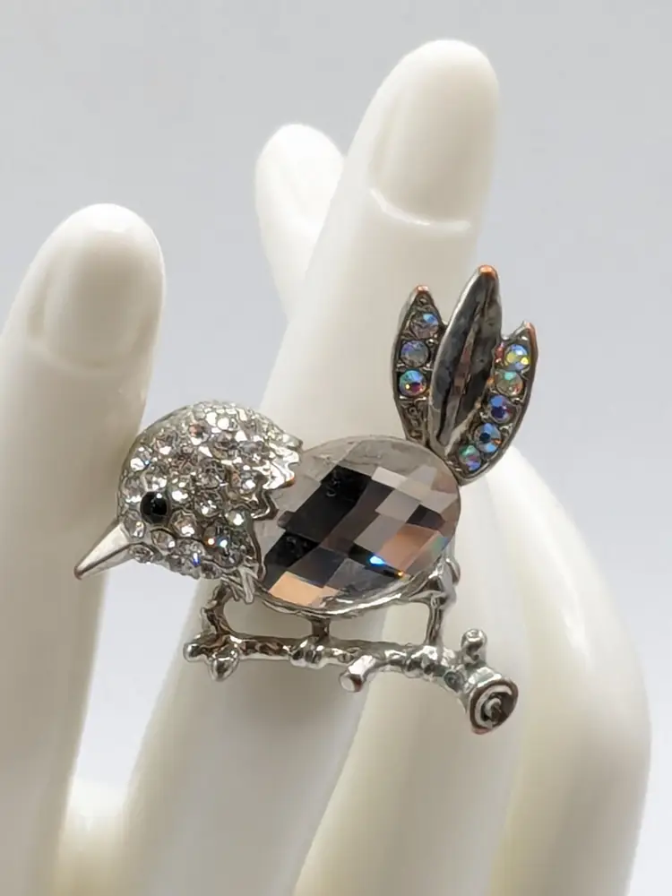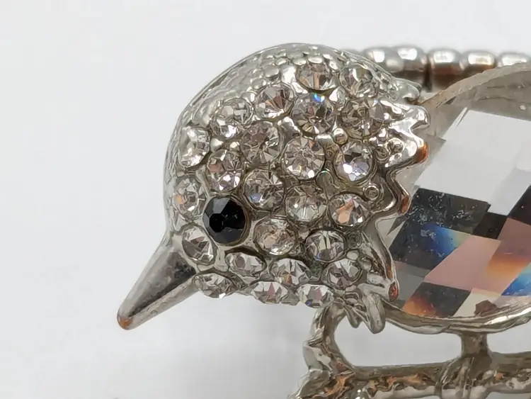 Good condition. Silver tone. All stones are present. As well as a ring it could also set on your shelf as a little bird figurine. Measures 7 1/2" but is stretchable.