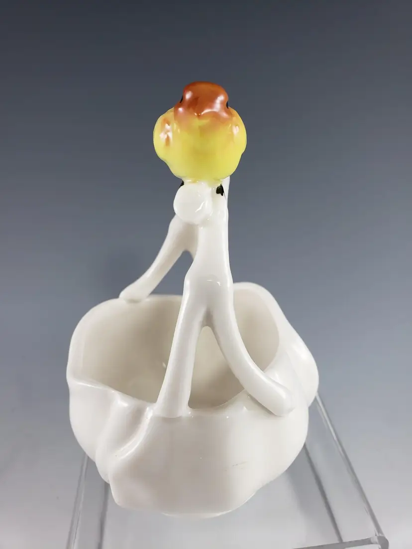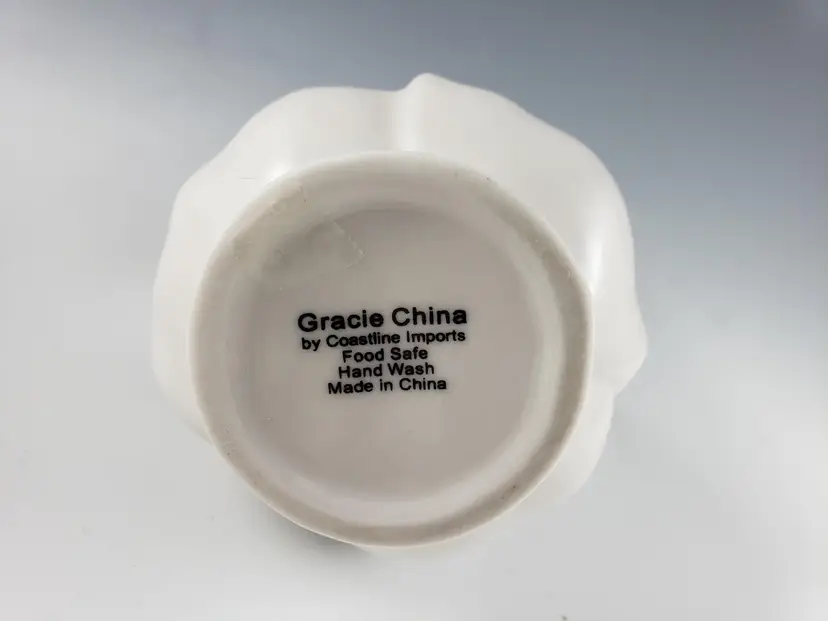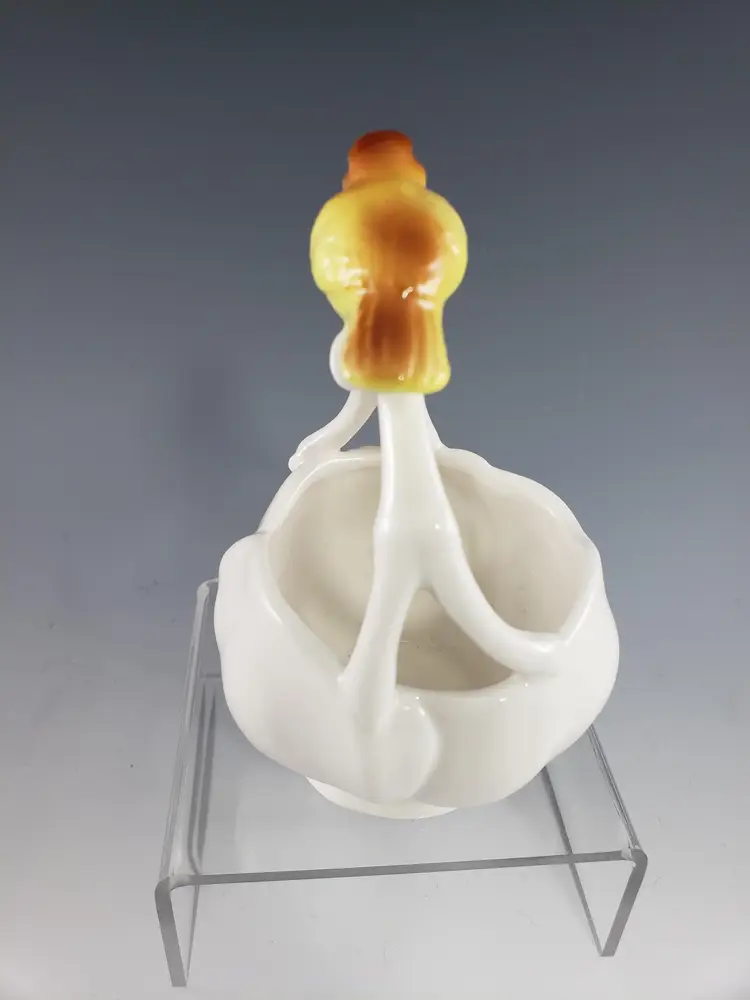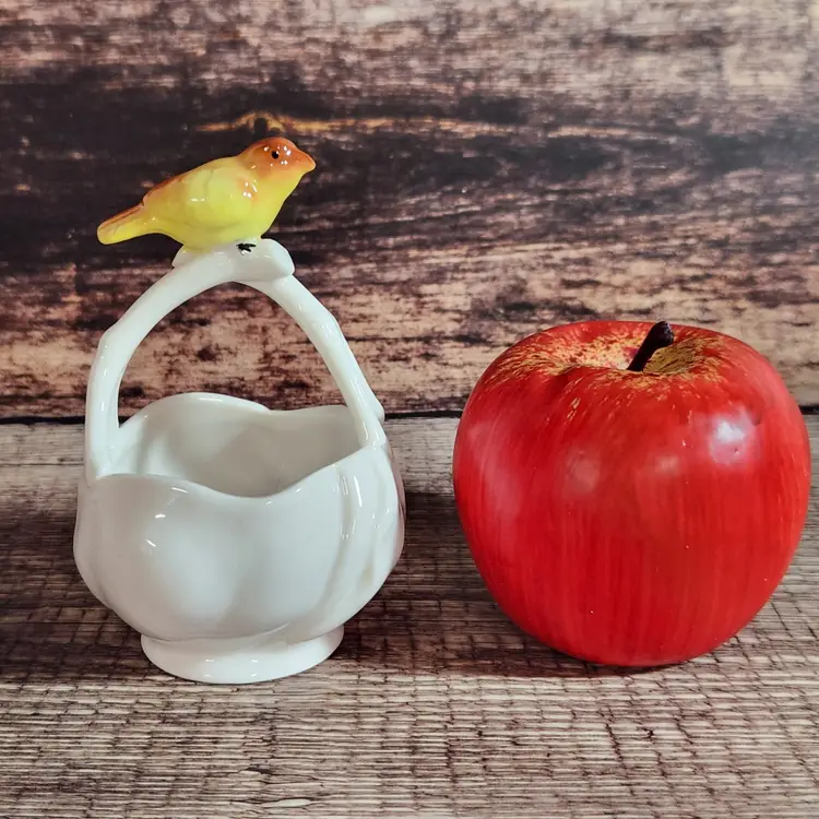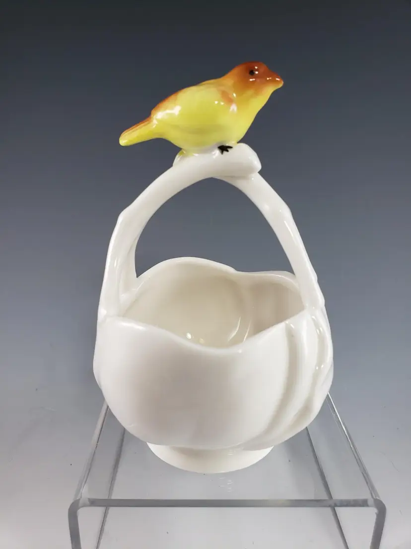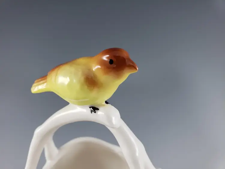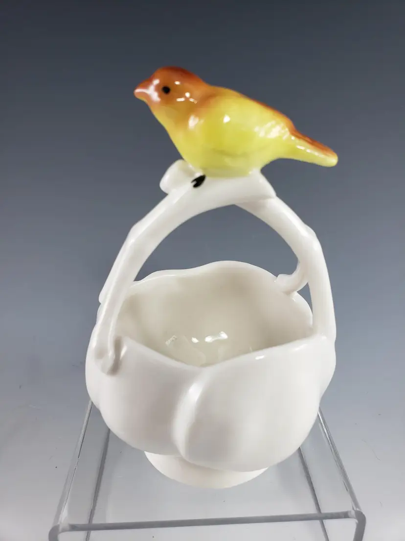 Delicate small china basket bowl with a tiny brown/yellow bird perched on a twig handle. The basket part appears to be a tulip or lotus flower blossom. Made by Gracie China, I don't know if this is bone china but it does feel like a fine quality porcelain. This can be used as a figurine - would be very nice in a spring/easter display but could also be used as an elegant coin or ring dish.