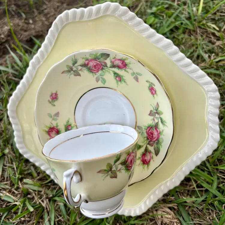 Upcycled vintage & antique China And Glass tea cups, saucers, salad or desert plates into Birdfeeders. They can be used outdoors on any 1/2” pole, pvc, old broom handle, etc. We also include a ‘lil starter bag of bird seed. If squirrels are your concern, we sell 1” slinky’s you can place over the pole.