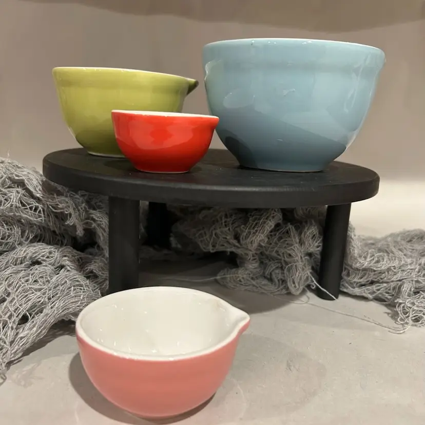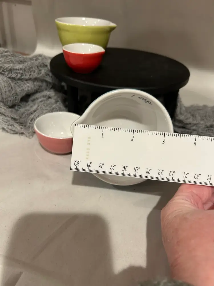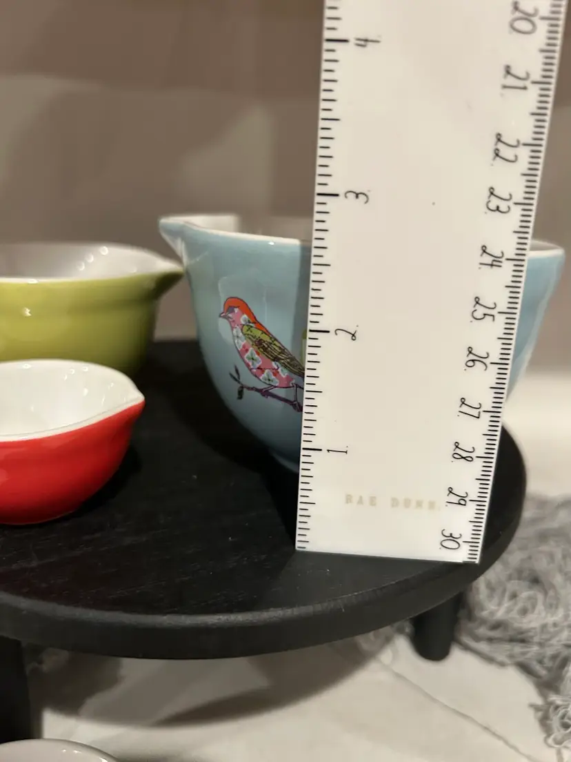 One design on large cup. Others in varied colors but no design. Measurements on each cup.