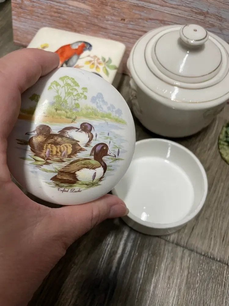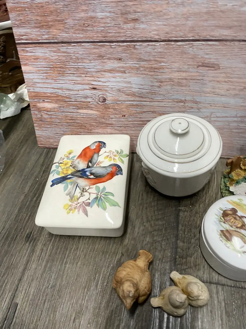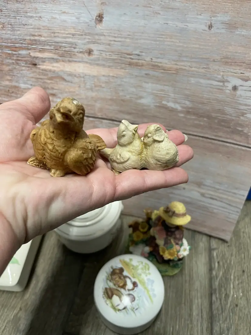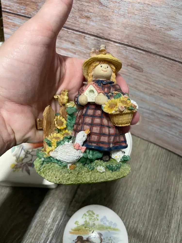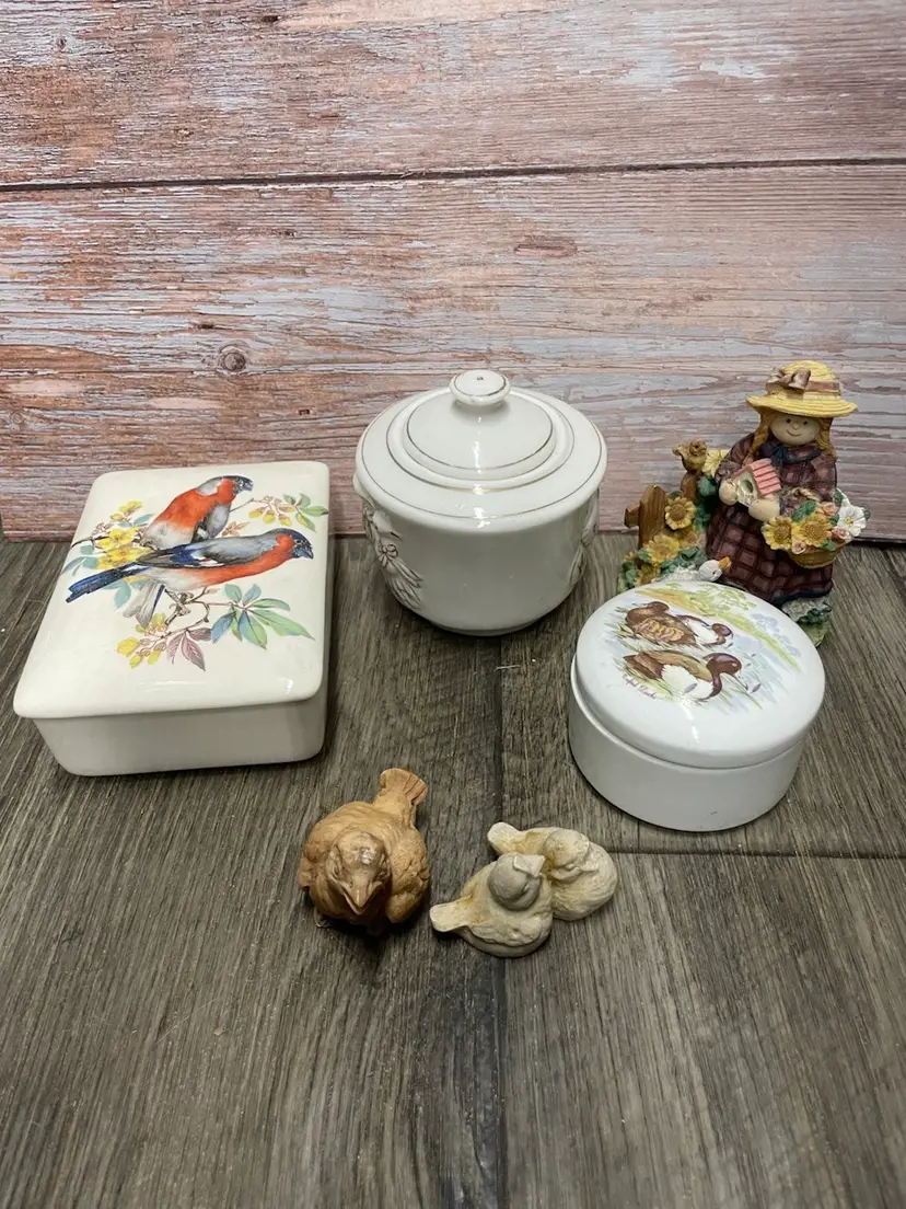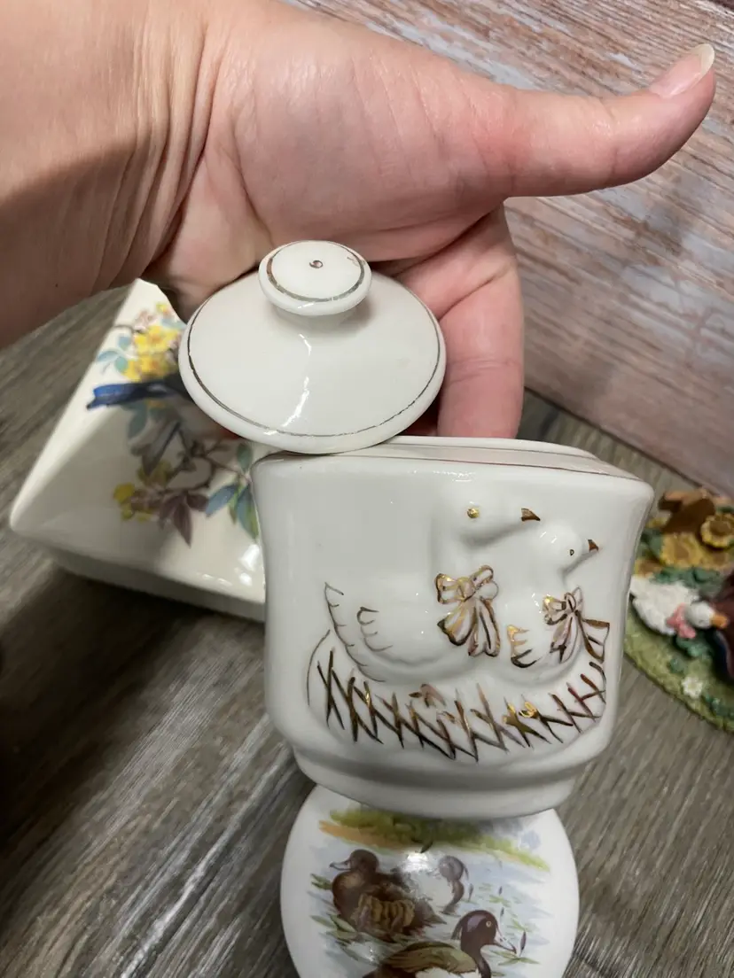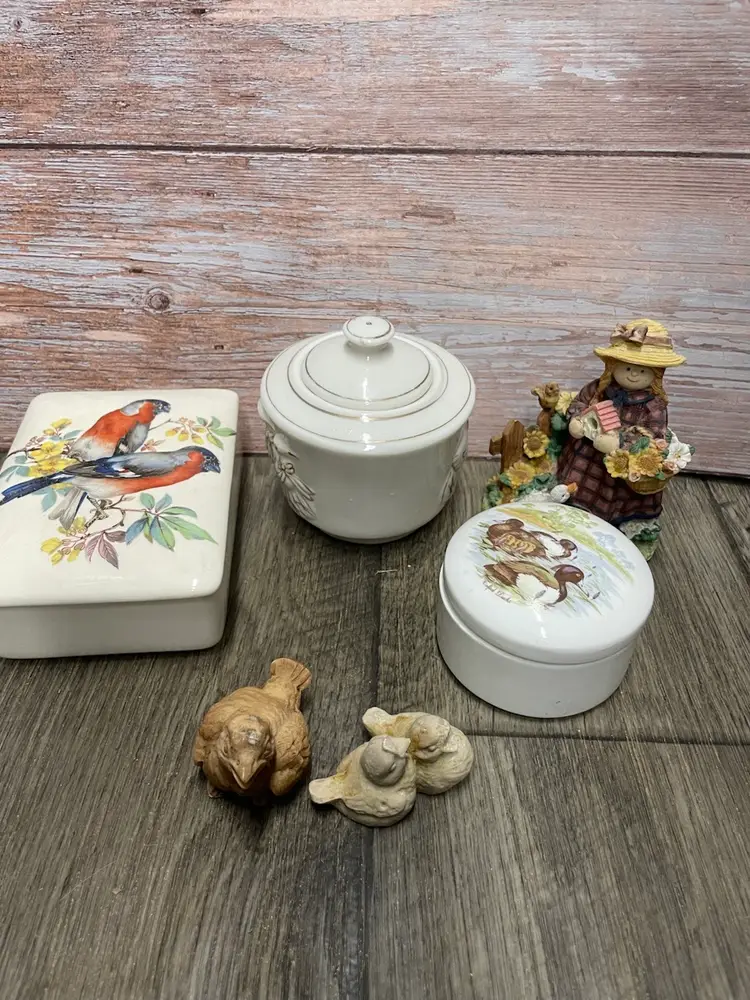 Holland mold trinket box with two blue birds on the front. Sugar bowl with Gould accents with ducks. Small round trinket box with tufted ducks on lid. Single brown bird resin marked 1977 and 2 birds together resin. And resin girl figurine with bird on a fence and duck at her feet