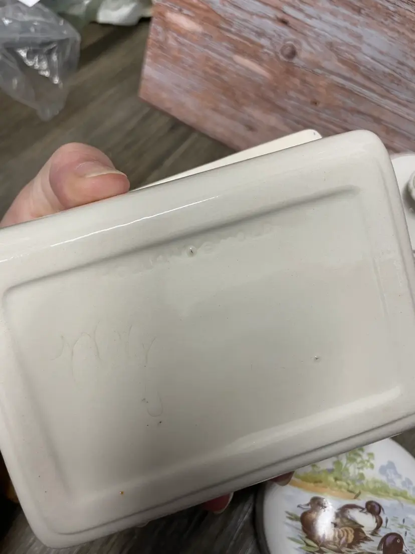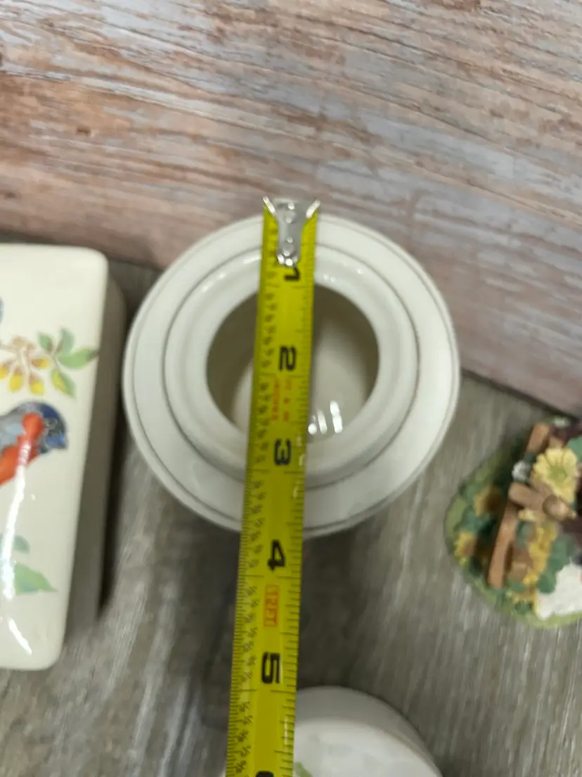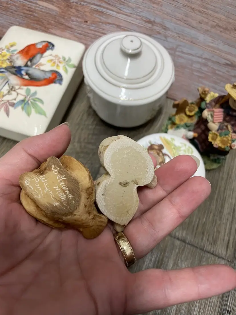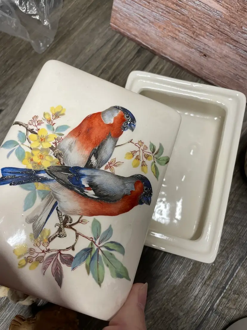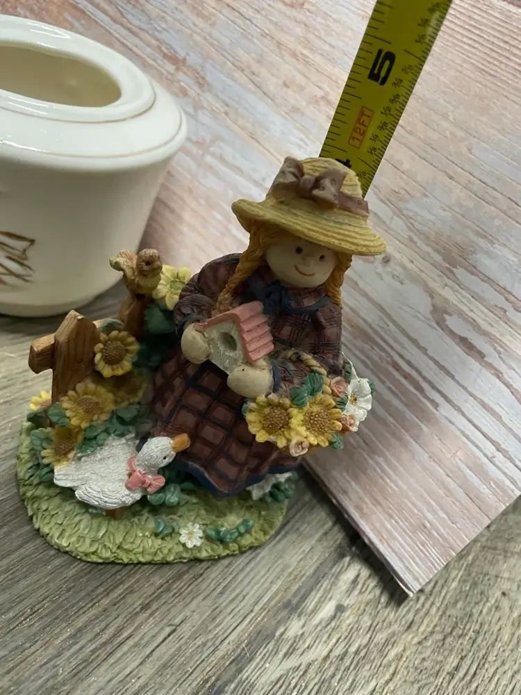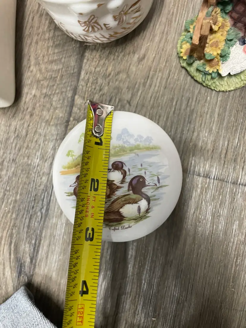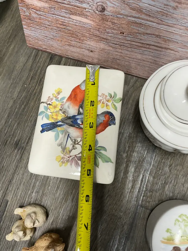 Holland mold trinket box with two blue birds on the front. Sugar bowl with Gould accents with ducks. Small round trinket box with tufted ducks on lid. Single brown bird resin marked 1977 and 2 birds together resin. And resin girl figurine with bird on a fence and duck at her feet