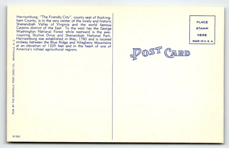 Number of Items in Set: 1 Unit of Sale: Single Unit Artist: Unknown Occasion: Sayings & Quotes Size: Standard (5.5 x 3.5 in) Signed: No Custom Bundle: No Year Manufactured: 1940 Material: Paper City: Harrisonburg Original/Licensed Reprint: Original Franchise: Does Not Apply Brand/Publisher: Asheville Subject: Ariel View Continent: North America Type: Linen Postcard Era: Linen (1930-1945) Region: Virginia Country: USA Theme: Agriculture, Architecture, Cities & Towns, Community Life, Greetings, Landscapes, Roadside America, Travel, Buildings Features: Divided Back Time Period Manufactured: 1950-1959 Country/Region of Manufacture: United States Postage Condition: Unposted