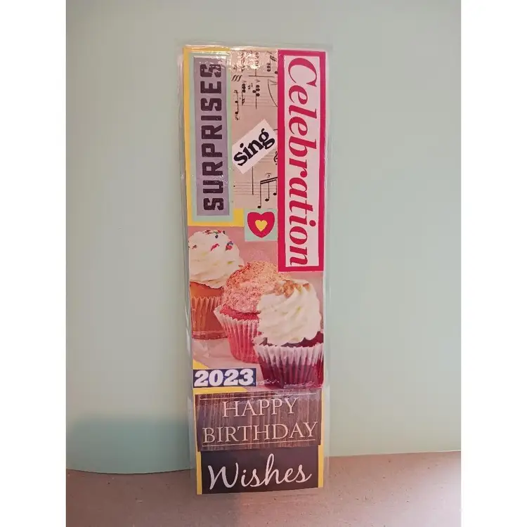 Front and back pictured. All content sourced from old magazines from 1940s to present, and an occasional found sticker. Unique one-of-a-kind art piece. Approximately 8 3/4" x 2 3/4".