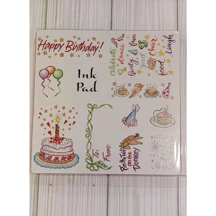 Add festive flair to your crafts with this Birthday Celebration Stamp Sets. Featuring colorful designs like cakes, balloons, and cheerful phrases, it's perfect for scrapbooking, card making, and junk journaling. Celebrate in style with these vibrant stamps! Contains 10 stamps. Ink pad no longer usable. One stamps used, others never used.