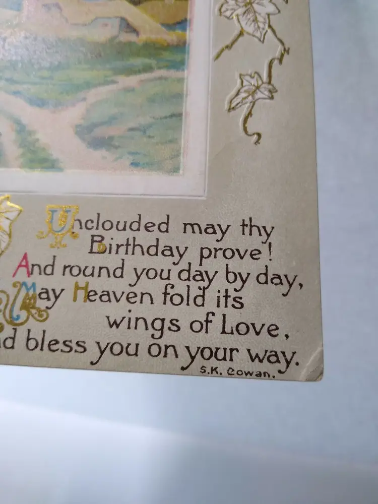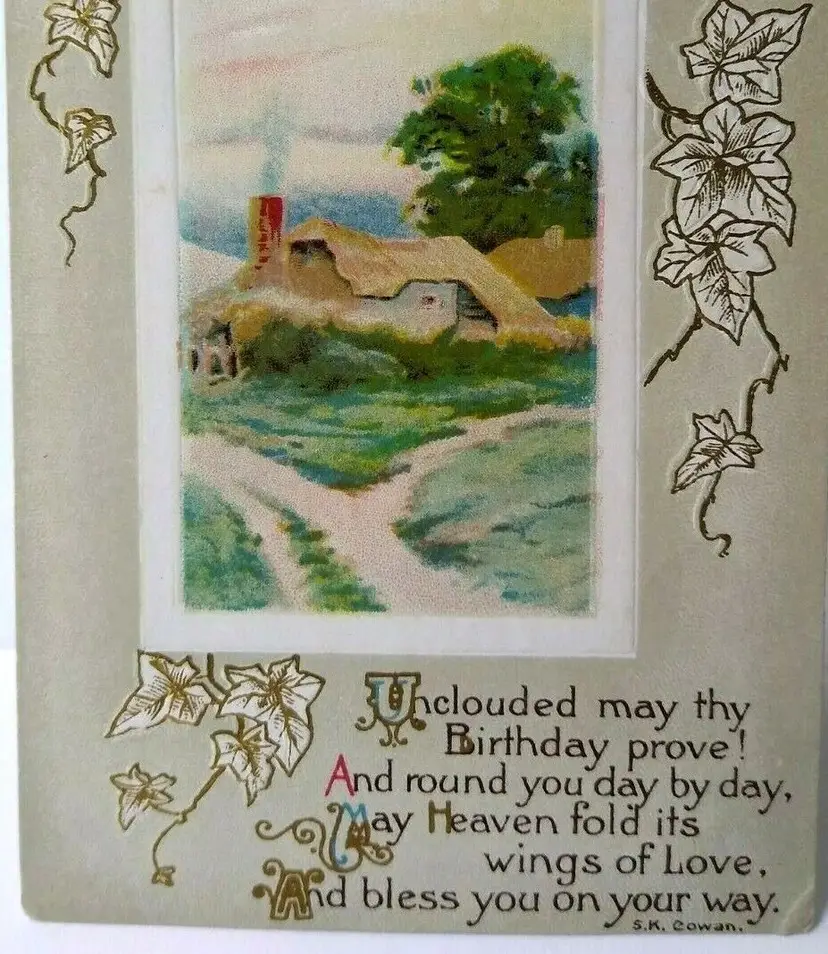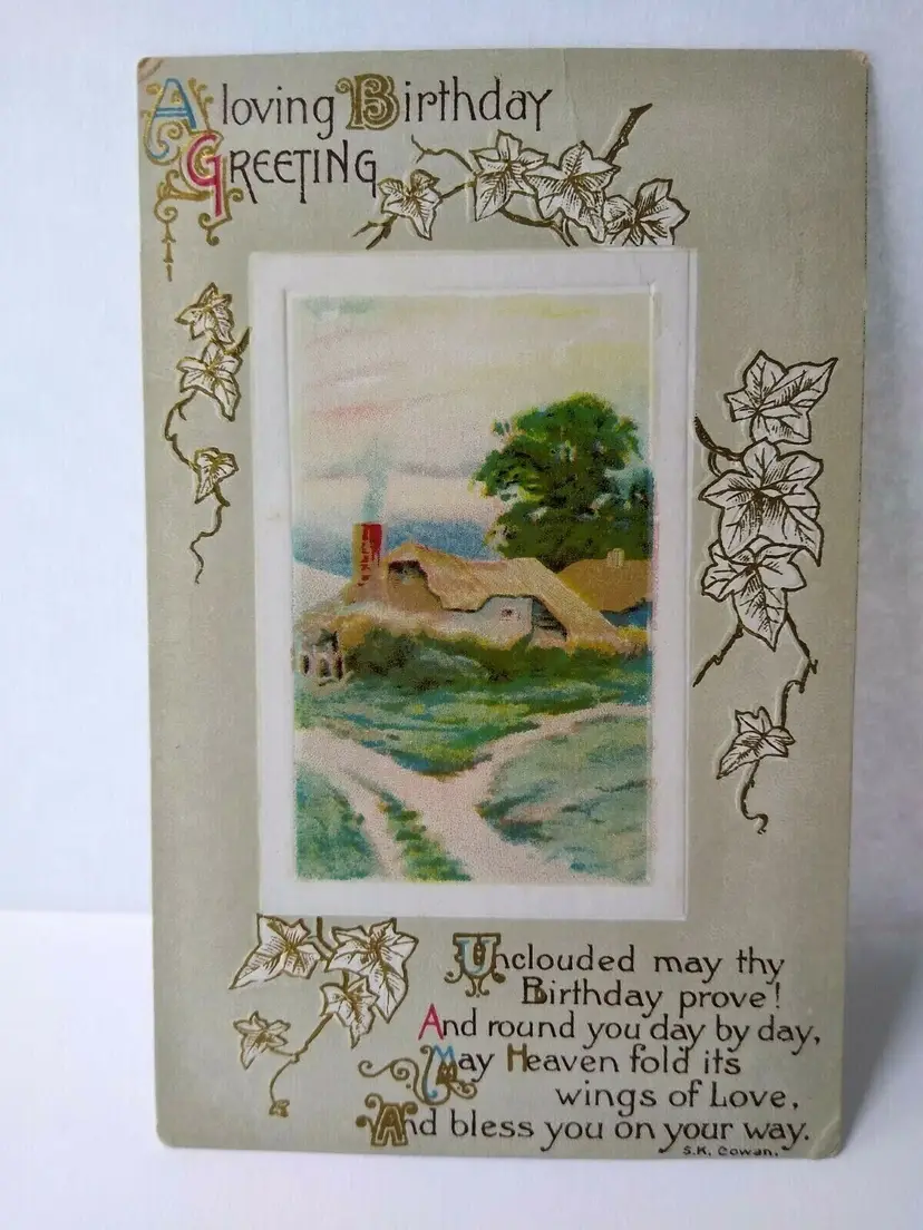 Size: Standard (5.5 x 3.5 in) Custom Bundle: No Type: Printed (Lithograph) Number of Items in Set: 1 Signed: Yes Original/Licensed Reprint: Original Signed By: S.K. Cowan Occasion: Birthday Time Period Manufactured: 1900-1919 Unit of Sale: Single Unit Era: Pre-War (Pre-1914) Artist: S.K. Cowan Country/Region of Manufacture: Unknown Material: Paper Theme: Art, Countries, Greetings, Holiday, Landscapes Features: Divided Back, Embossed Subject: Country Postage Condition: Unposted Brand/Publisher: Unbranded Year Manufactured: 1910