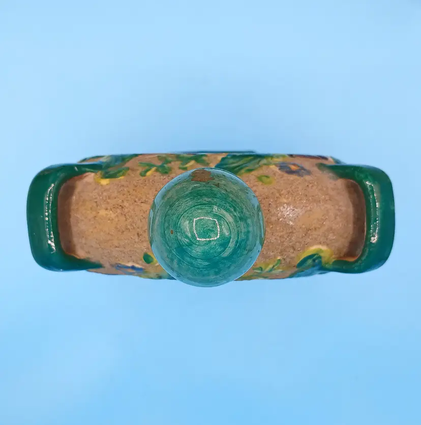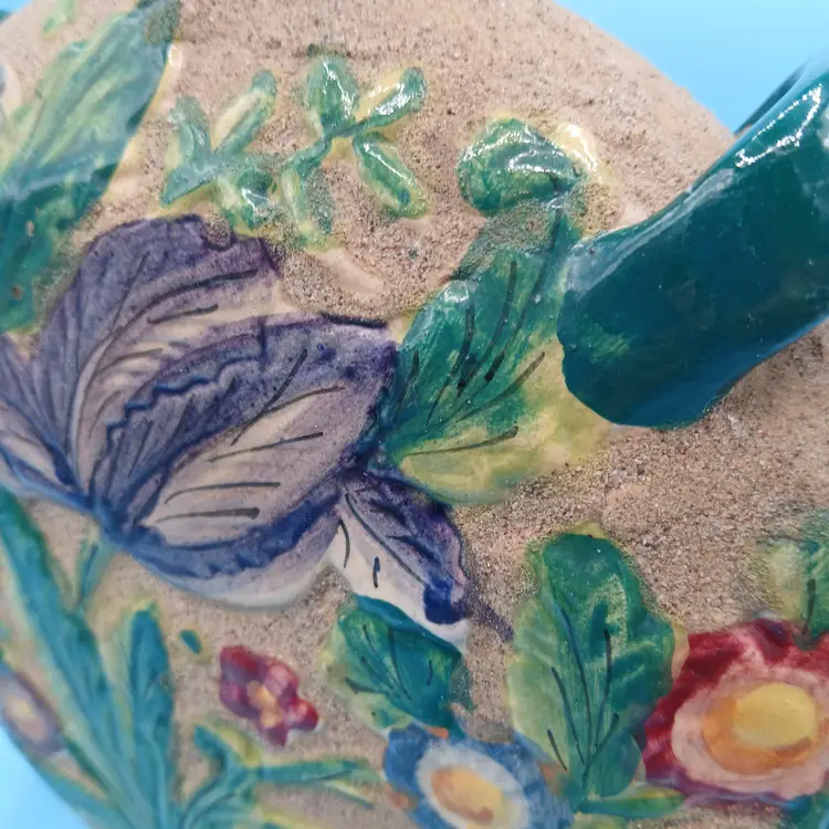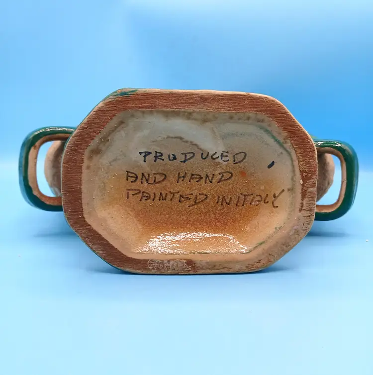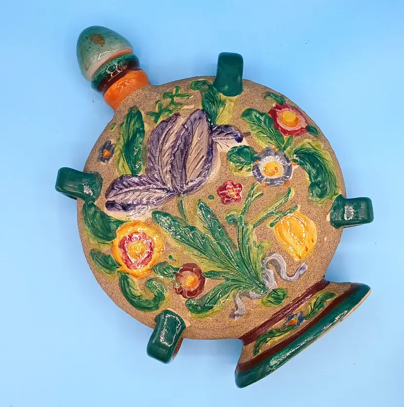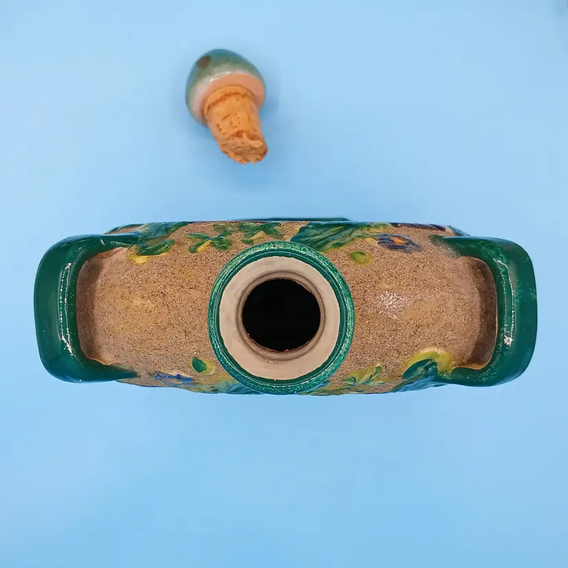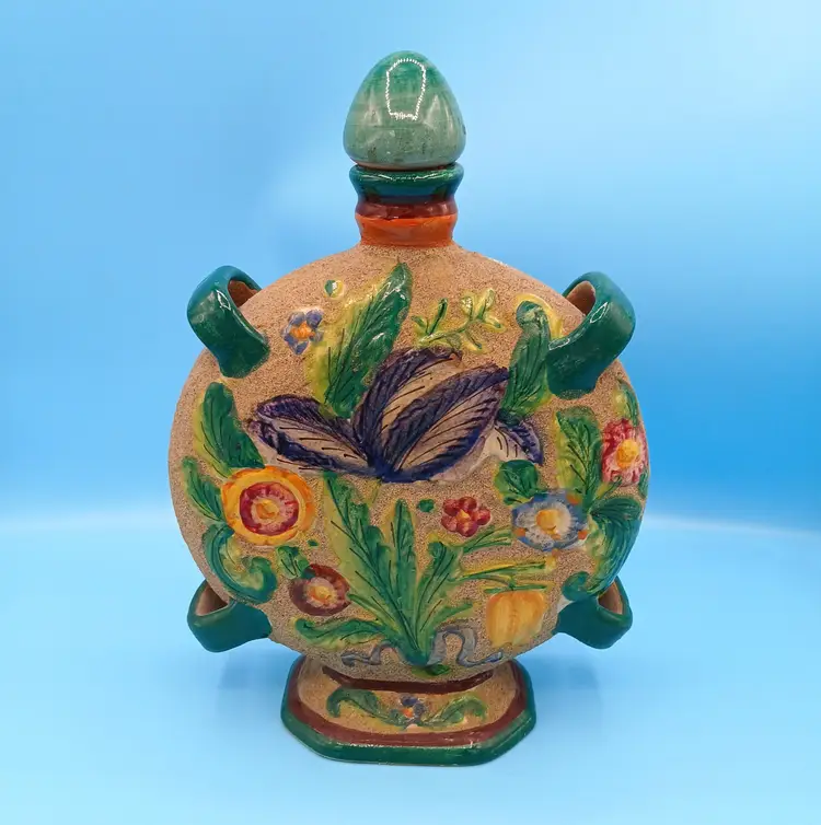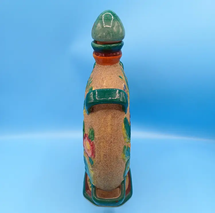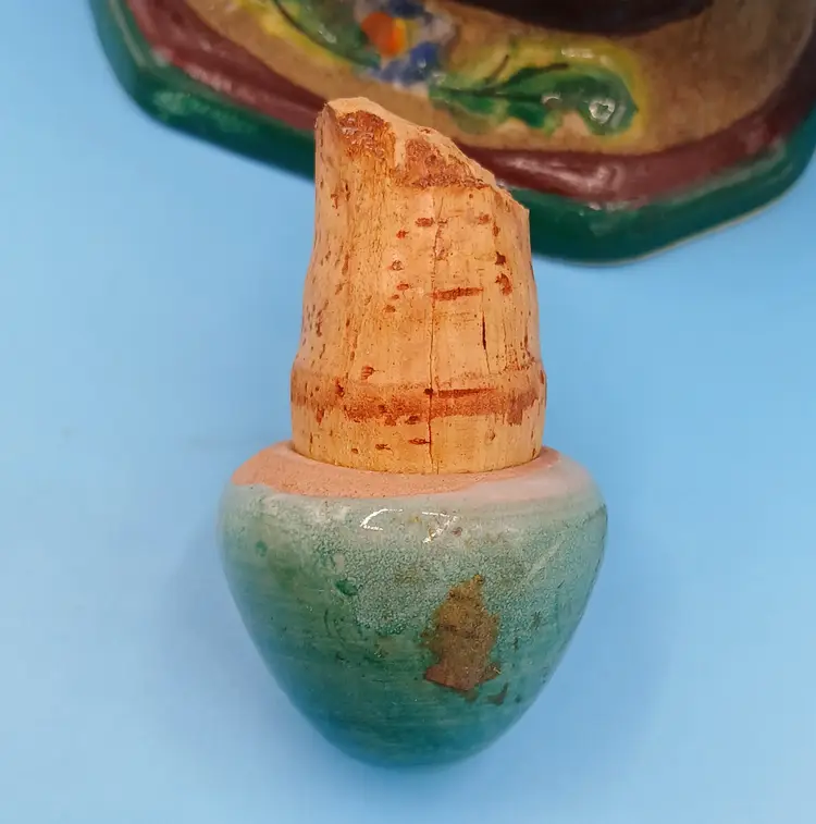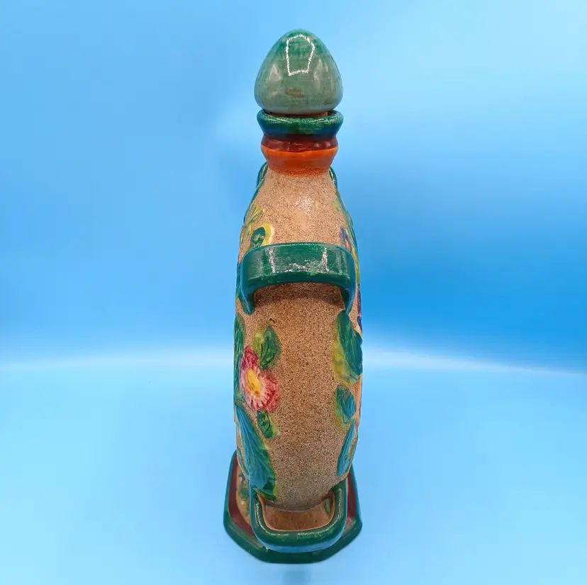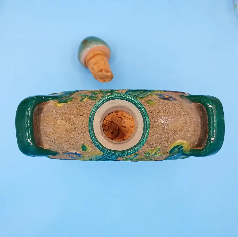 I took the lid off while photographing and the cork broke. The rest is inside the bottle. There's no liquid but a strong brown sugar smell. There's no other damage to this beautiful handmade Italian decanter. The texture feels like sandstone with vibrant florals. And the glaze looks very interesting under UV light. Slightly over 10" x 7". This is a standout piece for your bar or kitchen. Thanks for looking!