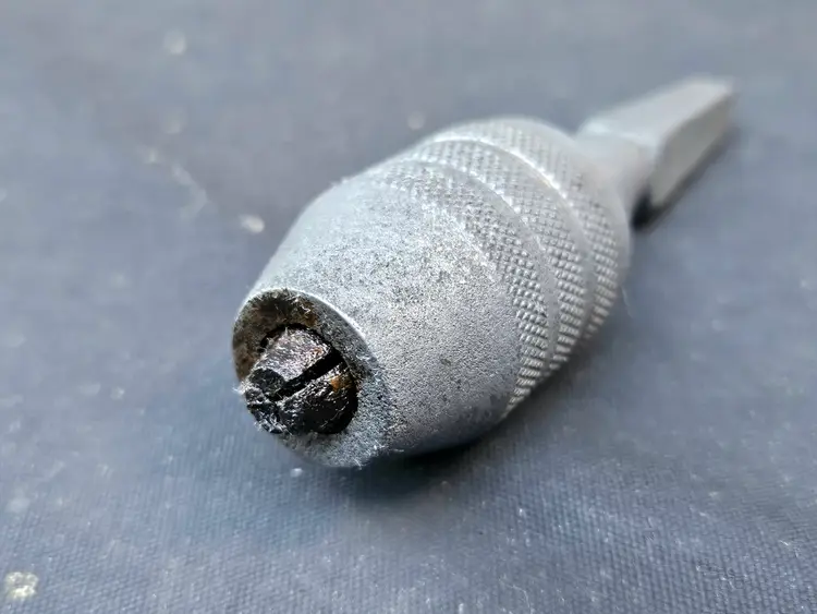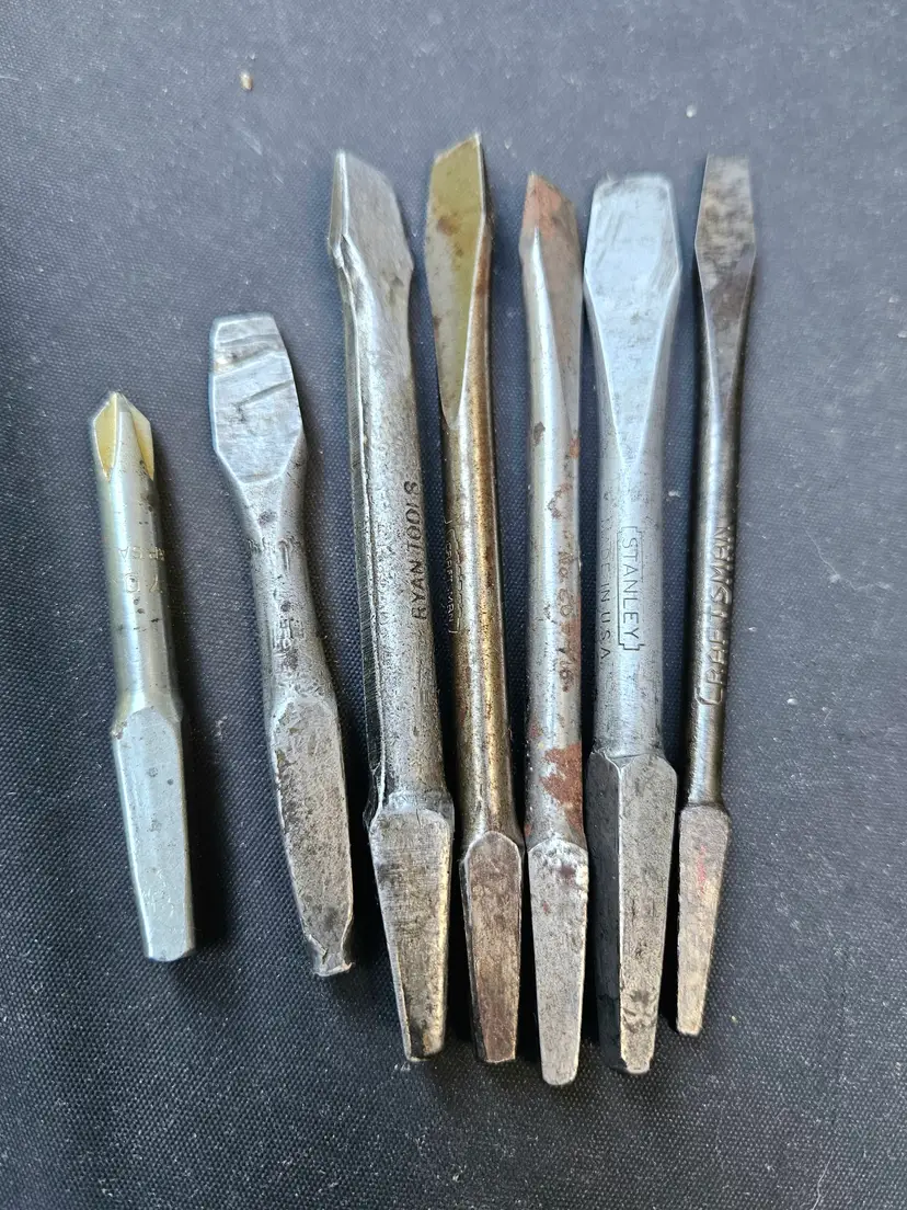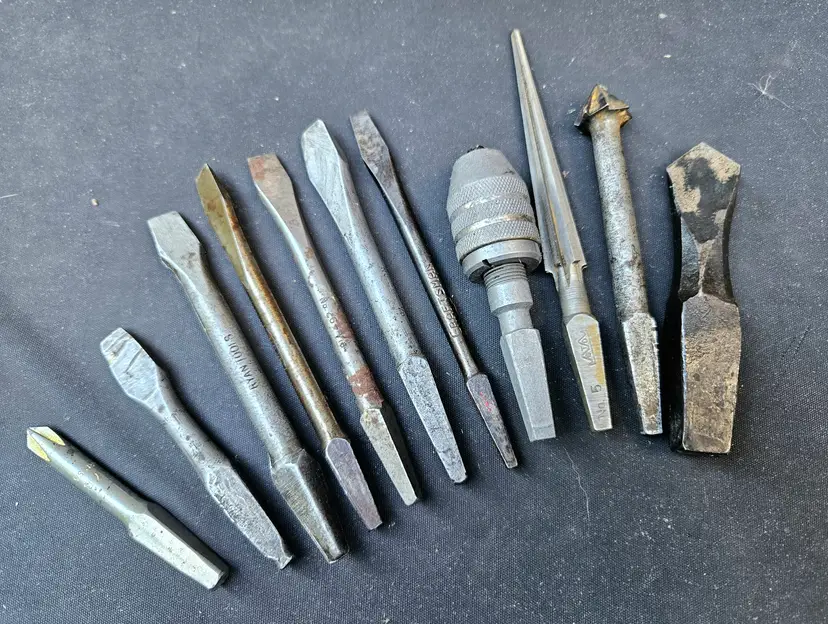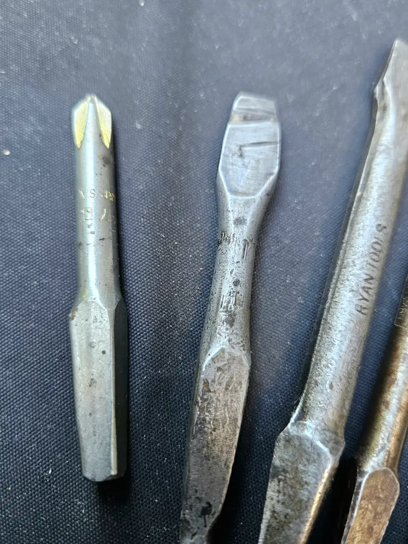 Set includes (1) countersink, (1) 3-jaw chuck, (1) tapered reamer #5, (1) Phillips, (6) flat blade drivers and (1) misc bit. All various makers - Stanley, Craftsman, Greenfield Tool & Die (GTD), Ryan tools and others unmarked. The 3-jaw chuck is free, but in need of a good internal spring cleaning.