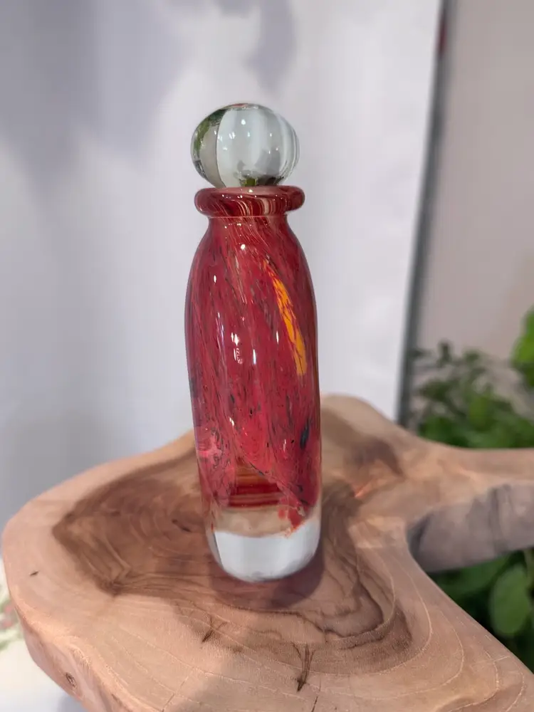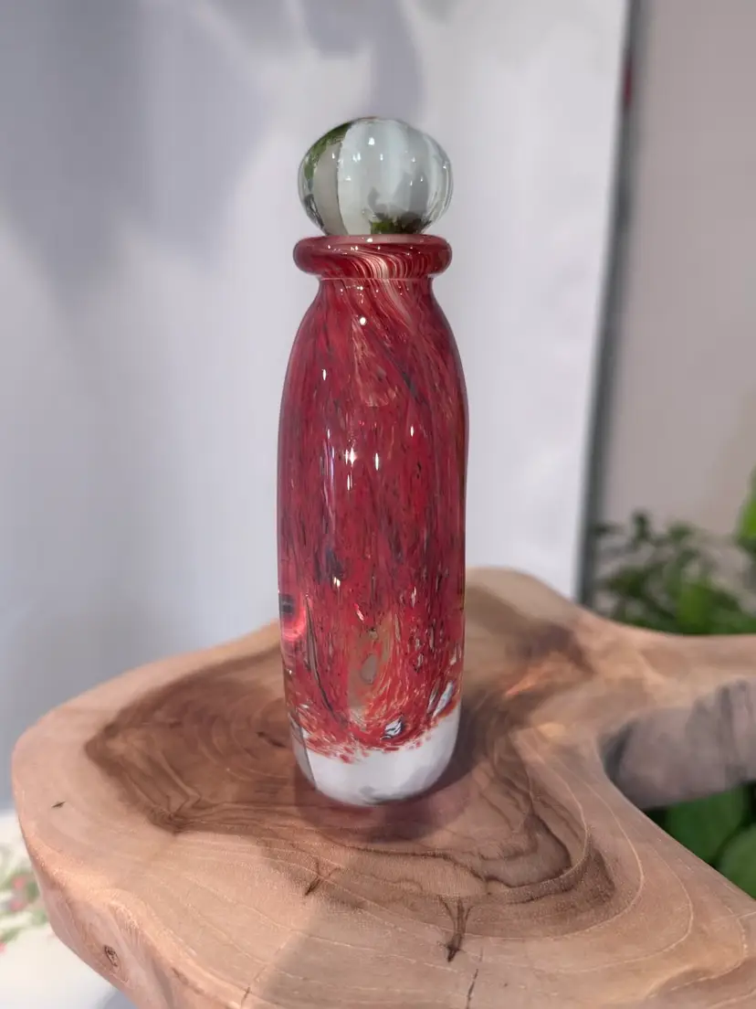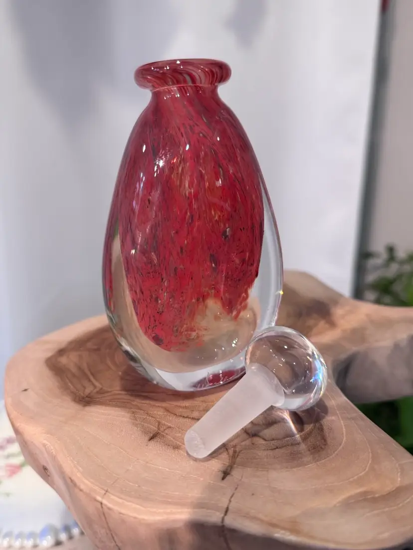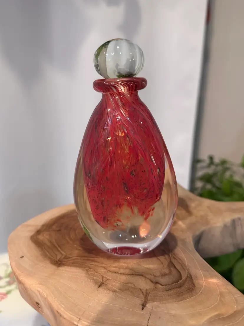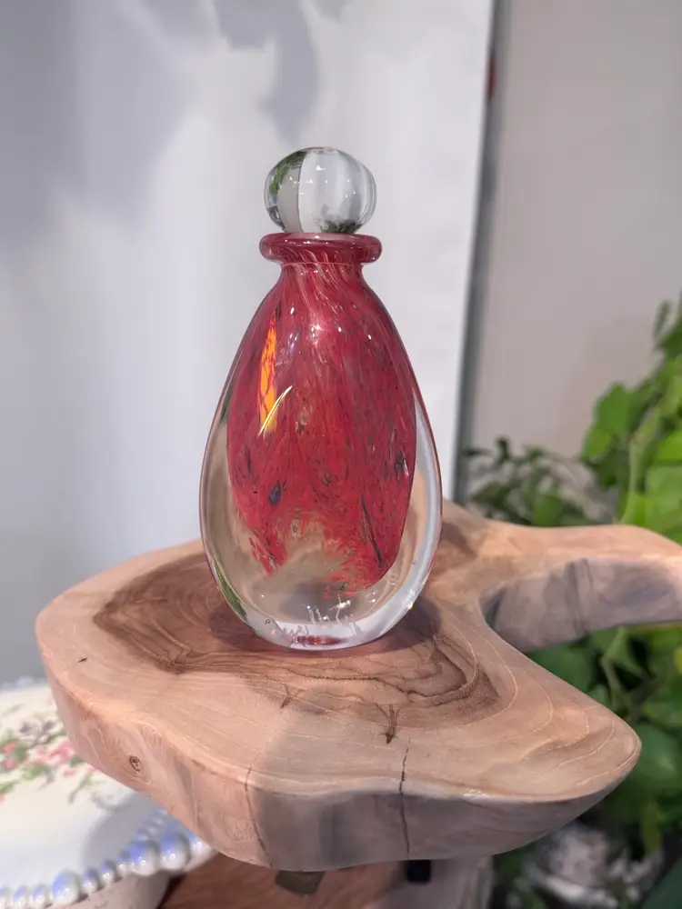 Amazing glass perfume bottle. Signed by artist in 1996. No chips no cracks. Really cool color mixture. Measures 5 inches tall.