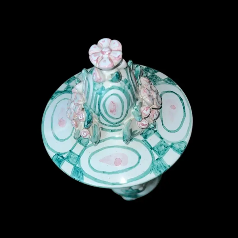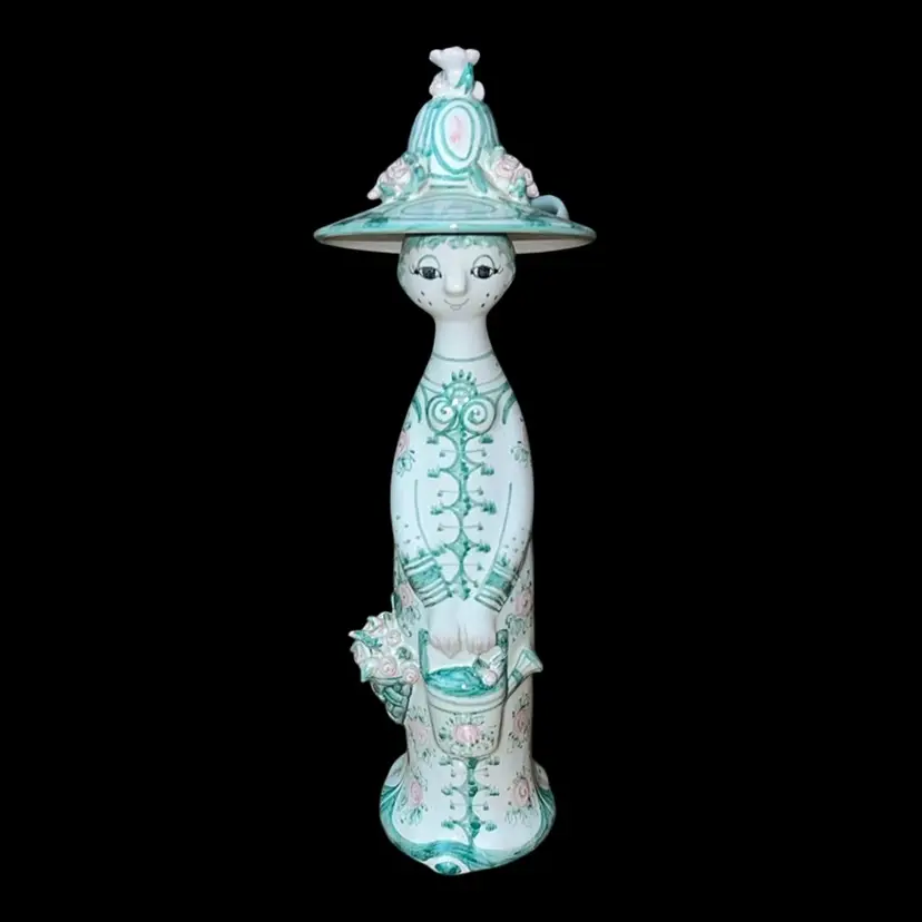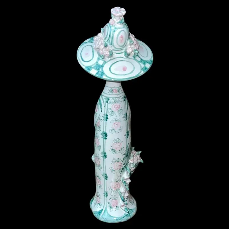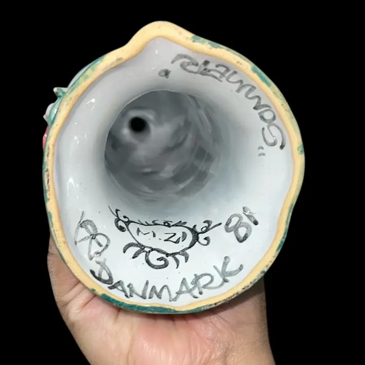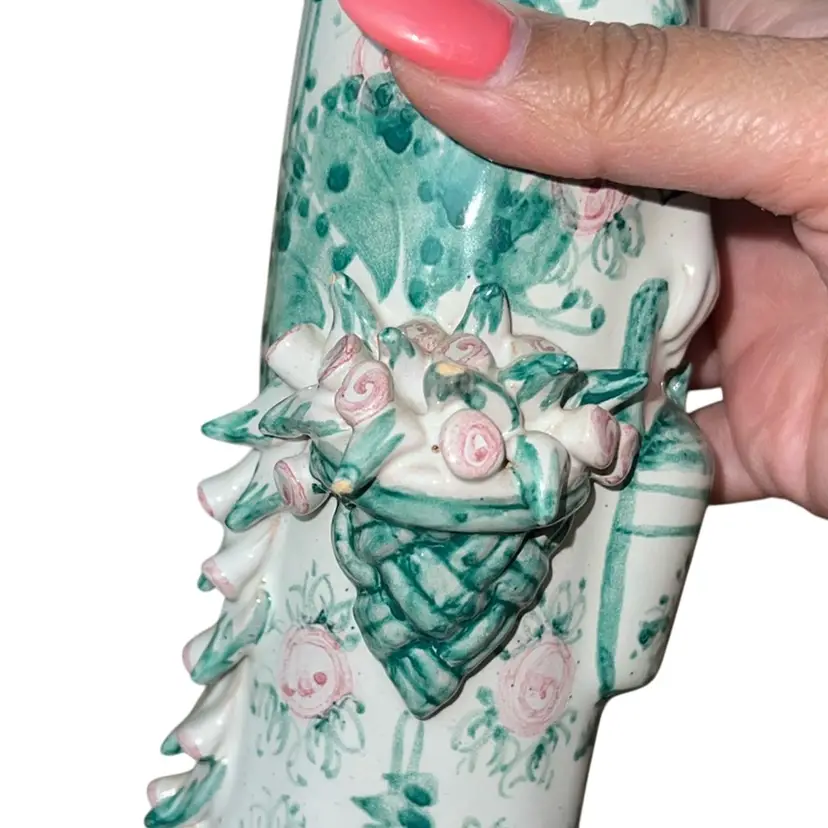 in really excellent condition. There are some paint chips on the flowers if you look at the photos. I don’t think they’re actually ceramic chips. If they are, they are very slight flea bites. No chips or cracks. In otherwise perfect condition. 14” tall