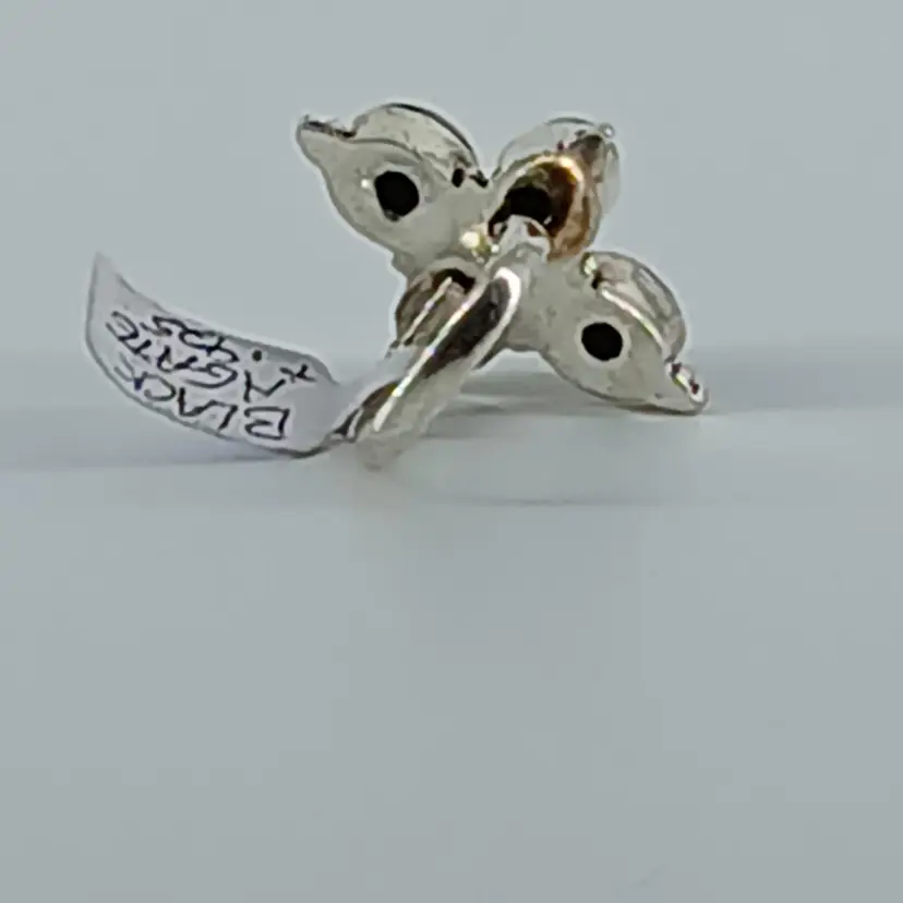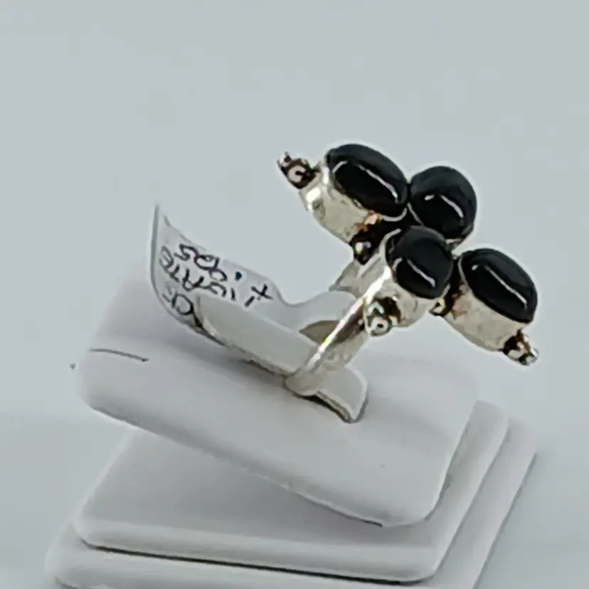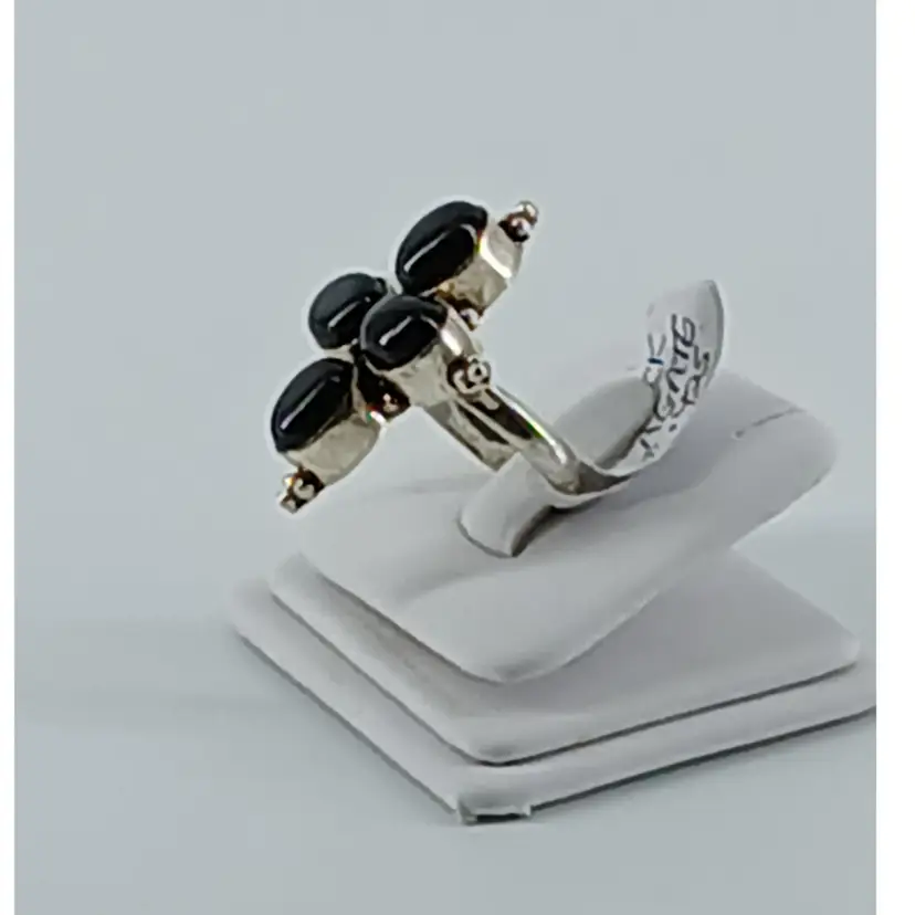 Four Black Agate Gemstone Cabochons that measure 5/16x 7/16 inches have been mounted into a Sterling Silver Ring setting size 8.