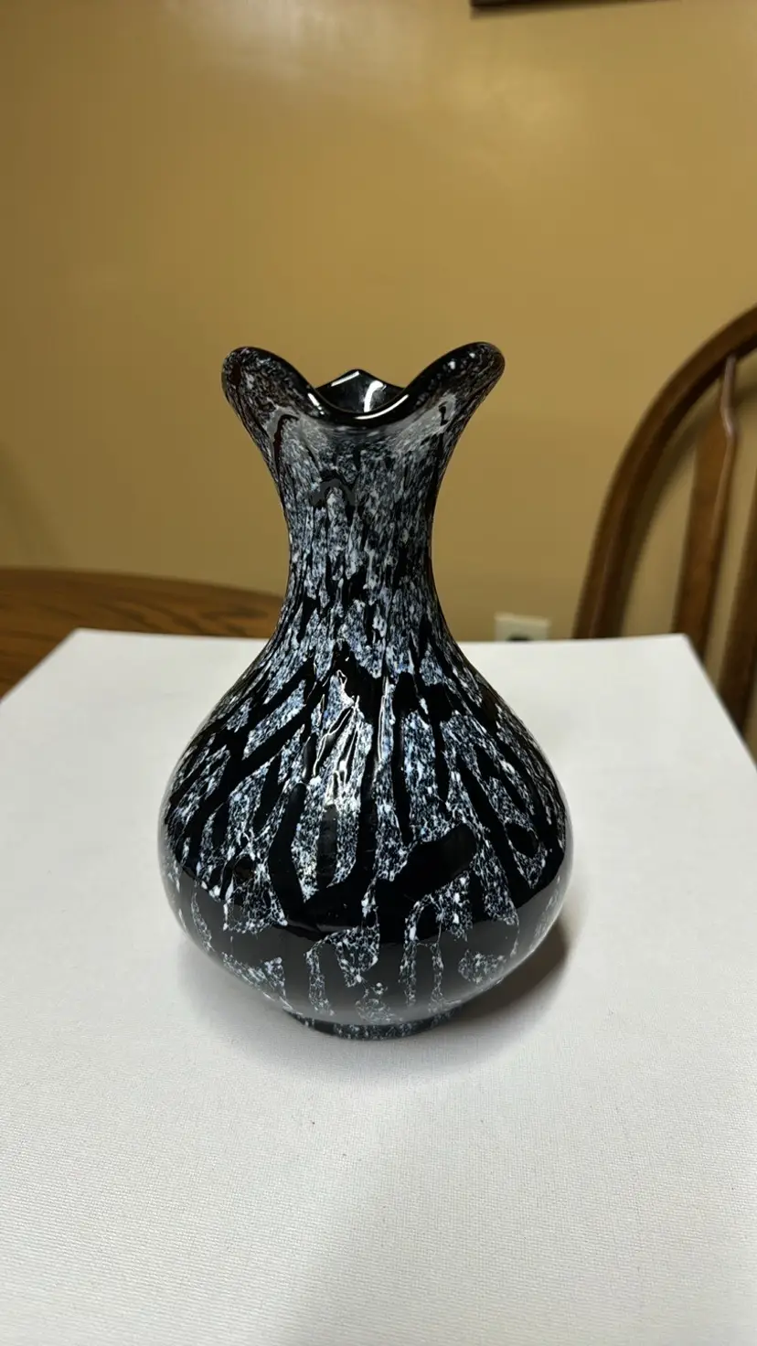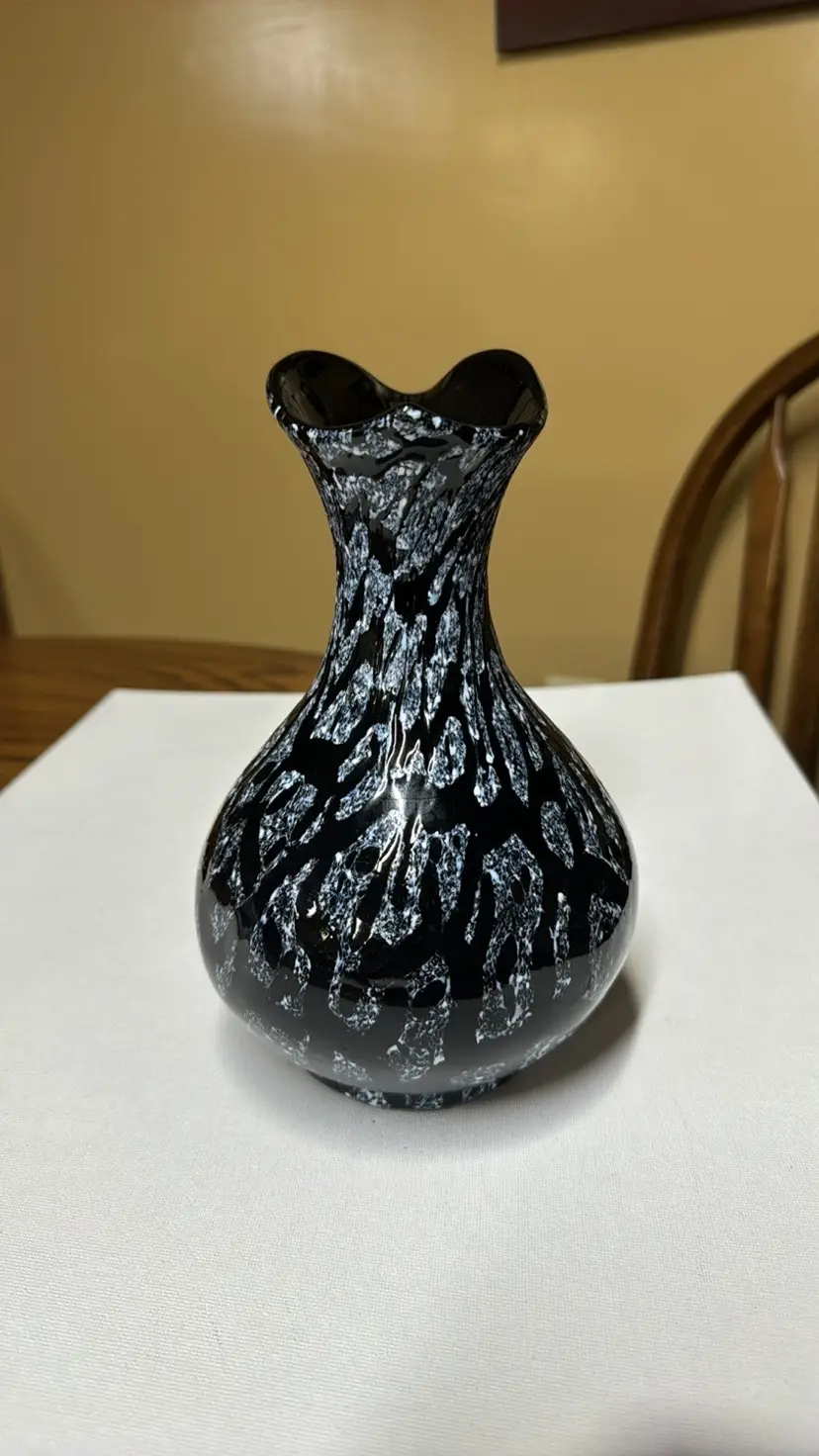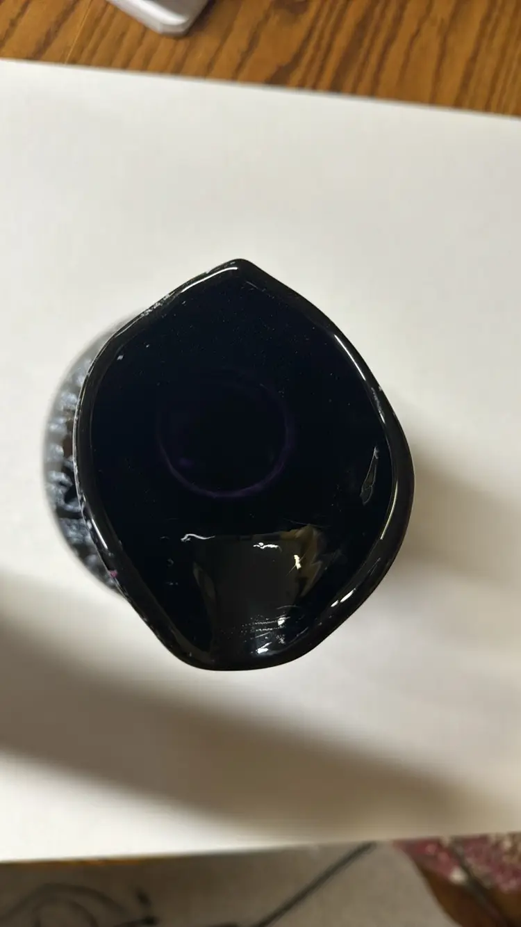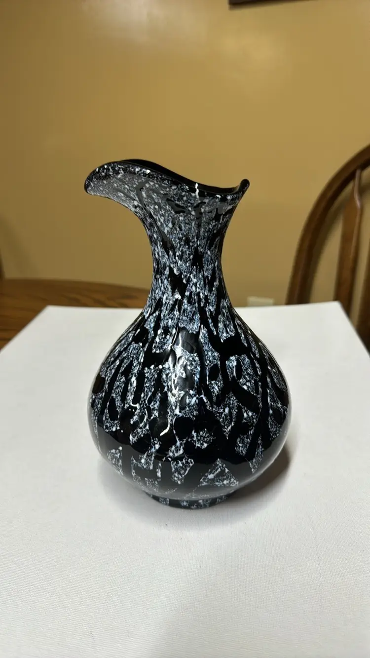 black amethyst hand blown glass with white pitcher or vase No handle 8.5” tall The black is purple when light shines through it Beautiful hand blown glass with no breaks or chips (811202416)