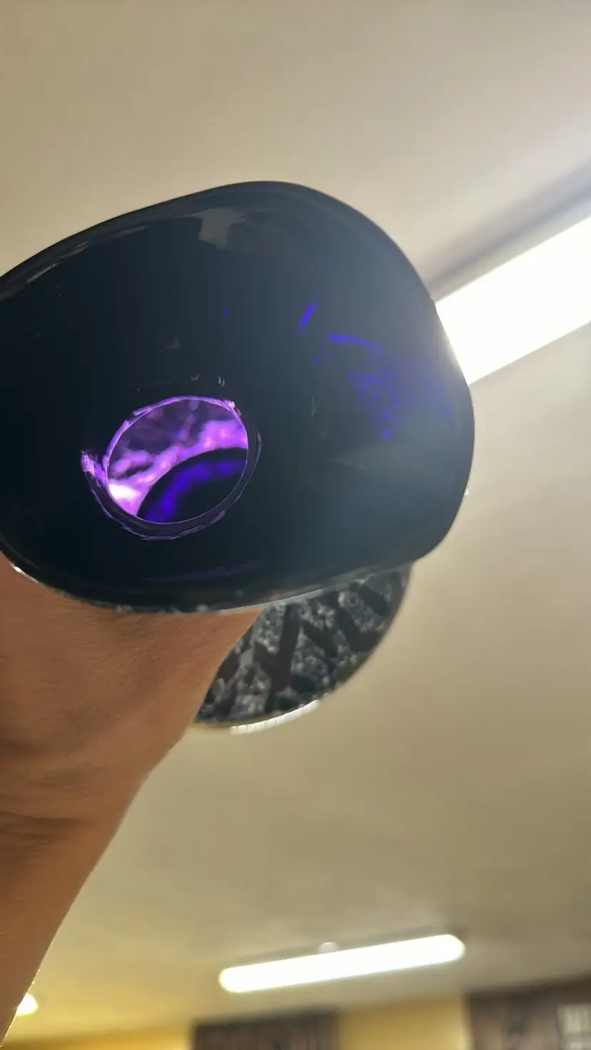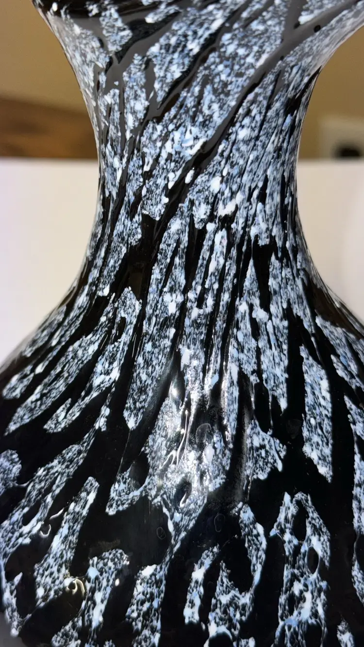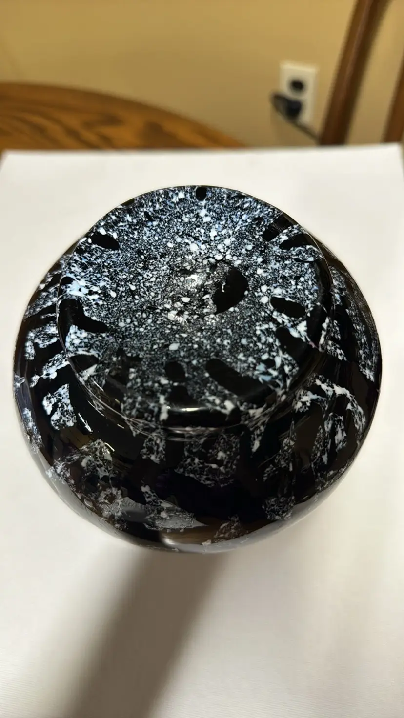 black amethyst hand blown glass with white pitcher or vase No handle 8.5” tall The black is purple when light shines through it Beautiful hand blown glass with no breaks or chips (811202416)