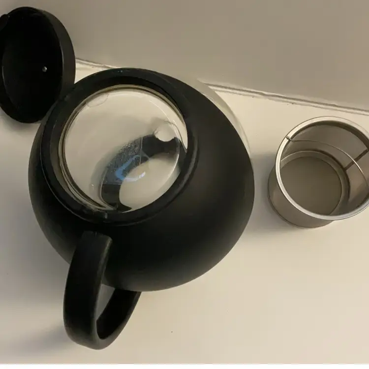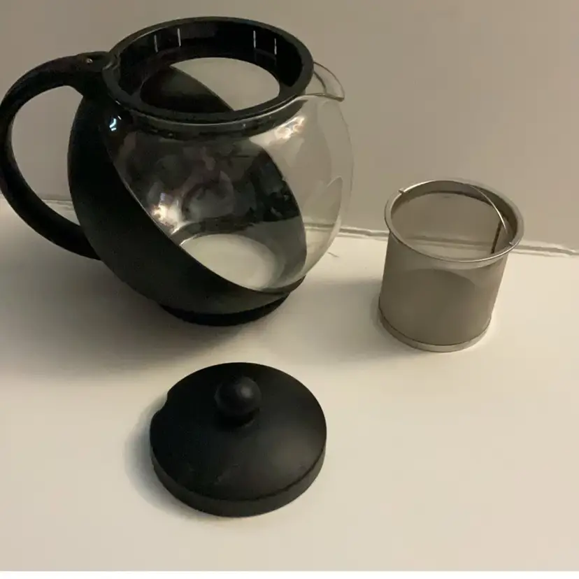 Black plastic surrounds glass fishbowl-like teapot 7” h x 8” w with handle