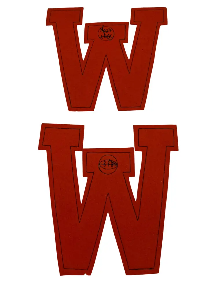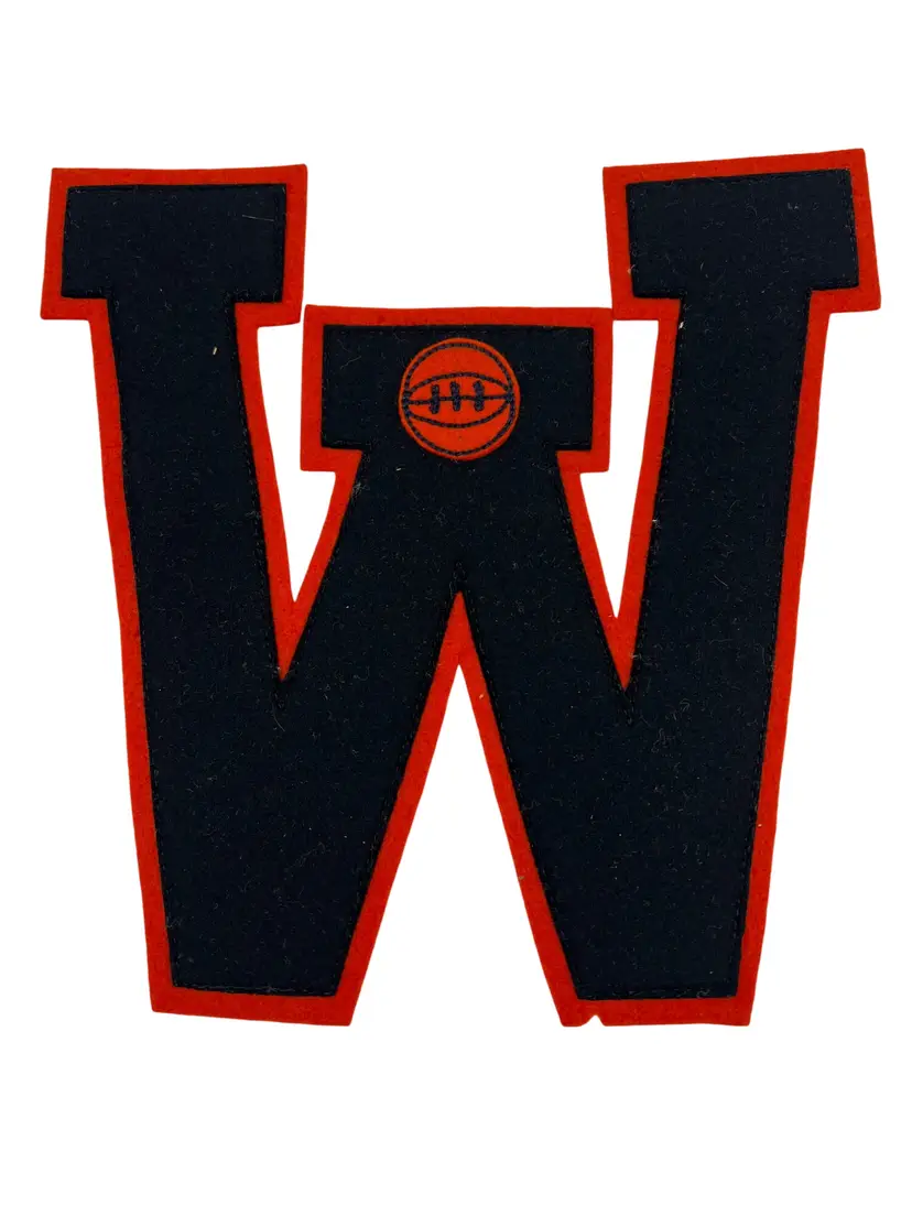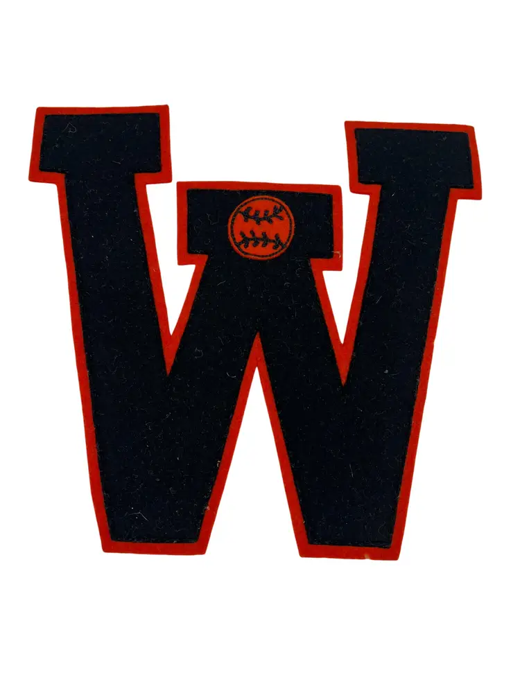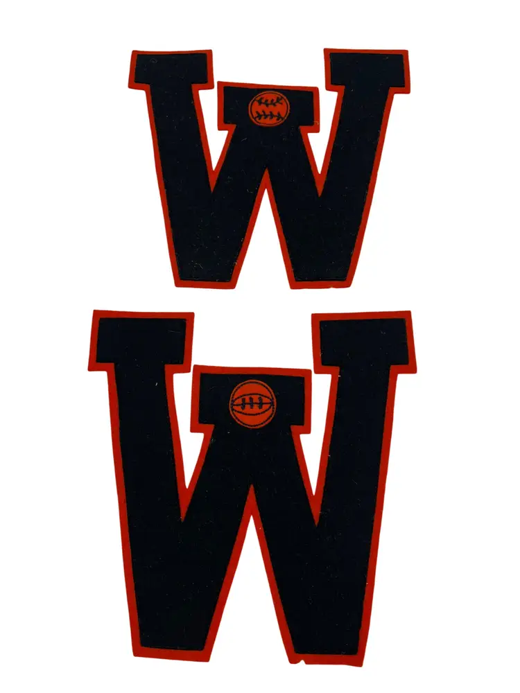 Pair of Black & Orange felt "W" sew-on letters for letter jackets. One is for baseball and the other for football. Each letter is 8" tall. Based on the items they were found with I believe these to be vintage but there are no markings to indicate age or maker.