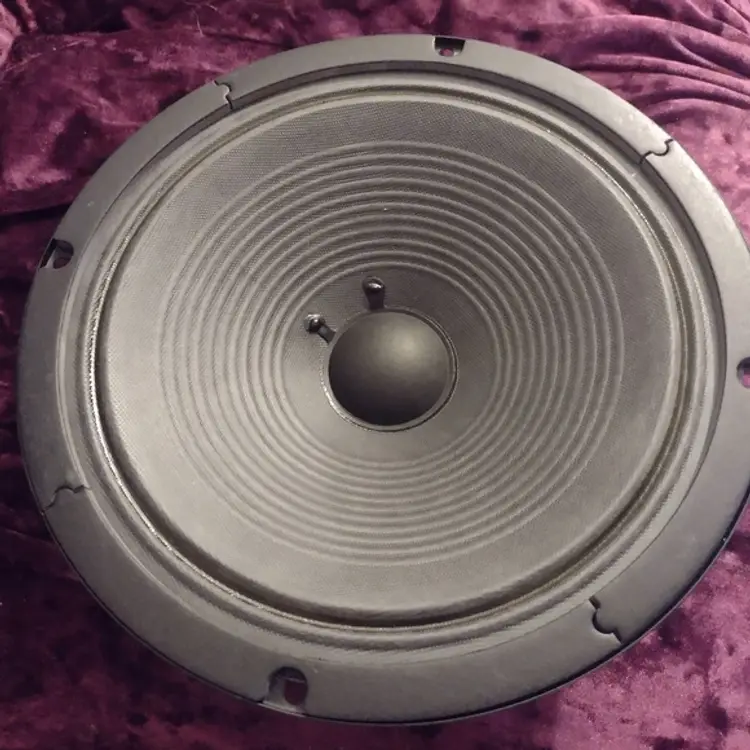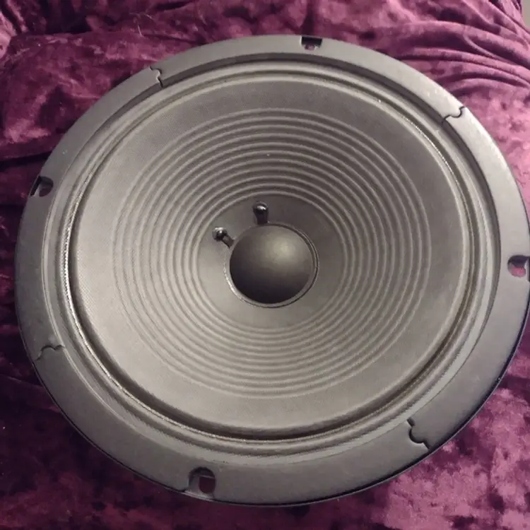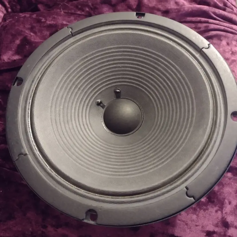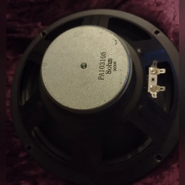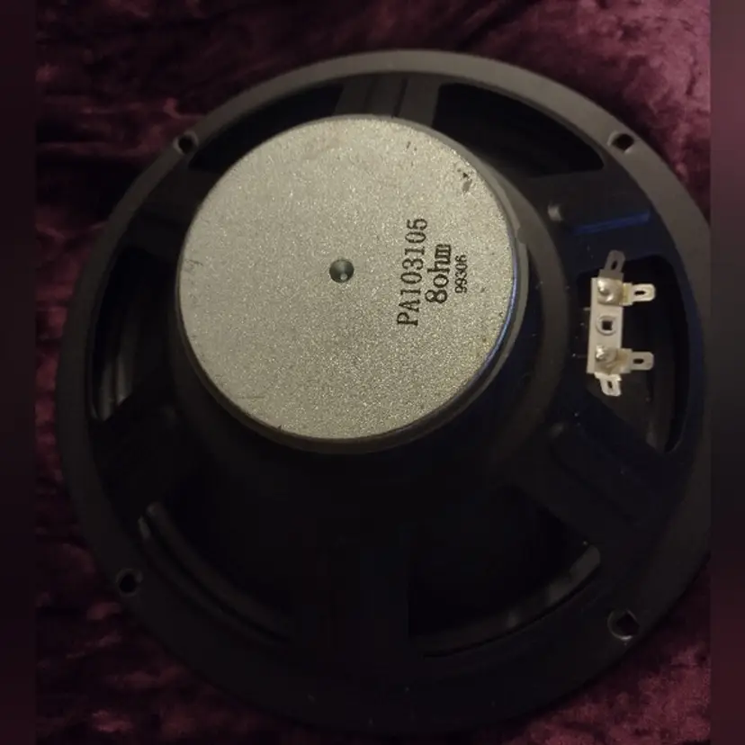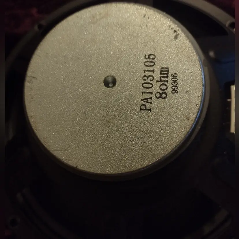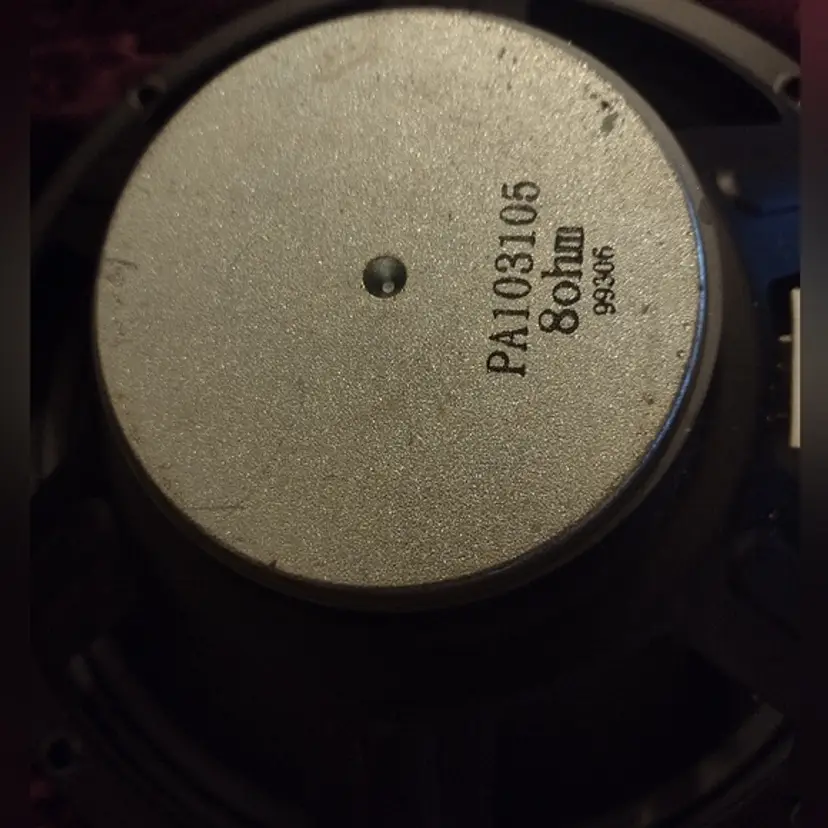 This black and silver audio speaker features a circular design with a flexible black surround and a sturdy black frame. Its medium to large size makes it ideal for delivering powerful sound in various audio setups. The speaker's sleek appearance and robust construction ensure both aesthetic appeal and reliable performance. PA103105 8ohm 99306