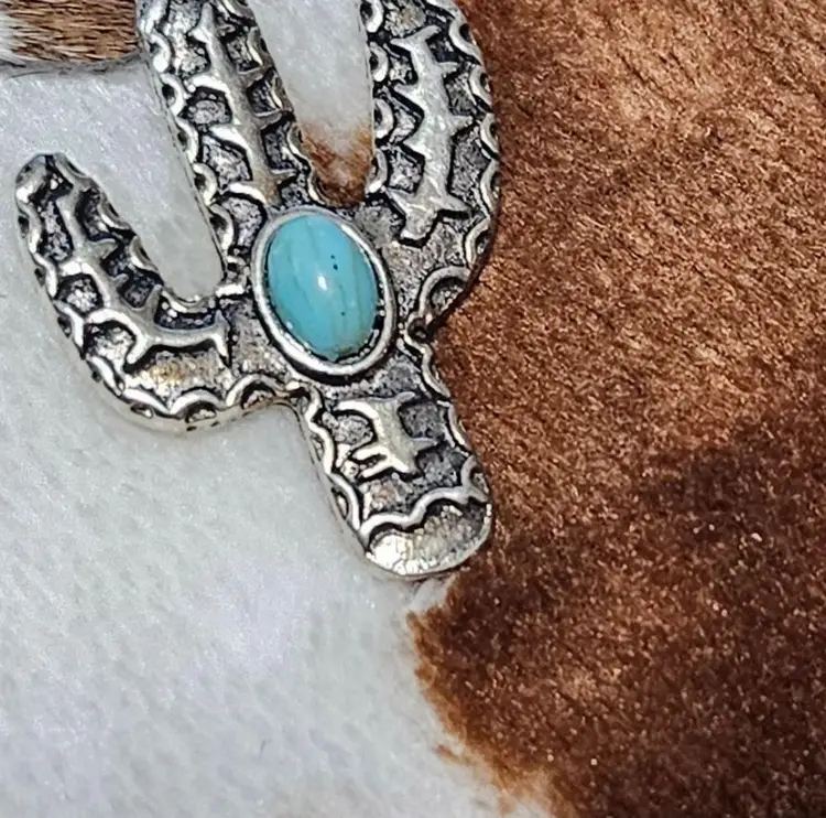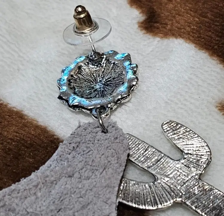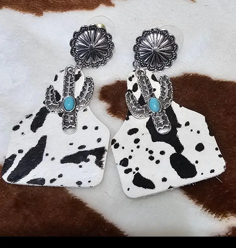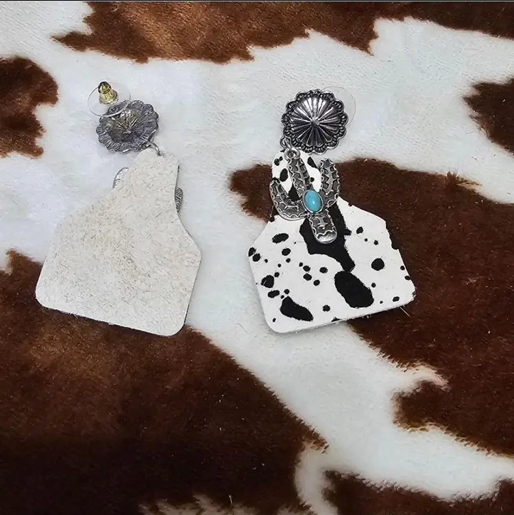 These cuties are made from faux leather, new on earrings card. They are brand new from a smoke-free and pet-free home. Adorable cow tags measure 2.7 inches in height, made with alloy, and turquoise stone on the cactus. They do have a cow texture and some leather smell. These will come on a fine jewelry card, in a clear packaging.