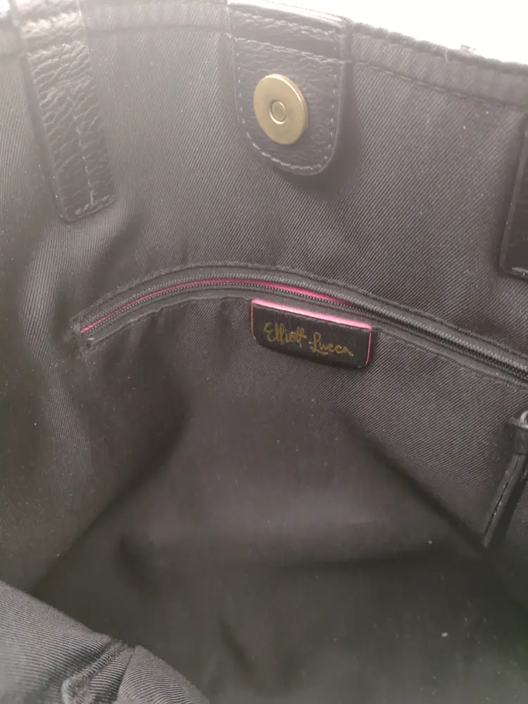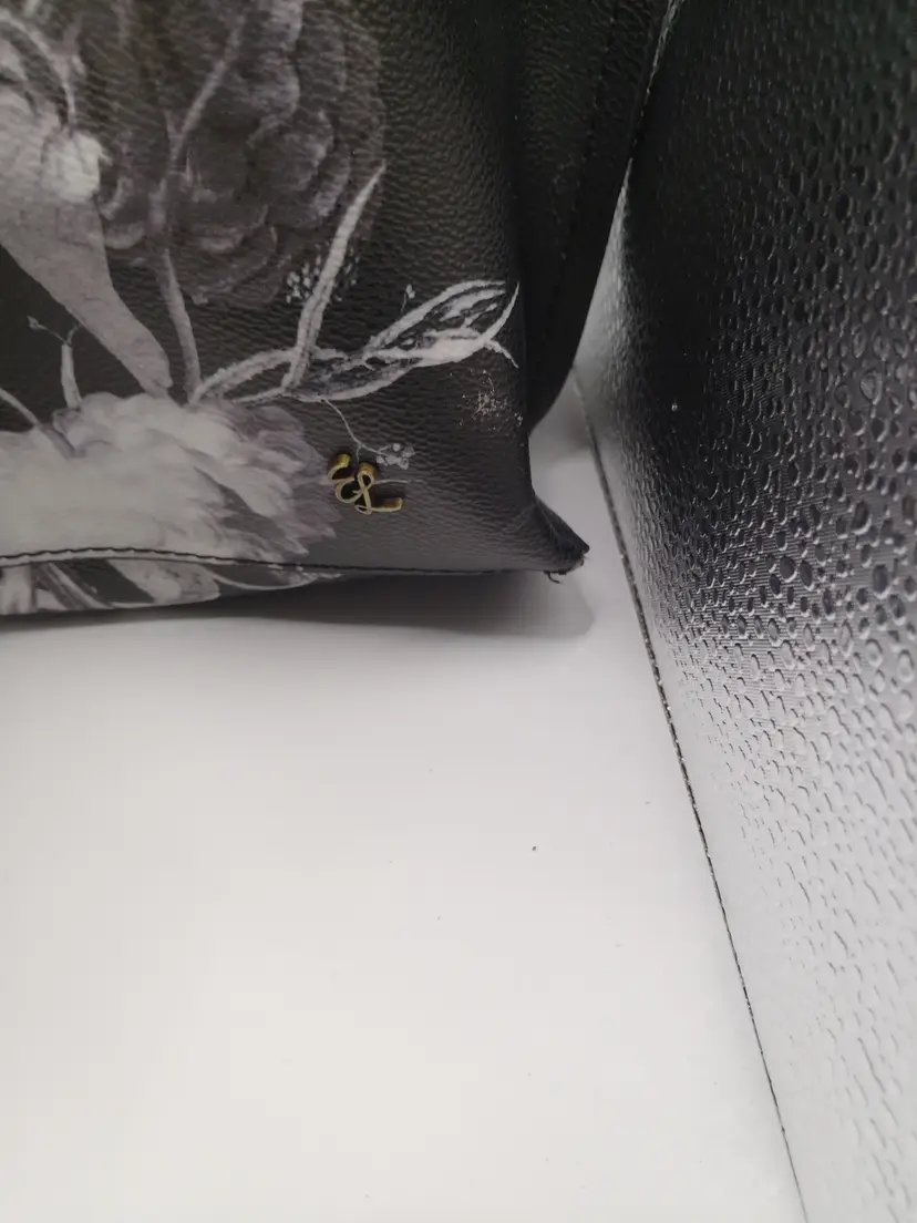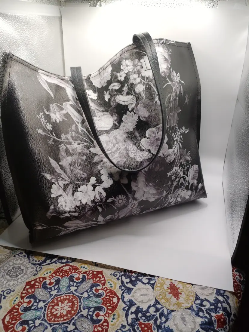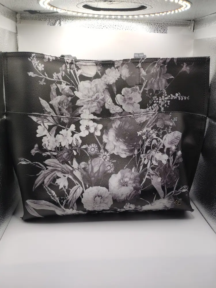 The Black & white Elliott Luca floral shoulder bag is a stylish and spacious tote designed for women. Made of leather with a floral pattern and white shoulder strap, this large tote exudes a trendy black and white color scheme perfect for everyday use. The white hardware adds a touch of elegance to this functional yet fashionable accessory from Elliott Lucca. Ideal for those who appreciate a sophisticated shoulder bag with a playful flower theme.