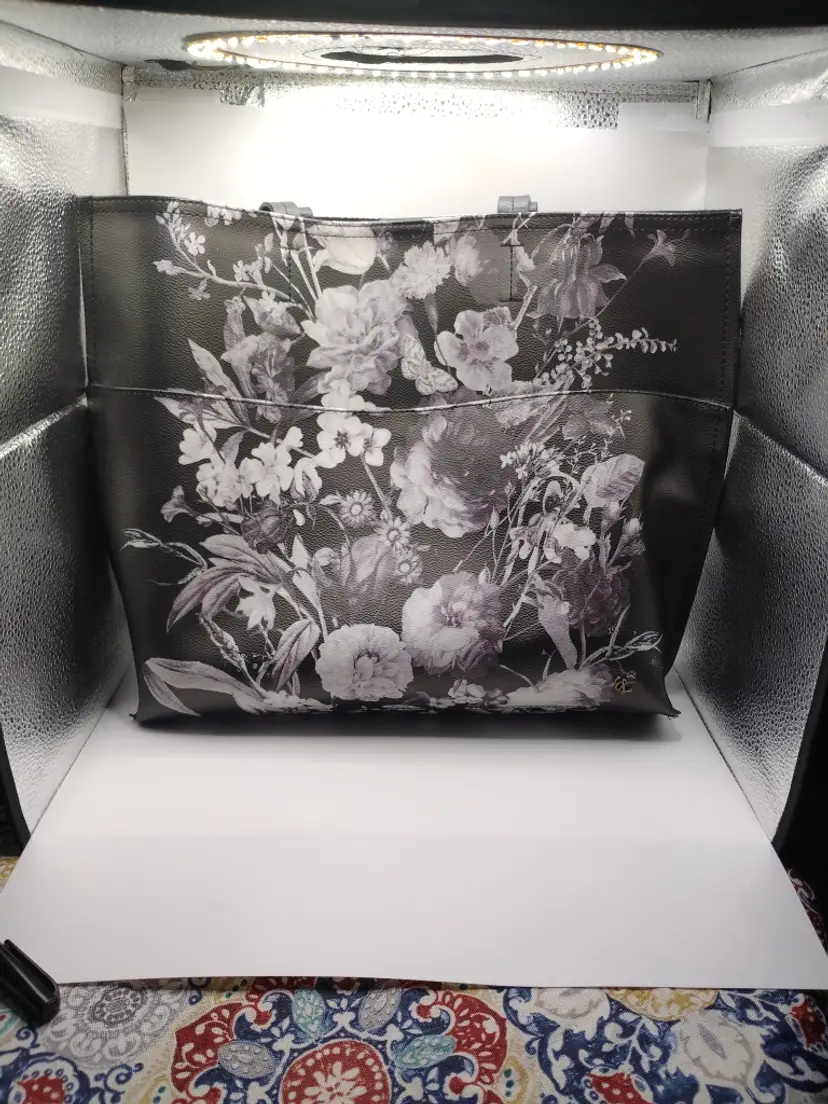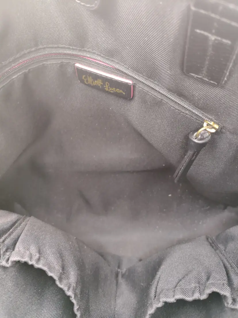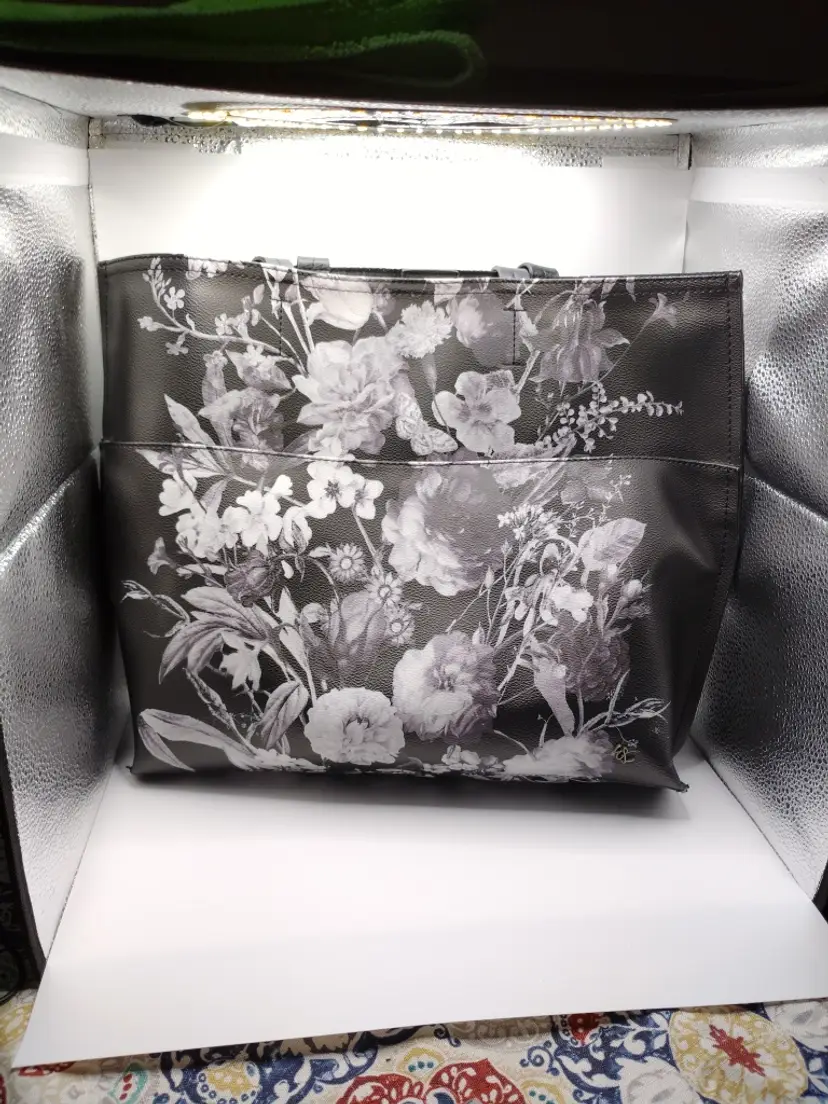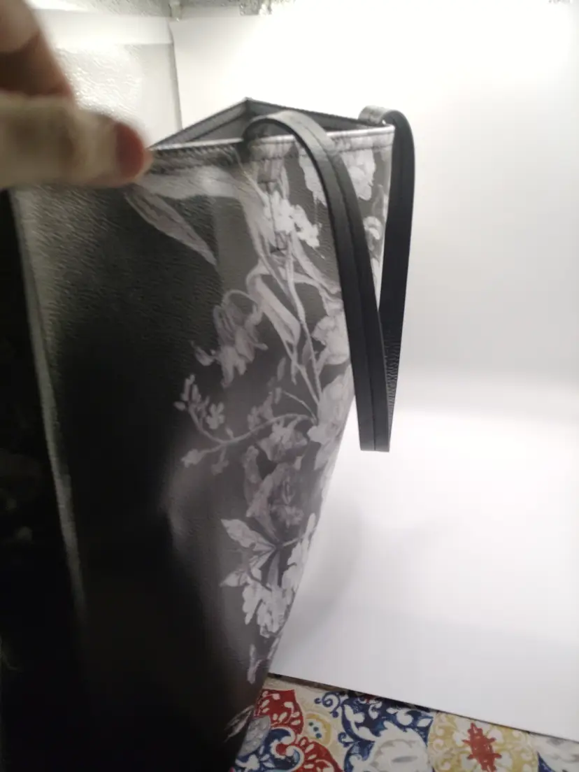 The Black & white Elliott Luca floral shoulder bag is a stylish and spacious tote designed for women. Made of leather with a floral pattern and white shoulder strap, this large tote exudes a trendy black and white color scheme perfect for everyday use. The white hardware adds a touch of elegance to this functional yet fashionable accessory from Elliott Lucca. Ideal for those who appreciate a sophisticated shoulder bag with a playful flower theme.