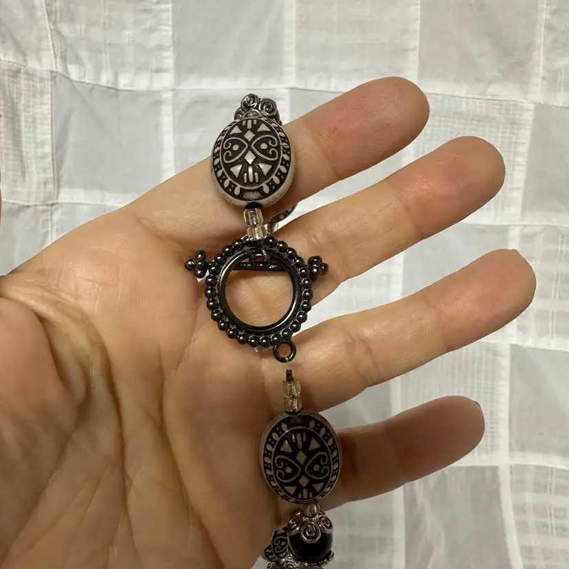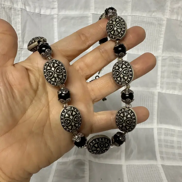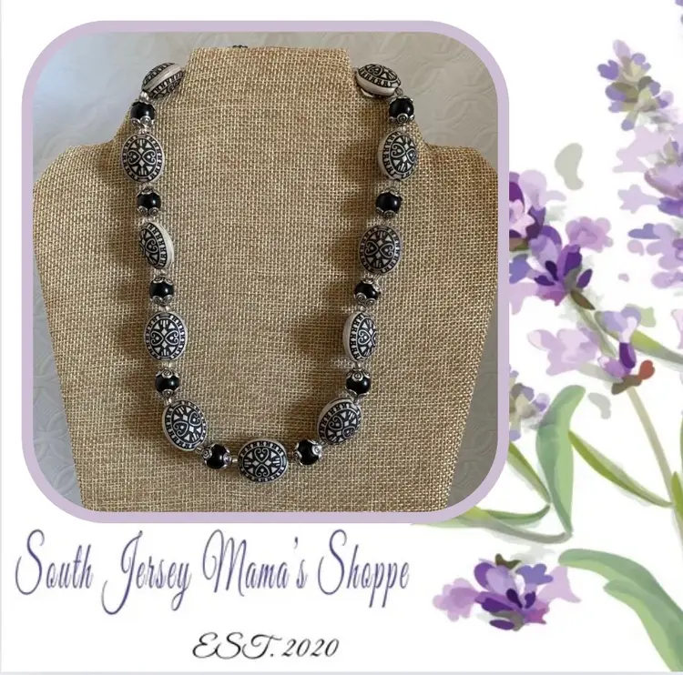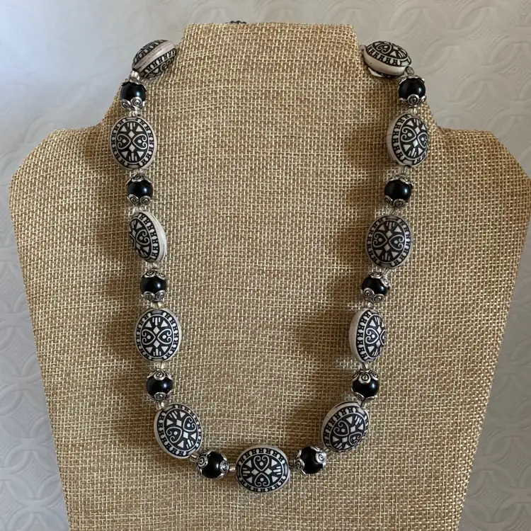 Handmade and in excellent condition. These beads are cool to the touch, and feel like a clay or stone, but I am not 100% sure. They may be a very hard plastic that does a great job imitating stone. Very nice quality either way. 17” clasp to clasp.