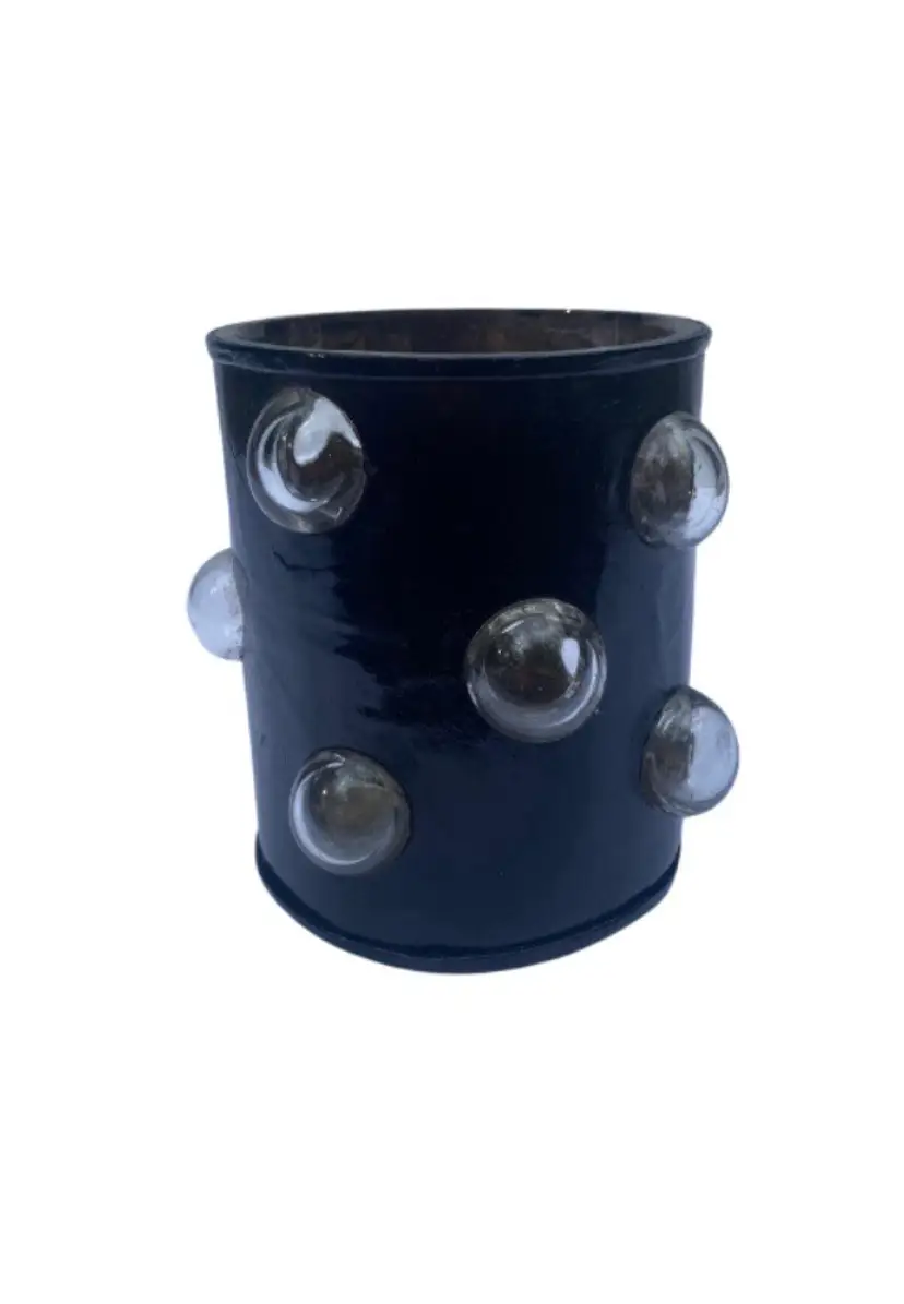 • Handblown black glass • Clear applied bubble detailing • Rustic & imperfect finish • Approx. 1–2 lbs • Stands firmly despite irregular interior Approximately 5” tall.